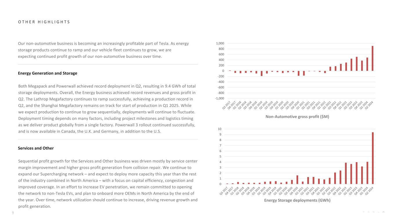 O T H E R H I G H L I G H T S储能部署(GWh)非汽车毛利润(百万美元)我们的非汽车业务正在成为特斯拉日益盈利的一部分。随着储能产品的不断增加和我们车队的不断增长,我们预计随着时间的推移,我们的非汽车业务的利润将持续增长。Energy Generation and Storage Megapack和PowerWall均在Q2实现了创纪录的部署,从而实现了9.4GWh的存储部署总量。总体而言,能源业务在Q2实现了创纪录的收入和毛利润。Lathrop超级工厂继续成功爬坡,在Q2实现了生产记录,上海超级工厂保持在2025年Q1开始生产的轨道上。虽然我们预计产量将继续环比增长,但部署将继续波动。部署时间取决于许多因素,包括项目里程碑和物流时间,因为我们从一家工厂向全球交付产品。Powerwall 3的推出继续取得成功,现已在加拿大、英国和德国推出,此外,美国服务和其他服务和其他业务的连续利润增长主要是由服务中心利润率改善和碰撞修复产生的更高毛利润推动的。我们继续扩大我们的超级充电网络——预计今年部署的容量将超过北美其他行业的总和——重点是资本效率、拥堵和改善覆盖范围。为了努力提高电动汽车渗透率,我们仍然致力于向非特斯拉电动汽车开放网络,并计划在年底前在北美加入更多的主机厂。随着时间的推移,网络利用率应该会继续提高,从而推动收入增长和利润产生。9 0 1 2 3 4 5 6 7 8 9 10 -1,000 -800 -600 -400 -200 0 200 400 600 800 1,000
