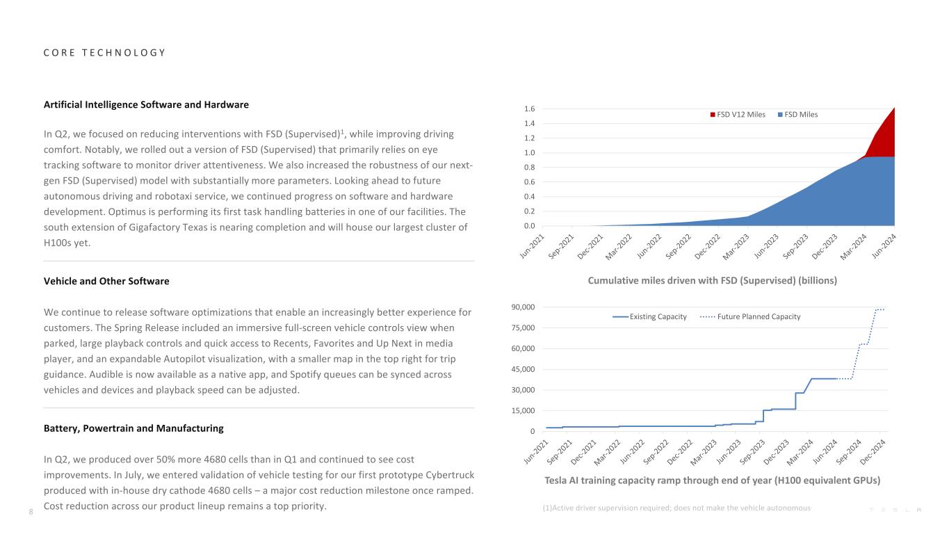 特斯拉 AI培训能力爬坡至年底(H100等效GPU)C O R E T E C H N O L O G Y使用FSD(受监管)(十亿)人工智能软硬件驾驶的累计里程在Q2,我们重点关注使用FSD(受监管)1减少干预,同时提高驾驶舒适度。值得注意的是,我们推出了一个版本的FSD(Supervised),主要依靠眼球追踪软件来监测驾驶员的注意力。我们还增加了具有更多参数的下一代FSD(受监管)模型的鲁棒性。展望未来的自动驾驶和robotaxi服务,我们在软件和硬件开发方面继续取得进展。擎天柱正在我们的一个设施中执行其处理电池的第一项任务。Gigafactory Texas的南延伸部分已接近完成,将容纳我们迄今为止最大的H100集群。车辆和其他软件我们继续发布软件优化,为客户提供越来越好的体验。春季发布包括一个沉浸式全屏车辆控制视图当停车,大的播放控制和快速访问Recents,Favorites和媒体播放器中的Up Next,以及一个可扩展的自动驾驶可视化,在右上角有一个更小的地图,用于旅行指导。Audible现在可以作为原生应用程序使用,Spotify队列可以跨车辆和设备同步,播放速度可以调整。电池、动力总成和制造在Q2,我们生产的4680电池比Q1多出50%,并继续看到成本改善。今年7月,我们对使用内部干式阴极4680电池生产的首款原型Cybertruck进行了车辆测试验证——这是一个重大的成本降低里程碑,一度达到顶峰。降低我们整个产品阵容的成本仍然是首要任务。80.0 0.2 0.4 0.6 0.8 1.0 1.2 1.4 1.6 FSD V12里程FSD里程015,00030,00045,00060,00075,00090,000现有产能未来计划产能(1)需要积极的驾驶员监督;不会使车辆自动驾驶。