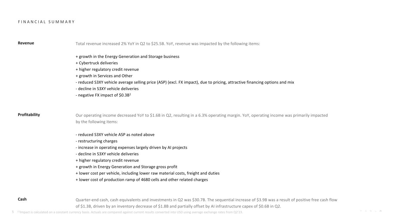 F I N A N C I A L S U M M A R Y收入Q2总收入同比增长2%至$ 25.5B。同比,收入受到以下项目的影响:+能源发电和存储业务的增长+ Cybertruck交付+更高的监管信贷收入+服务和其他-降低的S3XY车辆平均售价(ASP)(不包括。外汇影响),由于定价、有吸引力的融资选择和组合-S3XY车辆交付量下降-0.3B1美元盈利能力的负面外汇影响我们的营业收入在第二季度同比下降至1.6B美元,导致营业利润率为6.3%。同比,营业收入主要受到以下项目的影响:-如上所述,S3XY车辆ASP降低-重组费用-运营费用增加主要由人工智能项目推动-S3XY车辆交付量下降+监管信贷收入增加+能源发电和存储毛利润增长+每辆车成本下降,包括原材料成本、运费和关税下降+生产成本下降4680电池片和其他相关费用减少现金季度末现金,第二季度现金等价物和投资为$ 30.7B。环比增加$ 3.9B是由于正的自由现金流为$ 1.3B,这是由$ 1.8B的库存减少推动的,部分被第二季度$ 0.6B的人工智能基础设施资本支出所抵消。5(1)影响按固定货币计算。实际值与当前使用Q2’23的平均汇率换算成美元的结果进行比较。