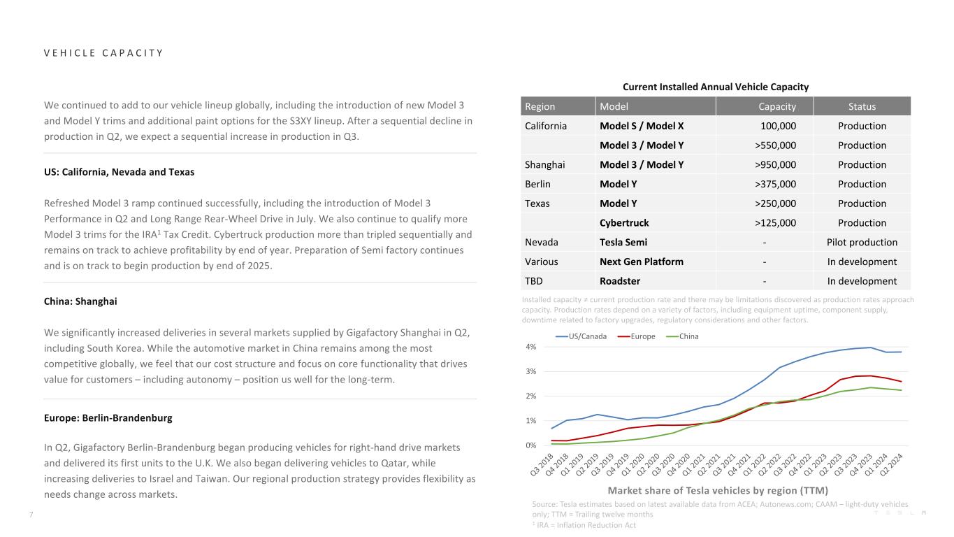 V E H I C L E C A P A C I T Y目前装机年产能地区车型产能状态加州Model S/Model X100万产Model 3/Model Y > 55万产上海Model 3/Model Y > 95万产柏林Model Y > 37.5万产德州Model Y > 25万产Cybertruck > 12.5万产内华达州特斯拉 Semi-试产各种下一代平台-在研待定Roadster-在研装机量≠目前的产能,随着产能的接近,可能会发现一些局限性。生产率取决于多种因素,包括设备正常运行时间、组件供应、与工厂升级相关的停机时间、监管考虑和其他因素。按地区划分的特斯拉汽车市场份额(TTM)来源:特斯拉根据ACEA最新可用数据估算;Autonews.com;CAAM –仅限轻型汽车;TTM =过去十二个月1 IRA =通胀降低法案我们继续在全球范围内增加我们的车辆阵容,包括引入新的Model 3和Model Y内饰以及为S3XY阵容提供额外的油漆选项。在Q2产量环比下降后,我们预计Q3产量将环比增长。美国:加利福尼亚州、内华达州和德克萨斯州更新的Model 3坡道继续成功,包括在Q2引入Model 3性能,并在7月引入远程后轮驱动。我们还将继续让更多Model 3饰条获得IRA1税收抵免资格。Cybertruck的产量环比增长了两倍多,仍有望在年底实现盈利。Semi工厂的准备工作仍在继续,并有望在2025年底开始生产。中国:上海我们在第二季度大幅增加了上海超级工厂供应的几个市场的交付量,包括韩国。虽然中国的汽车市场在全球范围内仍然是竞争最激烈的市场之一,但我们认为,我们的成本结构和对推动客户价值的核心功能的关注——包括自主性——使我们处于长期有利地位。欧洲:柏林-勃兰登堡第二季度,Gigafactory Berlin-Brandenburg开始为右驾市场生产车辆,并向英国交付了首批车辆。我们还开始向卡塔尔交付车辆,同时增加向以色列和台湾的交付。随着不同市场的需求发生变化,我们的区域生产战略提供了灵活性。70% 1% 2% 3% 4%美国/加拿大欧洲中国