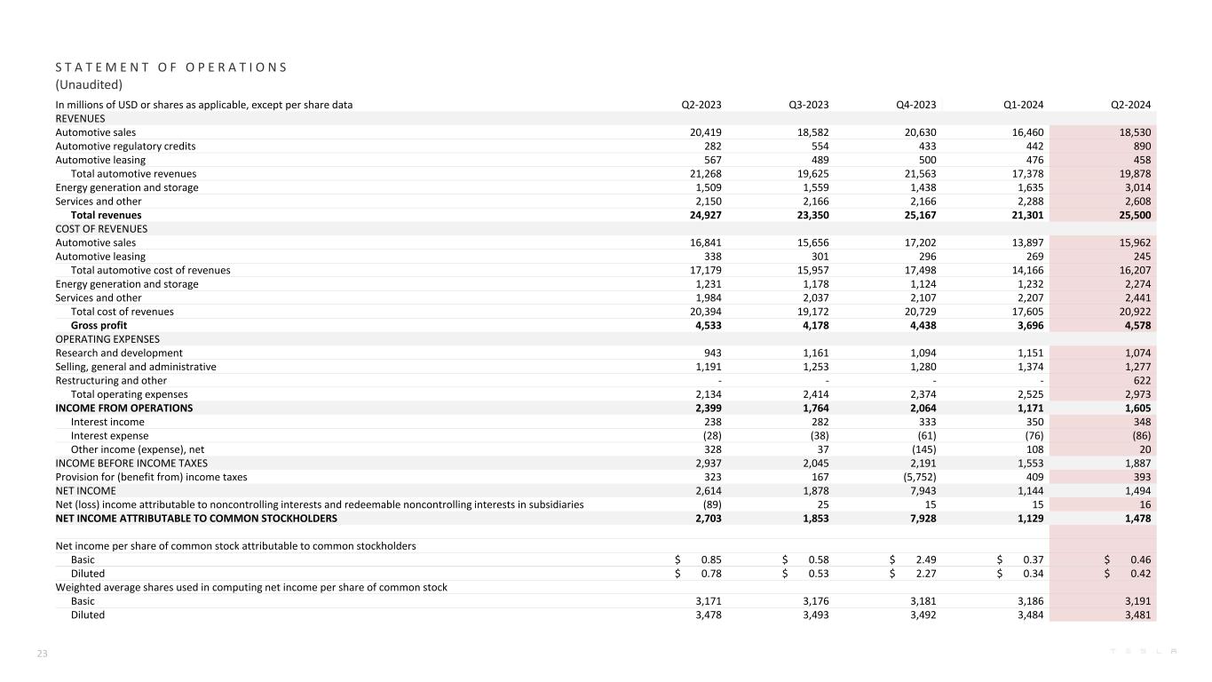 以百万美元或适用的股份为单位,每股数据除外Q2-2023 Q3-2023 Q4-2023 Q1-2024 Q2-2024收入汽车销售20,41918,58220,63016,46018,530汽车监管信用28 2554433442890汽车租赁567489500476458汽车总收入21,26819,62521,56317,37819,878能源生产和存储1,5091,5591,4381,6353,014服务和其他2,1502,1662,1662,2882,608总收入24,92723,35025,16721,30125,500收入成本汽车销售16,84115,65617,20213,89715,962汽车租赁338301296269245汽车总收入成本17,17915,95717,49814,及储存1,2311,1781,1241,2322,274服务及其他1,9842,0372,1072,2072,441 总收入成本 20,39419,17220,72917,60520,922毛利润4,5334,1784,4383,6964,578营业费用研发9431,1611,0941,1511,074销售、一般及行政1,1911,2531,2801,3741,277重组及其他----622营业费用总额2,1342,4142,3742,5252,973营业收入2,3991,7642,0641,1711,605利息收入23828233350348利息支出(28)(38)(61)(76)(86)其他收入(费用),净收入32837(145)10820所得税前收入2,9372,0452,1911,5531,887所得税拨备(受益)323167(5,752)409393净收入2,6141,8787,9431,1441,494归属于非控股权益的净(亏损)收入和子公司的可赎回非控制性权益(89)25151516归属于普通股东的净收入2,7031,8537,9281,1291,478归属于普通股股东的每股普通股净收入基本$ 0.85 $ 0.58 $ 2.49 $ 0.37 $ 0.46摊薄后$ 0.78 $ 0.53 $ 2.27 $ 0.34 $ 0.42用于计算每股普通股净收入的加权平均股份基本3,1713,1763,1813,1863,191摊薄3,4783,4933,4843,481 S T A T E M E N T O F O P E R A T I O NS(未经审核)23