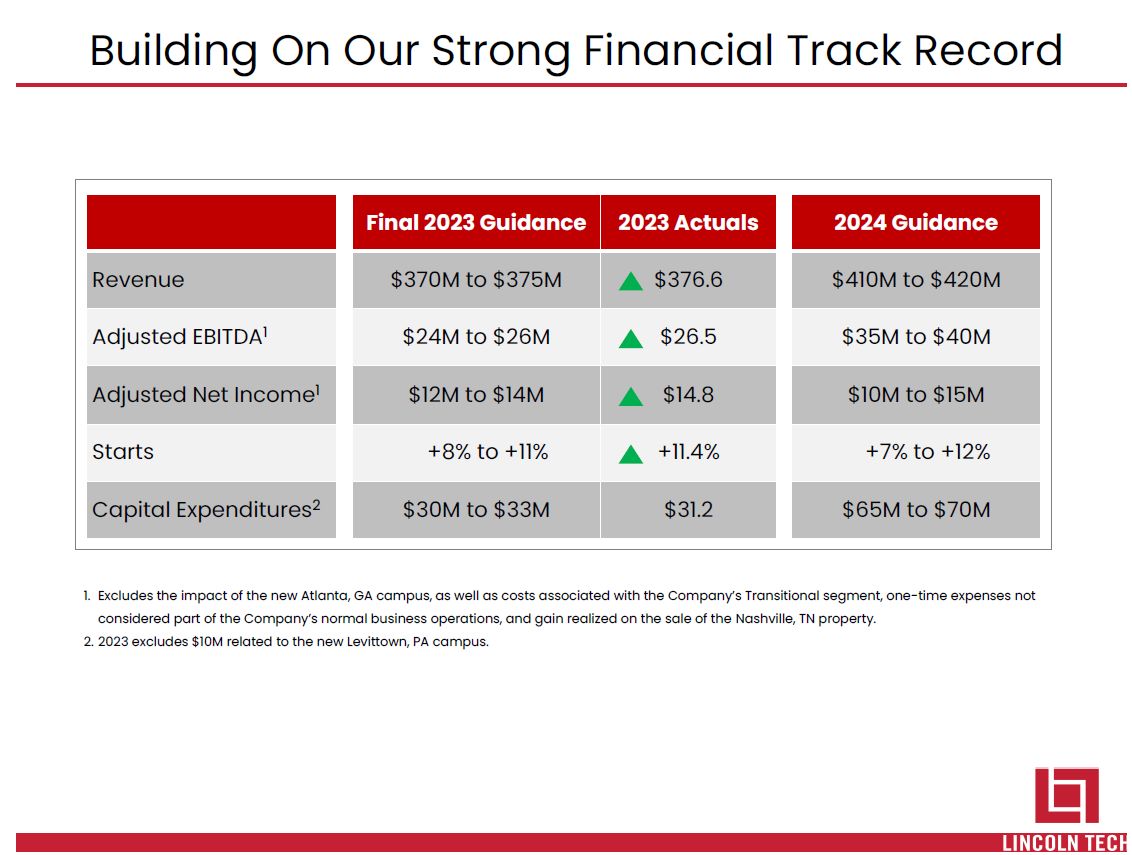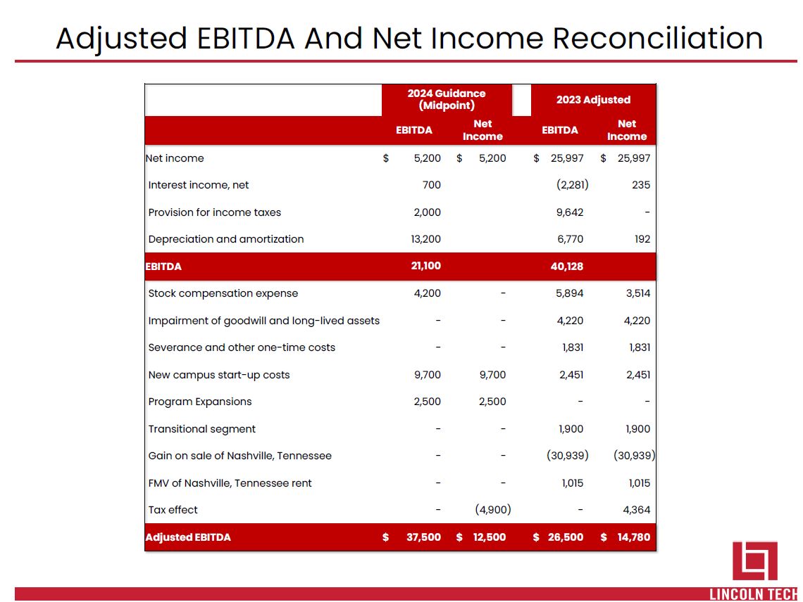 调整后EBITDA和净收入调节2024年指导(中点)2023年调整后EBITDA净收入EBITDA净收入净收入5,200美元5,200美元25,997美元25,997美元利息收入,净额700(2,281)235所得税拨备2,0009,642-折旧和摊销13,2006,770192 EBITDA 21,10040,128股票补偿费用4,200-5,8943,514商誉和长期资产减值--4,2204,220遣散费和其他一次性费用--1,8311,831新校区开办费用9,7009,700 2,4512,451项目扩展2,5002,500--过渡部分--1,9001,900出售田纳西州纳什维尔收益--(30,939)(30,939)纳什维尔FMV,田纳西州租金--1,0151,015税收影响-(4,900)-4,364调整后EBITDA $ 37,500 $ 12,500 $ 26,500 $ 14,780