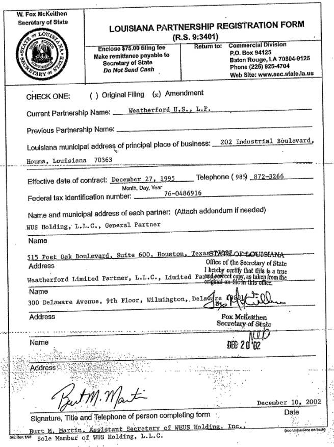 W. Fox McKeithen Secretary of State LOUISIANA PARTNERSHIP REGISTRATION FORM (R.S. 9:3401) Enclose $75.00 filing fee Return to: Commercial Division Make remittance payable to P.O. Box 94125 Secretary of State Baton Rouge, LA 70804-9125 Do Not Send Cash Phone (225) 925-4704 Web Site: www.sec.state.la.us CHECK ONE: ( ) Original Filing ( ) Amendment Current Partnership Name: Weatherford U.S., L.P. Previous Partnership Name: Louisiana municipal address of principal place of business: 202 Industrial Boulevard, Houma, Louisiana 70363 Effective date of contract: December 27, 1995 Telephone (985) 872-3266 Month, Day, Year Name and municipal address of each partner: (Attach addendum if needed) WUS Holding, L.L.C., General Partner Name 515 Post Oak Boulevard, Suite ^00, Houston, Texas 77027 Address Weatherford Limited Partner, L.L.C., Limited Partner Name 300 Delaware Avenue, 9th Floor, Wilmington, Delaware 19801 Address Name Address December 10, 2002 Signature, Title and Telephone of person completing form Date Burt M. Martin, Assistant Secretary of WEUS Holding, Inc., Sole Member of WUS Holding, L.L.C.