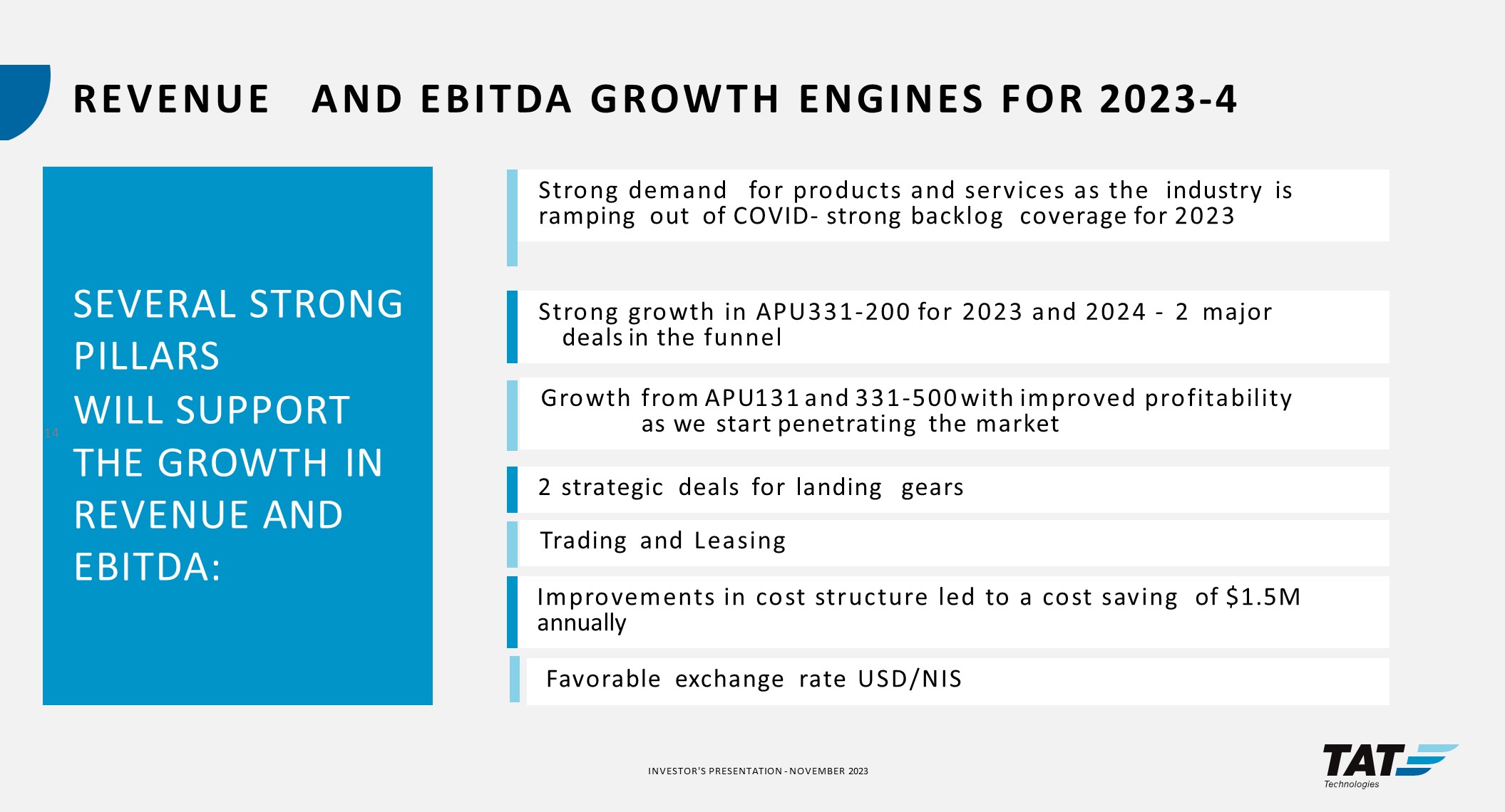 2023-4年收入和EBITDA增长引擎强劲的产品和服务需求,因为该行业正在逐步摆脱2023年COVID-强劲的积压覆盖2023年和2024年APU331-200的强劲增长-随着我们开始打入市场,从APU131和331-500开始的漏斗增长中有2笔重大交易,随着我们开始打入市场,盈利能力有所提高2笔起落架贸易和租赁战略交易成本结构的改善导致每年节省150万美元的成本有利汇率美元/新台币投资者的介绍-2023年11月几个强劲支柱将支持收入和EBITDA的增长:14