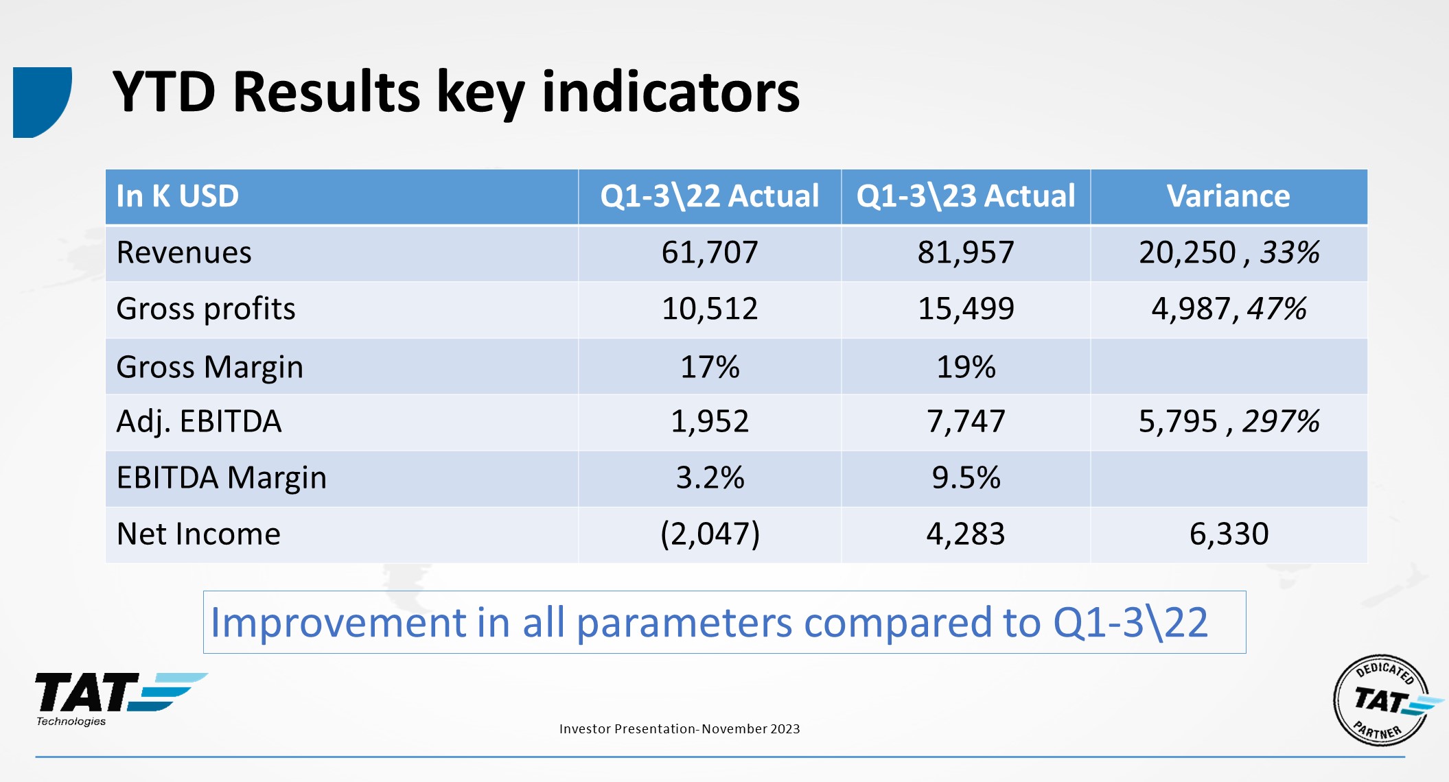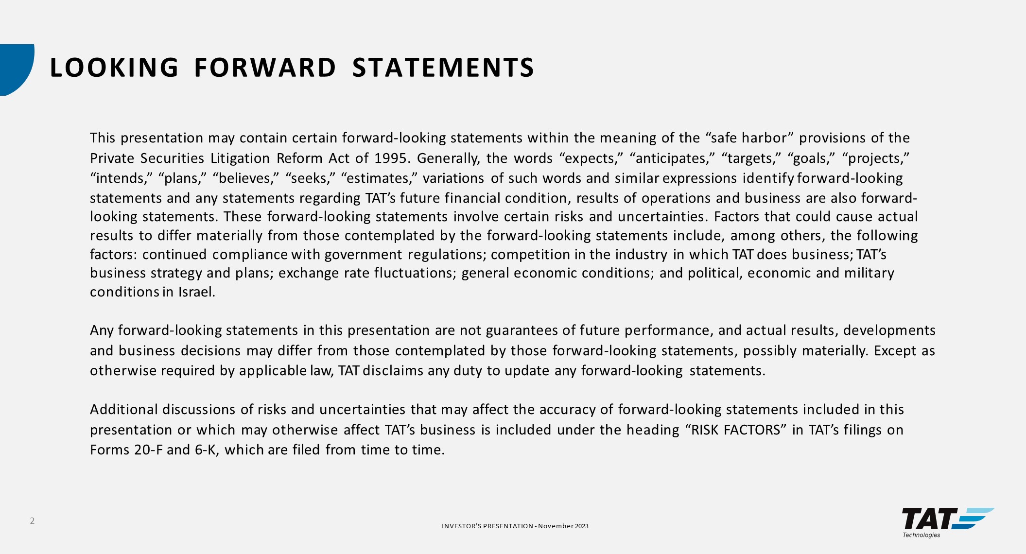 前瞻性陈述本演示文稿可能包含1995年《私人证券诉讼改革法案》“安全港”条款含义内的某些前瞻性陈述。一般来说,“预期”、“预期”、“目标”、“目标”、“项目”、“打算”、“计划”、“相信”、“寻求”、“估计”等词语的变体和类似表达方式可识别前瞻性陈述,任何有关TAT未来财务状况、经营业绩和业务的陈述也属于前瞻性陈述。这些前瞻性陈述涉及一定的风险和不确定性。可能导致实际结果与前瞻性陈述所设想的结果存在重大差异的因素,除其他外,包括以下因素:持续遵守政府法规;TAT开展业务所在行业的竞争;TAT的业务战略和计划;汇率波动;总体经济状况;以及以色列的政治、经济和军事状况。本演示文稿中的任何前瞻性陈述都不是对未来业绩的保证,实际结果、发展和业务决策可能与这些前瞻性陈述所设想的不同,可能存在重大差异。除适用法律另有要求外,TAT不承担更新任何前瞻性陈述的义务。关于可能影响本演示文稿中包含的前瞻性陈述的准确性或可能影响TAT业务的风险和不确定性的额外讨论包含在TAT不时提交的20-F和6-K表格文件的“风险因素”标题下。2投资者介绍-2023年11月