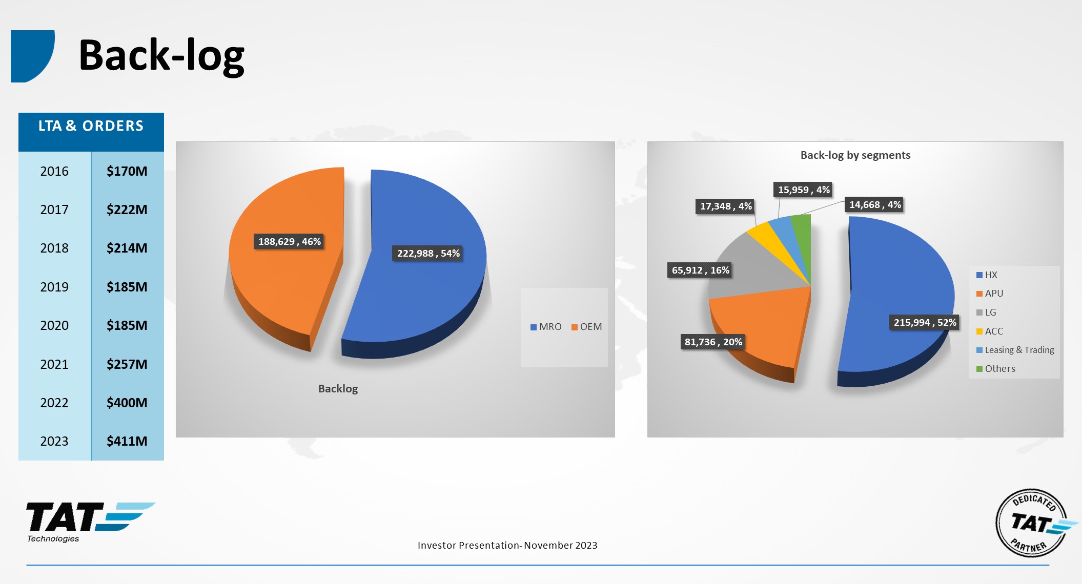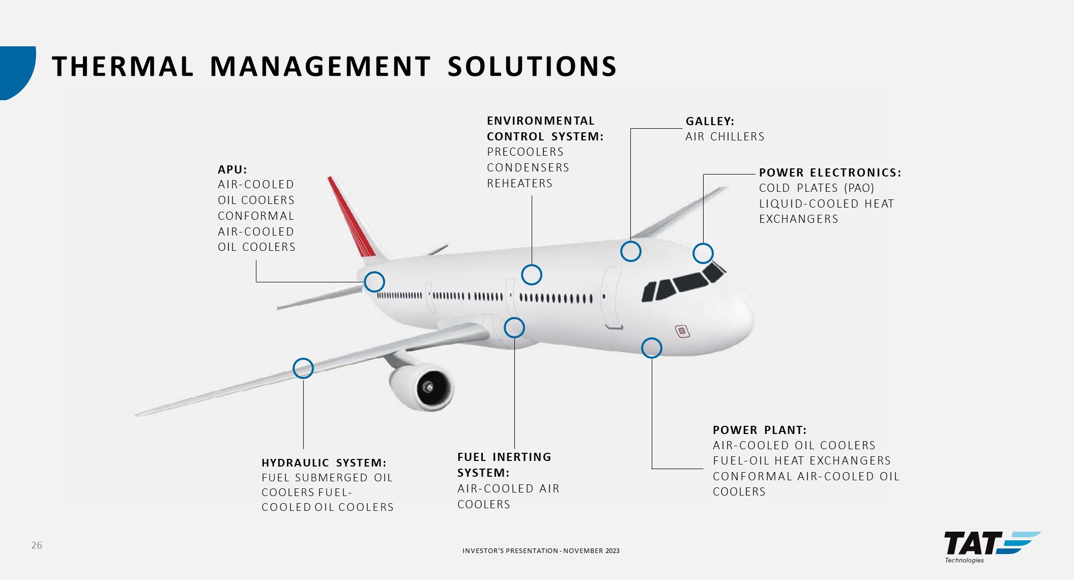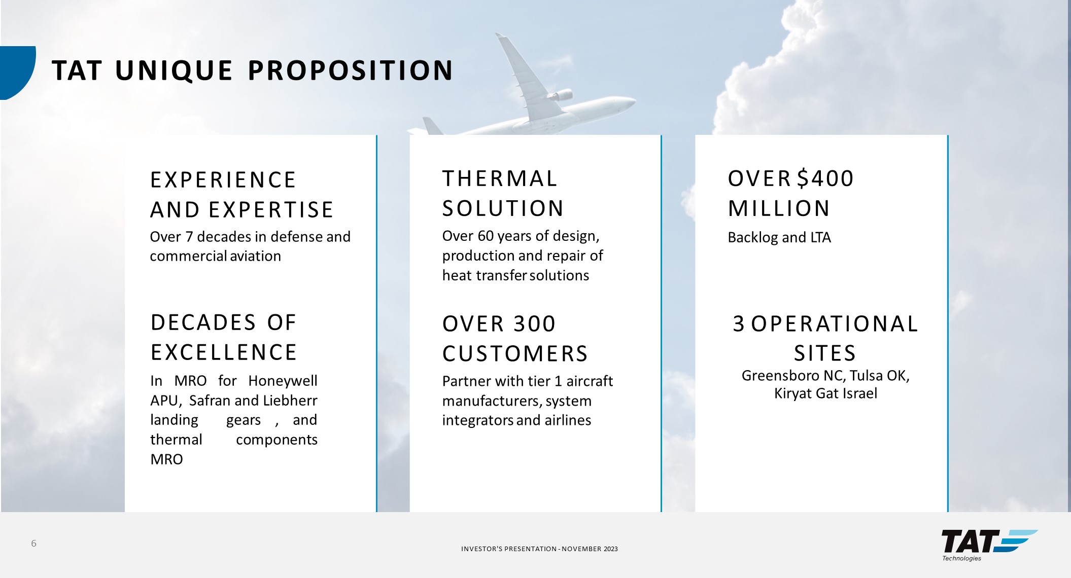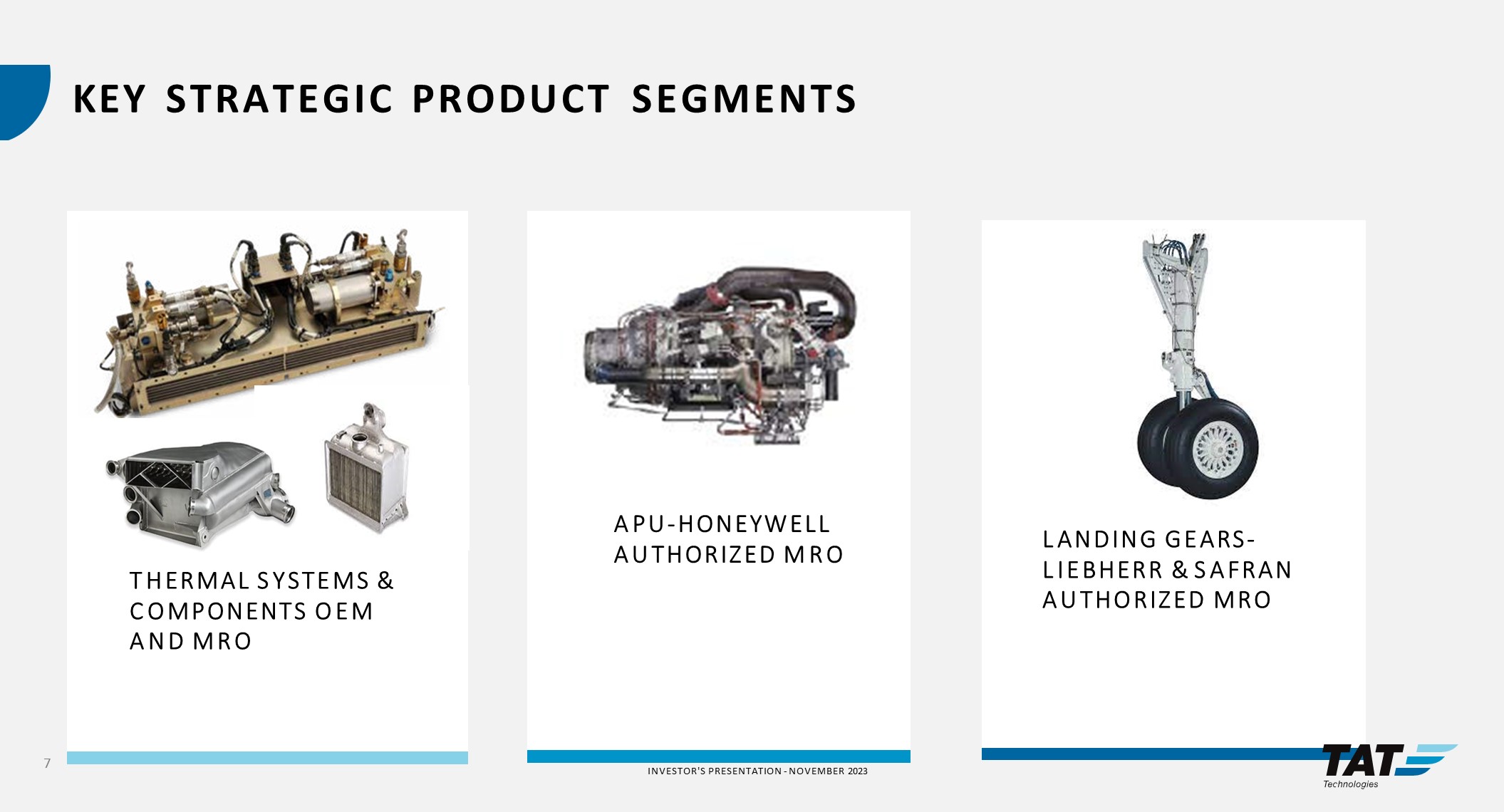 TAT独特的提案经验和专业知识超过7年的国防和商业航空热解决方案超过60年的设计、生产和维修传热解决方案超过4亿美元的积压和LTA3的运营地点Greensboro NC、Tulsa OK、Kiryat Gat以色列数十年来在用于霍尼韦尔 APU、Safran和Liebherr起落架的MRO方面的卓越表现,以及超过300名客户的热组件MRO与一级飞机制造商、系统集成商和航空公司合作6投资者介绍-2023年11月