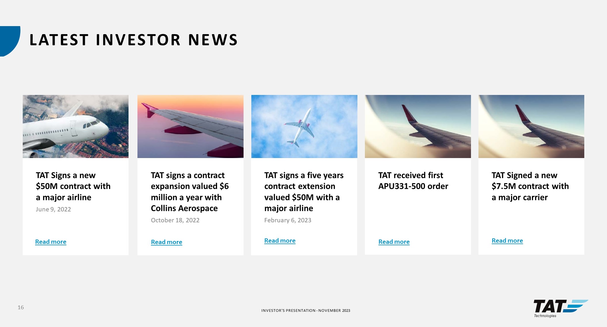 最新投资者新闻16日投资者介绍-2023年11月TAT与一家大型航空公司签署5000万美元的新合同2022年6月9日TAT与柯林斯航空航天公司签署价值每年600万美元的合同扩展2022年10月18日TAT与一家大型航空公司签署价值5000万美元的五年合同延期2023年2月6日TAT收到第一笔APU331-500订单TAT与一家大型航空公司签署了一份价值750万美元的新合同更多阅读更多阅读更多阅读更多阅读更多