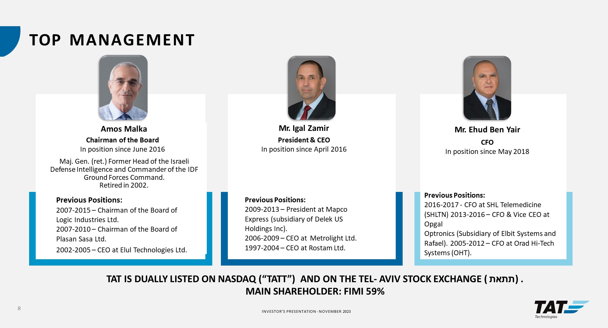 最高管理层历任职务:2007-2015 – Logic Industries Ltd.董事会主席2007-2010 – Plasan Sasa Ltd.董事会主席2002-2005 – Elul Technologies Ltd.首席执行官。历任职务:2009-2013 – Mapco Express(Delek US Holdings Inc的子公司)总裁。2006-2009 – Metrolight Ltd.首席执行官1997-2004 – Rostam Ltd.首席执行官。历任职位:2016-2017-2013-2016年SHL Telemedicine(SHLTN)首席财务官– Opgal Optronics(Elbit系统和Rafael的子公司)首席财务官兼副首席执行官。2005-2012 – Orad Hi-Tech Systems(OHT)首席财务官。Amos Malka自2016年6月起担任董事会主席少将(退役)以色列国防情报部门前负责人、以色列国防军地面部队司令部司令。2002年退休。自2016年4月起担任总裁兼首席执行官的Igal Zamir先生自2018年5月起担任首席财务官的Ehud Ben Yair先生TAT在纳斯达克(“TATT”)和TEL-AVIV证券交易所(TERM3)双重上市。主要股东:FIMI 59% 8投资者的陈述-2023年11月