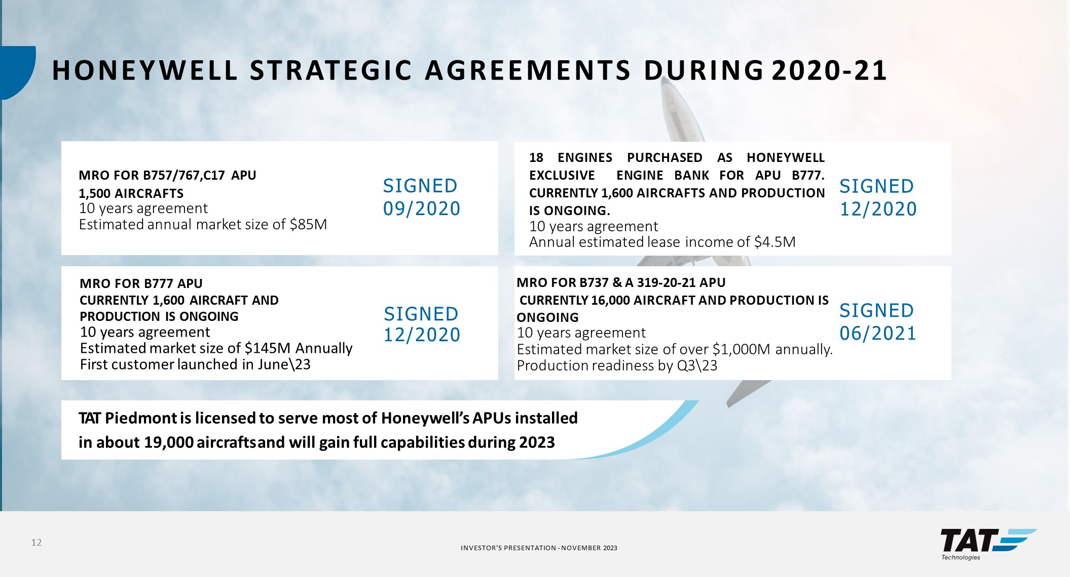 霍尼韦尔在2020-21年期间的战略协议18台发动机作为霍尼韦尔APU B777的独家发动机银行购买。目前正在进行1,600架飞机和生产。10年协议B777 APU目前1,600架飞机的年估计租赁收入为450万美元,生产正在进行中10年协议预计市场规模为每年1.45亿美元B737 & A 319-20-21 APU目前有16,000架飞机和生产正在进行中10年协议预计市场规模每年超过10亿美元。到Q3就生产做好准备\ 23签署12/2020签署12/2020签署06/2021 B757/767、C17 APU 1,500架飞机10年协议的MRO预计年市场规模为8,500万美元签署09/2020 TAT Piedmont获许可为安装在约19,000架飞机上的大部分霍尼韦尔的APU提供服务,并将在2023年12投资者介绍-2023年11月期间获得全部能力