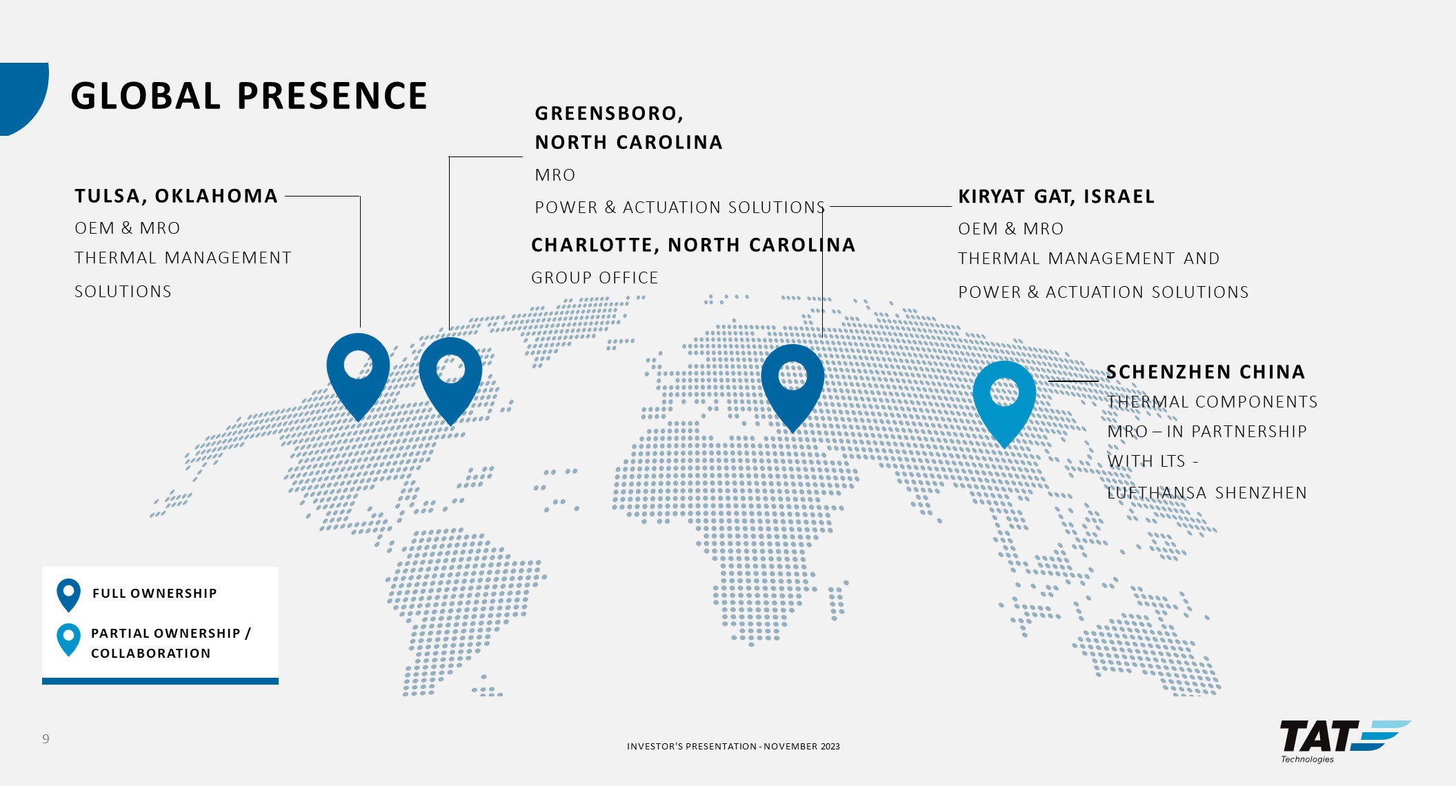 Global Presence TULSA,OKLAHOMA OEM & MRO热管理解决方案GreenBORO,North CAROLINA MRO Power & Actuation Solutions CHARLOT TE,North CAROLINA Group Office KIRYAT GAT,以色列OEM & MRO热管理和Power & Actuation Solutions SCHENZHEN China THERMAL COMPONETS TERM3 – in partnership with LTS-LUFTHANSA SHENSA