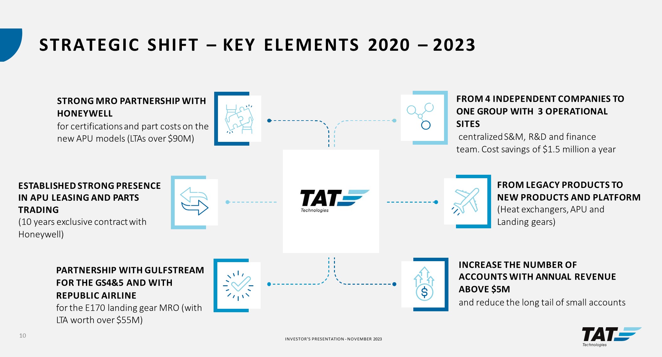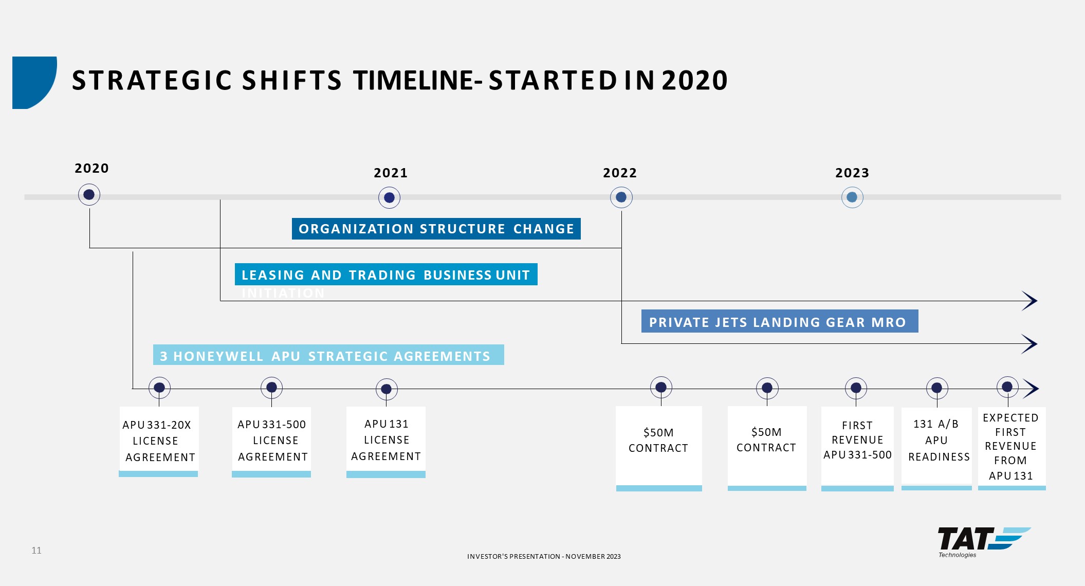 战略转变时间表-于2020年开始20202020202120222023组织结构变化租赁和贸易业务单位倡议3霍尼韦尔APU战略协议APU 331-500许可协议APU 131许可协议131 a/b APU准备11投资者介绍-2023年11月5000万美元合同私人喷气式飞机着陆器MRO APU 331-20X许可协议5000万美元合同首次收入APU 331-500 exx
