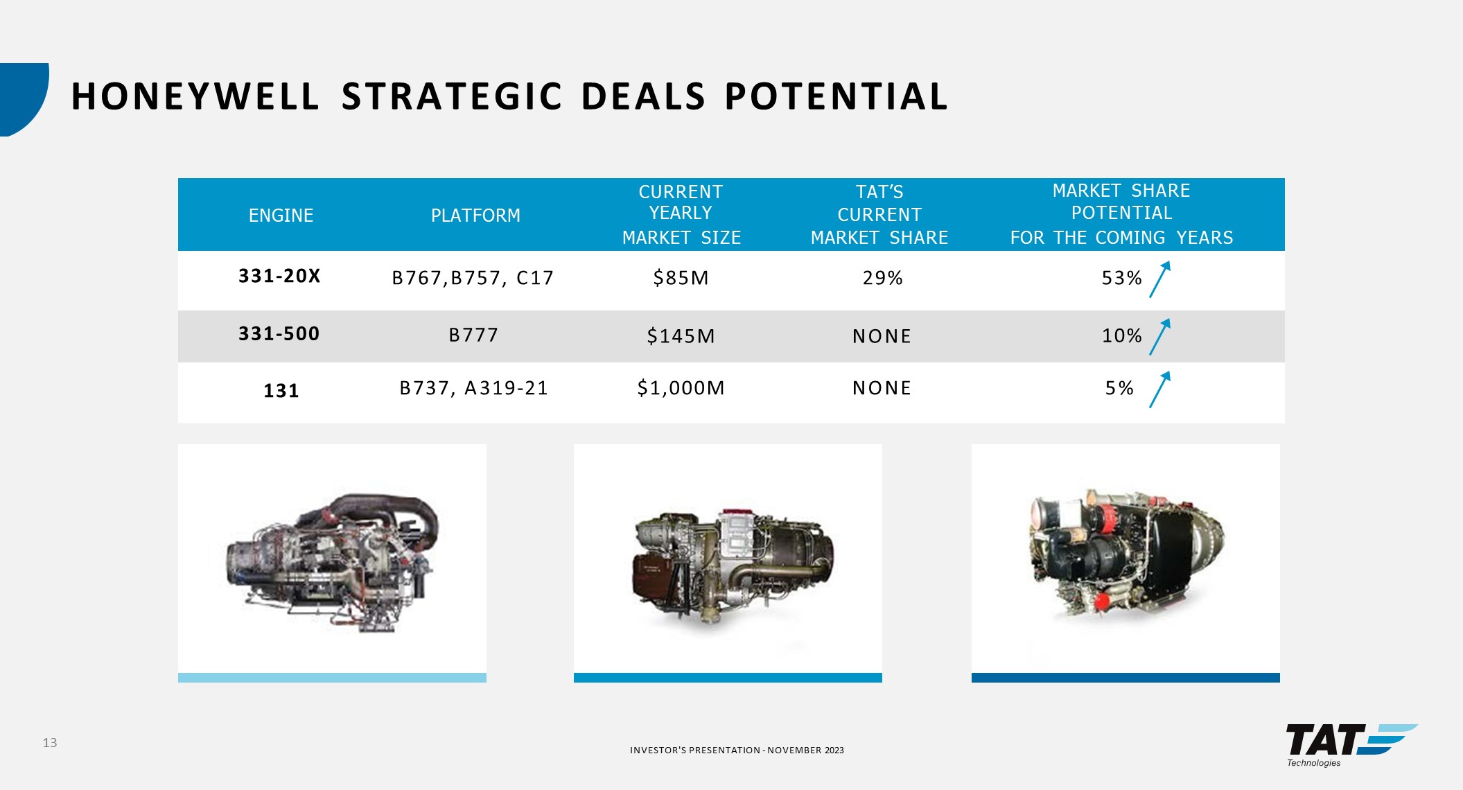 Honeywell Strategic Deals Potential Current Engine Platform Yearly TAT’s current market share potential market size market share for coming years 331-20x b767,b757,c17 $ 8500万29% 53% 331-500 b777 $ 1.45亿none 10% 131 b737,a 319-21 $ 1,000m none 5% 13 investor presentation-November 2023