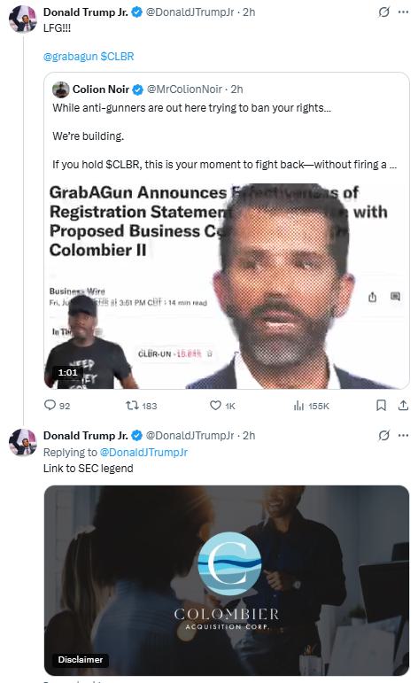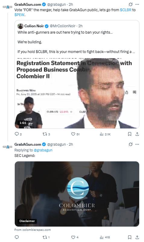 2025年6月27日,Colombier Acquisition Corp. II(“Colombier”)、Metroplex Trading Company LLC(以GrabAGun.com开展业务)(“GrabAGun”)的首席执行官兼董事会主席Omeed Malik、GrabAGun的顾问Donald Trump Jr.以及GrabAGun Digital Holdings Inc.(“Pubco”)的董事会提名人,GrabAGun和Colombier Acquisition Corp. II以及Colion Noir于2025年1月6日签署的业务合并协议所涉拟议业务合并完成后,GrabAGun和TERM2 II以及Colion Noir将成为未来的上市公司,Pubco董事会被提名人,作出以下通讯。