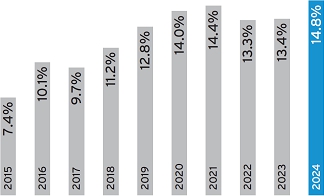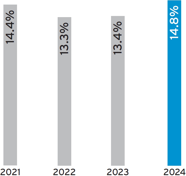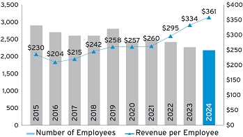 | 2015-2024年调整后EBITDA利润率(3) | 2015-2024年员工人数和每名员工净收入 | |
