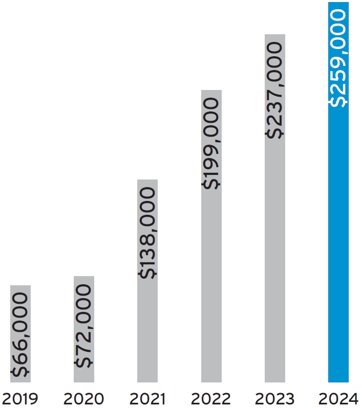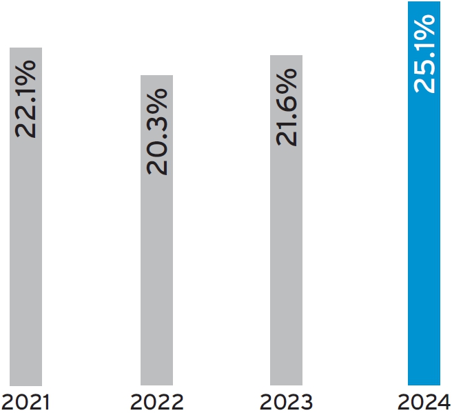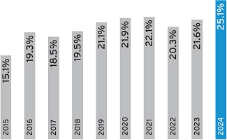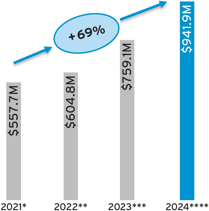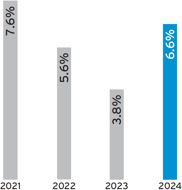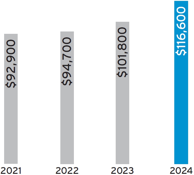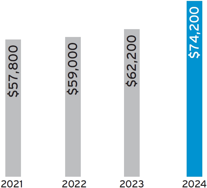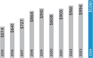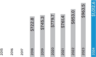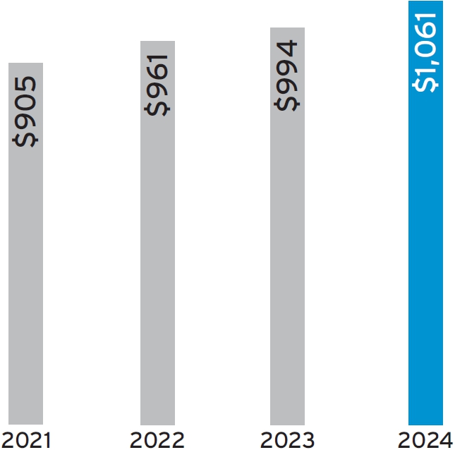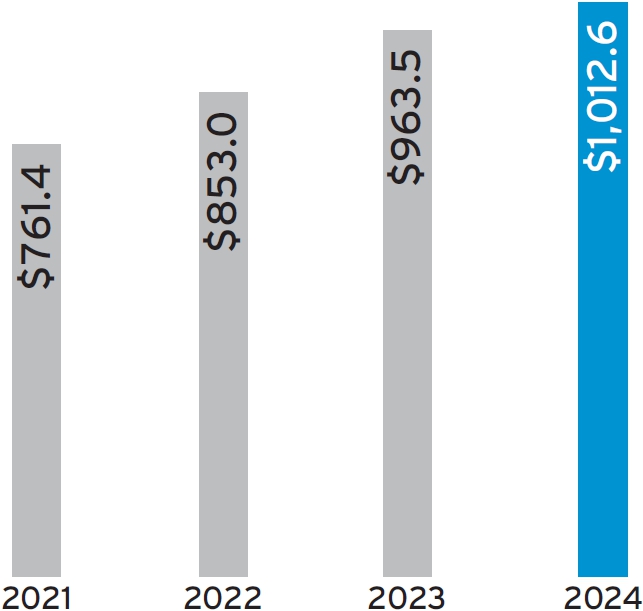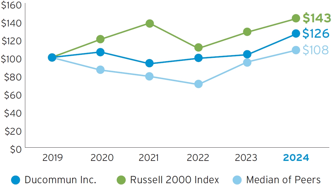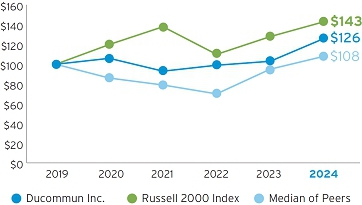 截至2024年12月31日止年度业绩,杜科蒙的175第连续一年的业务,作为公司VISION 2027战略按预期发挥作用的证明证据。我们成功地提高了工程产品业务和售后市场内容的收入百分比,通过空客和公务机扩大了我们在关键商业航空航天平台上的存在,执行了我们的国防素数卸载战略,巩固了我们的设施足迹,并继续扩大利润率,同时克服了与劳动力可用性、通胀压力和商业航空航天市场重大逆风相关的挑战。由此,杜科蒙在12月31日之间股价实现了22%的涨幅St2023年和2024年,其市值较上年增长24%,收入达到历史最高的7.866亿美元,毛利润较上年增长21%,这些都有望加速实现我们在VISION 2027游戏计划下为投资者制定的战略目标和目标。2024年也是我们的董事长、总裁兼首席执行官奥斯瓦尔德先生加入公司以来的第七个完整年度,下图描述了他的领导对我们业绩的几个关键指标产生的重大积极影响: