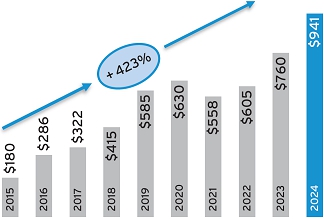 | 2015-2024年按市值划分的股东价值(百万美元)(1) | 2015-2024年净收入(百万美元) | |