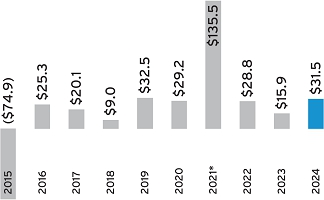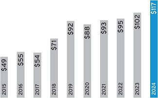 | 2015-2024年净收入(百万美元)(2) | 2015-2024年调整后EBITDA(百万美元)(3) | |