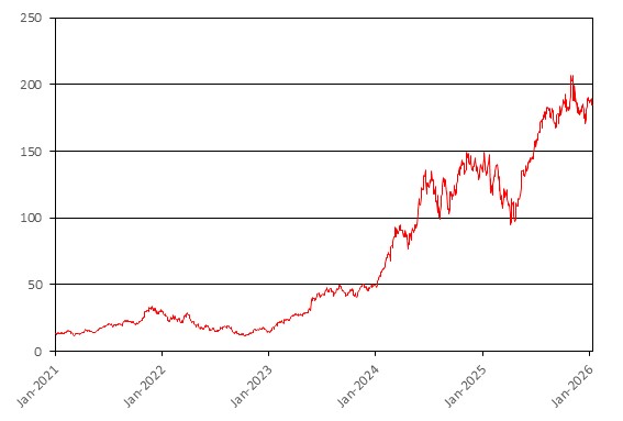 我们从彭博获得有关下图中参考资产历史表现的信息,未经独立审查或核实。下图展示了参考资产在2021年1月1日至2026年1月12日期间的表现。参考资产2026年1月12日收盘价为184.94美元。