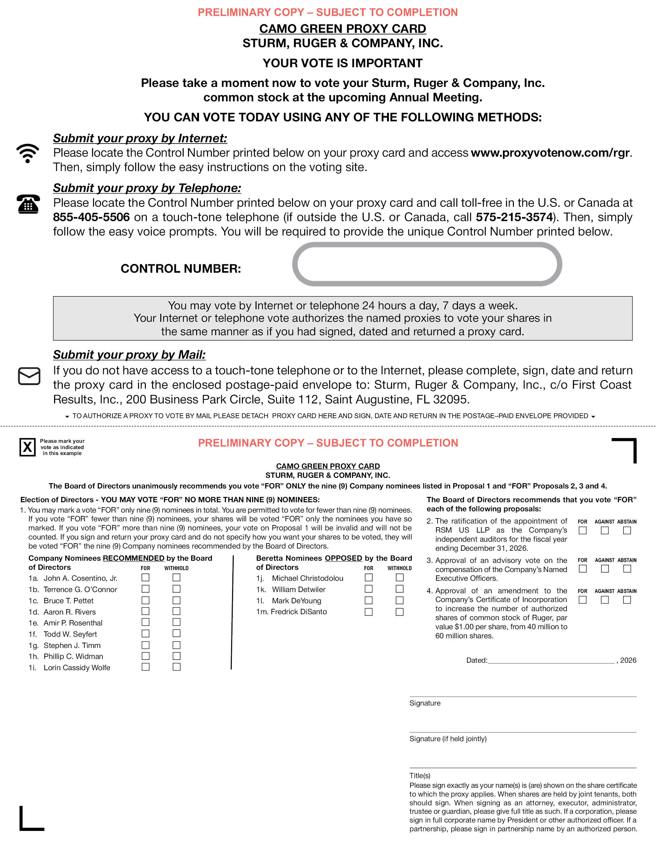 初步复制–以完成为准CAMO Green Proxy CARD STURM,RUGER & COMPANY,INC。您的投票很重要,请现在花点时间在即将举行的年度会议上为您的斯特姆-鲁格公司普通股股票投票。您今天可以使用以下任何方法进行投票:通过互联网提交您的代理:请在您的代理卡上找到下面打印的控制号码,并访问www.proxyvotenow.com/rgr。然后,只需按照投票现场的简单说明操作即可。通过电话提交您的代理:请在您的代理卡上找到下面打印的控制号码,并通过按键式电话拨打美国或加拿大的免费电话855-405-5506(如果在美国或加拿大境外,请拨打575-215-3574)。然后,只需按照简单的语音提示操作即可。您将被要求提供下面打印的唯一控制号码。控制号码:您可以每周7天、每天24小时通过网络或电话投票。您的网络或电话投票授权指定的代理人以与您签署、注明日期并退回代理卡相同的方式对您的股份进行投票。邮寄方式提交您的代理权:如果您无法使用按键式电话或互联网,请在随附的已付邮资信封中填写、签名、注明日期并将代理卡寄回:Sturm, Ruger & Company, Inc.,c/o First Coast Results,Inc.,200 Business Park Circle,Suite 112,Saint Augustine,FL 32095。要授权代理以邮寄方式投票,请在此处拆分代理卡,并在邮资中签名、注明日期和返回-付费信封提供了初步副本-待完成后,请按照此示例中所示标记您的投票camo green proxy card sturm,ruger & company,Inc.。董事会一致建议您仅对议案1和议案2、3、4中所列的九(9)名公司提名人投“赞成”票。选举董事-您可以投票“支持”不超过九(9)名被提名人:1。你可能会标记一次投票,总共只“支持”九(9)名被提名者。你被允许投票给少于九(9)名被提名人。如果你投票“支持”的提名人数少于九(9)人,你的股份将只被投票“支持”你如此标记的提名人数。如果你投票“支持”九(9)个以上的被提名人,你对提案1的投票将无效,不被计算在内。如果你签署并交还你的代理卡,并且没有具体说明你希望你的股票如何被投票,他们将被投票“支持”董事会推荐的九(9)名公司提名人。董事会推荐的公司提名人1a。John A. Cosentino,JR. 1b。特伦斯·G·奥康纳1c。Bruce T. Pettet 1d。Aaron R. Rivers 1e。Amir P. Rosenthal 1f。托德·W·塞弗特1g。Stephen J. Timm 1小时。Phillip C. Widman 1i。Lorin Cassidy Wolfe for withold Beretta Nominees反对董事会1j。迈克尔·赫里斯托多卢1k。威廉·德特维尔1l。马克·德扬1m。Fredrick DiSanto董事会建议您对以下各项提案均投“赞成”票:2.批准任命RSM US LLP为公司截至2026年12月31日止财政年度的独立审计师。3.批准就公司指定执行官的薪酬进行咨询投票。4.批准对公司注册证书的修订,将Ruger普通股的授权股份数量(每股面值1.00美元)从4000万股增加到6000万股。反对弃权日期:,2026年签署签署(如共同持有)所有权请完全按照代理人申请的股份证书上显示的您的姓名签署。当股份由共同承租人持有时,双方应签署。在作为代理律师、被执行人、管理人、受托人或监护人签字时,请提供完整的标题。如果是公司,请由总裁或其他授权人员签署公司全名。如为合伙企业,请经授权人在合伙企业名称上签字。