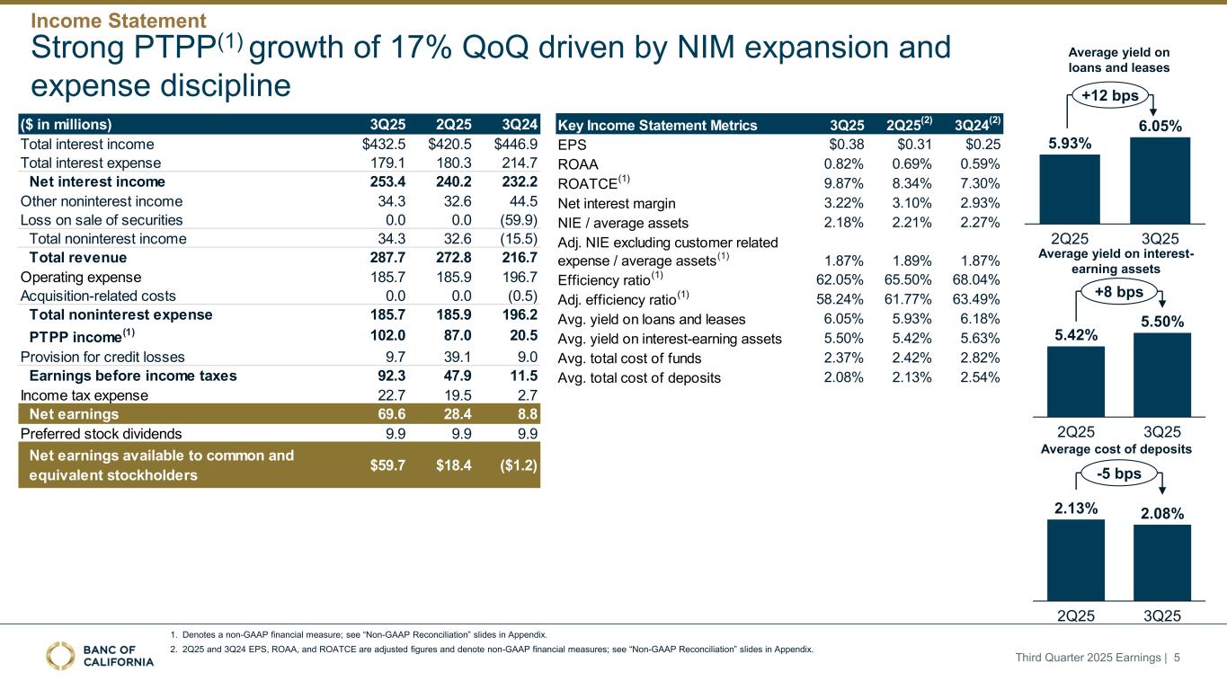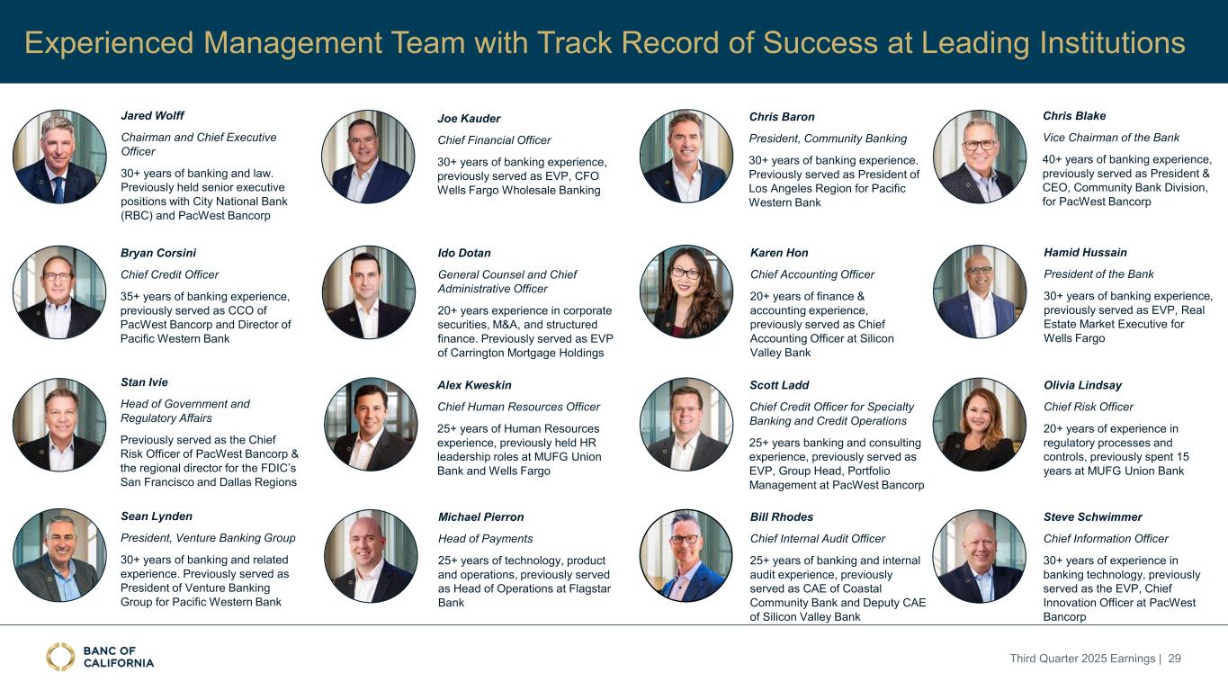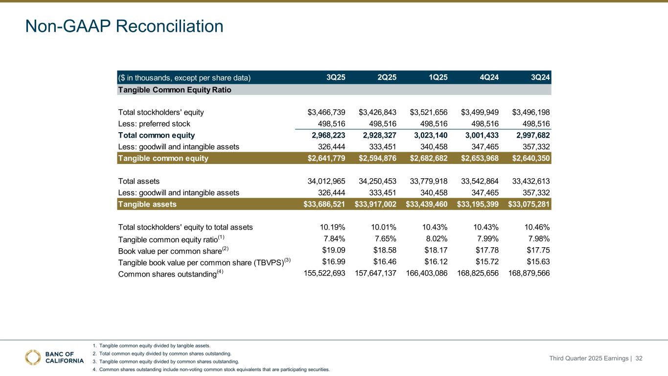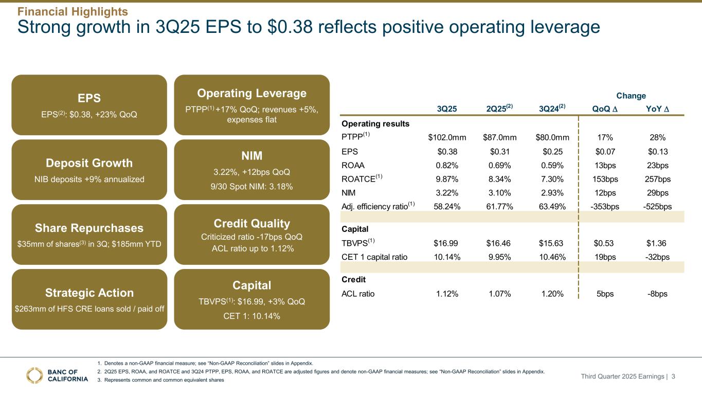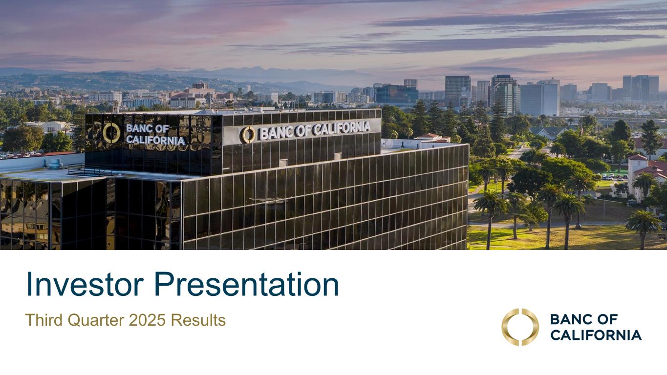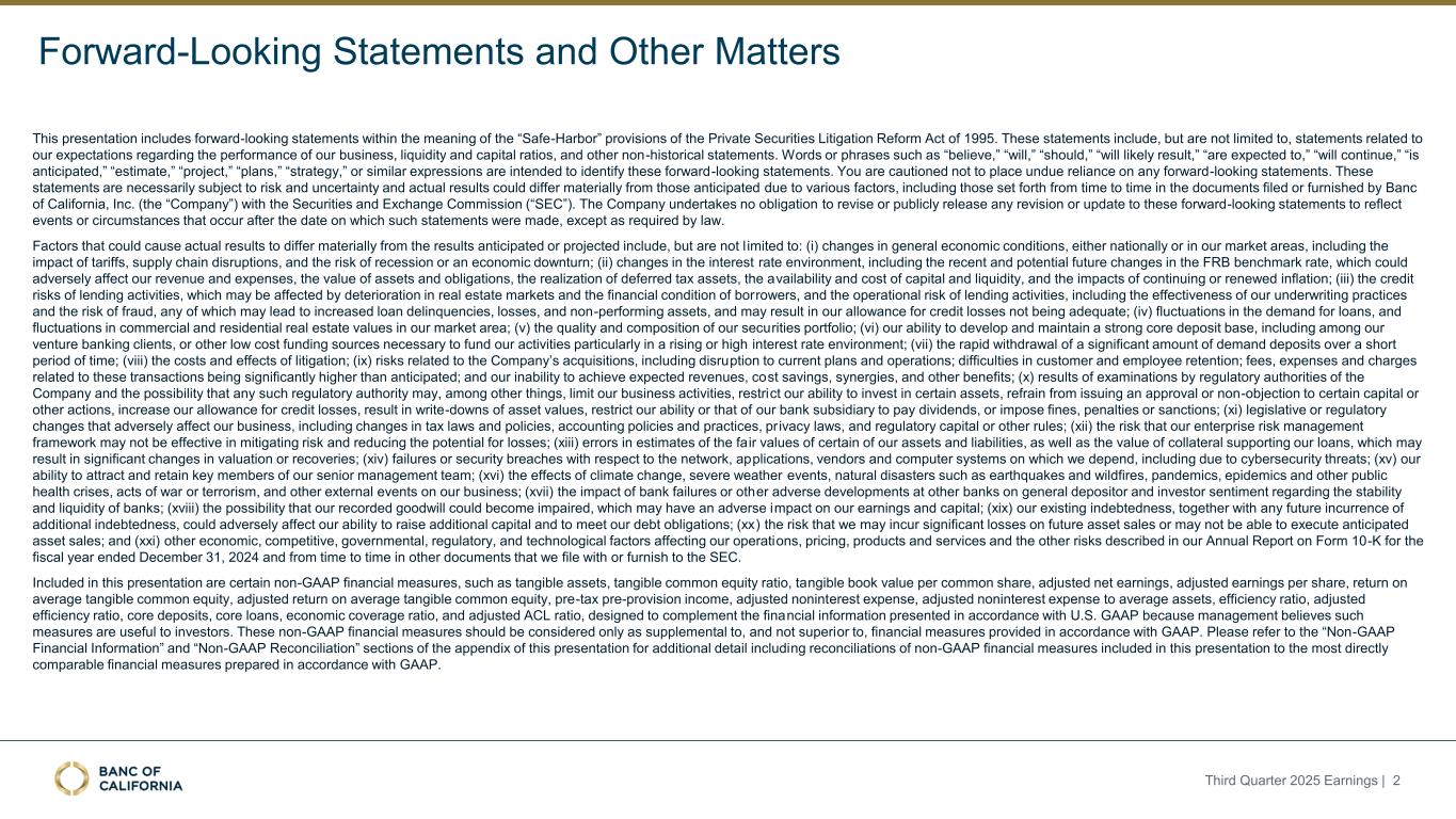 前瞻性陈述和其他事项本演示文稿包括1995年《私人证券诉讼改革法案》“安全港”条款含义内的前瞻性陈述。这些报表包括但不限于与我们对业务表现、流动性和资本比率的预期相关的报表,以及其他非历史报表。诸如“相信”、“将”、“应该”、“将可能导致”、“预计”、“将继续”、“预计”、“估计”、“项目”、“计划”、“战略”或类似表述等词语或短语旨在识别这些前瞻性陈述。请注意,不要过分依赖任何前瞻性陈述。这些陈述必然受到风险和不确定性的影响,由于各种因素,包括由加州银行公司(“公司”)向美国证券交易委员会(“SEC”)提交或提供的文件中不时列出的因素,实际结果可能与预期的结果存在重大差异。除法律要求外,公司不承担修改或公开发布对这些前瞻性陈述的任何修改或更新以反映作出此类陈述之日之后发生的事件或情况的义务。可能导致实际结果与预期或预测的结果存在重大差异的因素包括但不限于:(i)国家或我们市场领域的总体经济状况的变化,包括关税、供应链中断以及经济衰退或经济下滑的风险的影响;(ii)利率环境的变化,包括最近和未来可能发生的FRB基准利率变化,这可能会对我们的收入和支出、资产和债务的价值、递延所得税资产的变现产生不利影响,资金和流动性的可用性和成本,以及持续或重新出现的通货膨胀的影响;(iii)贷款活动的信贷风险,这可能受到房地产市场恶化和借款人财务状况的影响,以及贷款活动的操作风险,包括我们的承销做法的有效性和欺诈风险,其中任何一种都可能导致贷款拖欠、损失和不良资产增加,并可能导致我们的信贷损失准备金不足;(iv)贷款需求的波动,以及我们市场区域的商业和住宅房地产价值的波动;(v)我们的证券投资组合的质量和构成;(vi)我们开发和维持强大的核心存款基础的能力,包括在我们的风险银行客户中,或为我们的活动提供资金所必需的其他低成本资金来源,特别是在利率上升或高利率环境下;(vii)在短期内快速提取大量活期存款;(viii)诉讼的成本和影响;(ix)与公司收购相关的风险,包括对当前计划和运营的干扰;客户和员工保留方面的困难;与这些交易相关的费用、开支和收费明显高于预期;以及我们无法实现预期的收入、成本节约、协同效应和其他收益;(x)公司监管机构的审查结果以及任何此类监管机构可能(其中包括)限制我们的业务活动、限制我们投资于某些资产的能力、不对某些资本或其他行动发出批准或不反对、增加我们的信用损失准备金、导致资产价值减记的可能性,限制我们或我们的银行子公司支付股息的能力,或处以罚款、处罚或制裁;(xi)对我们的业务产生不利影响的立法或监管变化,包括税法和政策、会计政策和惯例、隐私法以及监管资本或其他规则的变化;(xii)我们的企业风险管理框架可能无法有效降低风险和减少潜在损失的风险;(xiii)我们的某些资产和负债的公允价值估计错误,以及支持我们贷款的抵押品的价值,这可能导致估值或复苏发生重大变化;(xiv)我们所依赖的网络、应用程序、供应商和计算机系统出现故障或安全漏洞,包括由于网络安全威胁;(xv)我们吸引和留住高级管理团队关键成员的能力;(xvi)气候变化、恶劣天气事件、地震和野火等自然灾害、流行病、流行病和其他公共卫生危机、战争或恐怖主义行为的影响, 及其他有关我们业务的外部事件;(xvii)银行倒闭或其他银行的其他不利发展对一般存款人和投资者对银行的稳定性和流动性的情绪的影响;(xviii)我们记录的商誉可能发生减值的可能性,这可能对我们的收益和资本产生不利影响;(xix)我们现有的债务,连同任何未来产生的额外债务,可能会对我们筹集额外资金和履行债务义务的能力产生不利影响;(xx)我们可能在未来资产出售方面蒙受重大损失或可能无法执行预期资产出售的风险;(xxi)影响我们的运营、定价、产品和服务的其他经济、竞争、政府、监管和技术因素,以及我们在截至12月31日的财政年度的10-K表格年度报告中描述的其他风险,2024年以及我们不时向SEC提交或提供的其他文件。本演示文稿中包含某些非公认会计准则财务指标,例如有形资产、有形普通股权益比率、每股普通股有形账面价值、调整后净收益、调整后每股收益、平均有形普通股权益回报率、调整后平均有形普通股权益回报率、税前拨备前收入、调整后非利息费用、调整后非利息费用与平均资产、效率比率、调整后效率比率、核心存款、核心贷款、经济覆盖率和调整后ACL比率,旨在补充根据美国公认会计原则提供的财务信息,因为管理层认为此类措施对投资者有用。这些非GAAP财务指标应仅被视为对根据GAAP提供的财务指标的补充,而不是优于。请参阅本演示文稿附录的“非GAAP财务信息”和“非GAAP调节”部分,了解更多详细信息,包括本演示文稿中包含的非GAAP财务指标与根据GAAP编制的最直接可比财务指标的调节。2025年第三季度收益| 2
