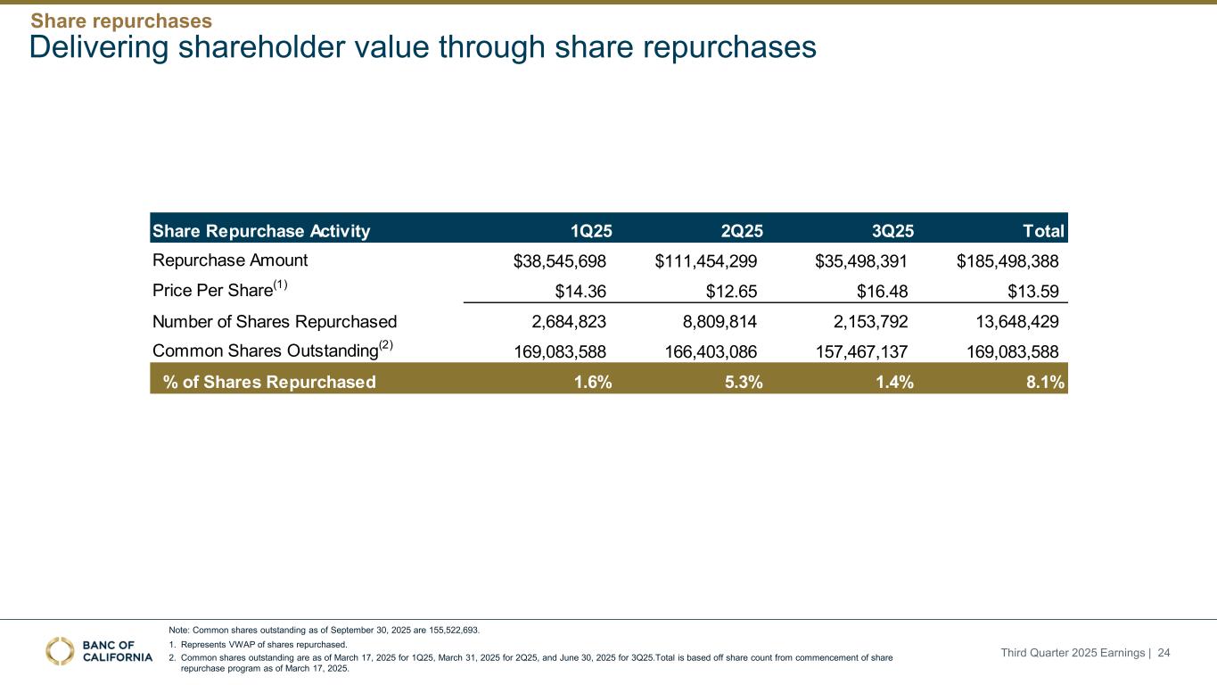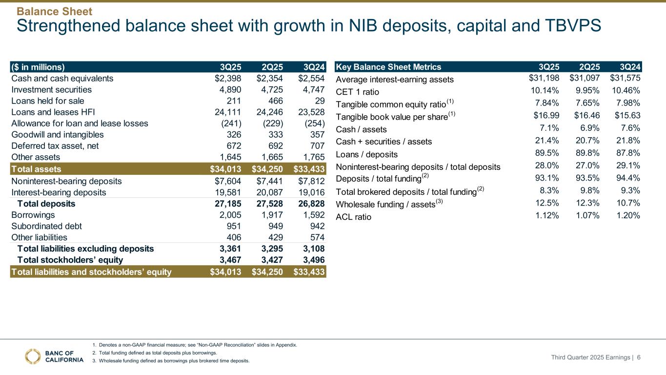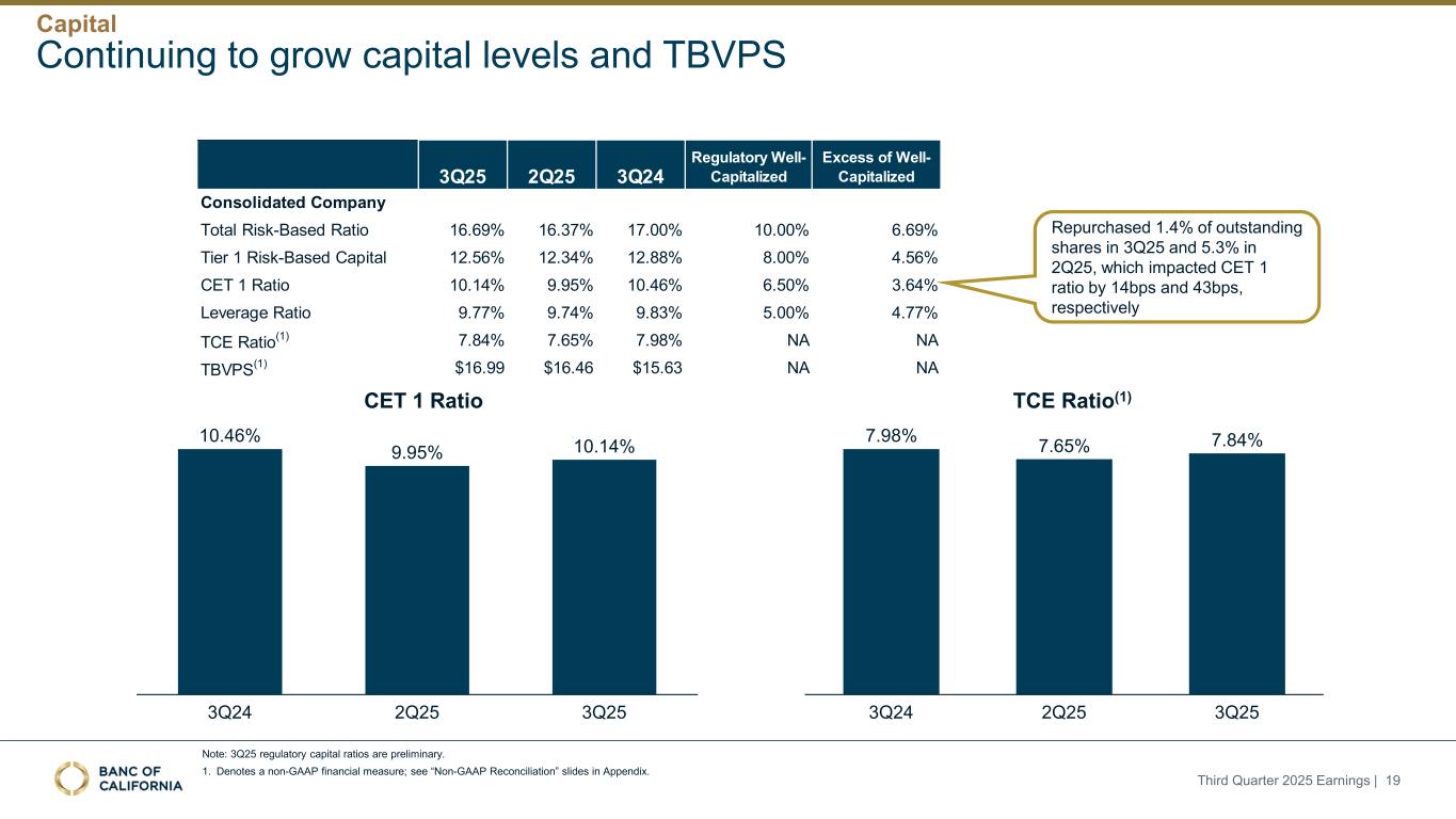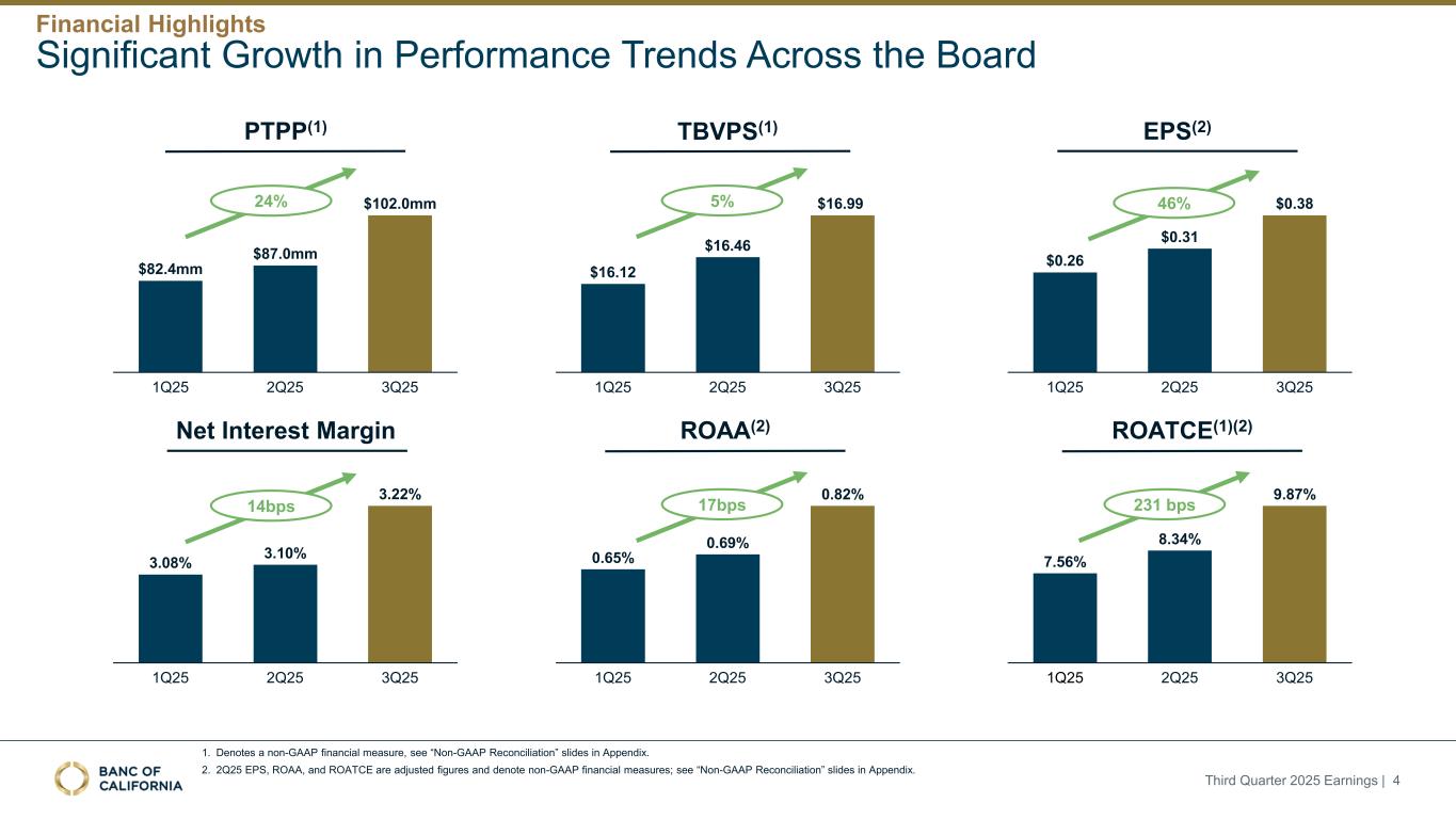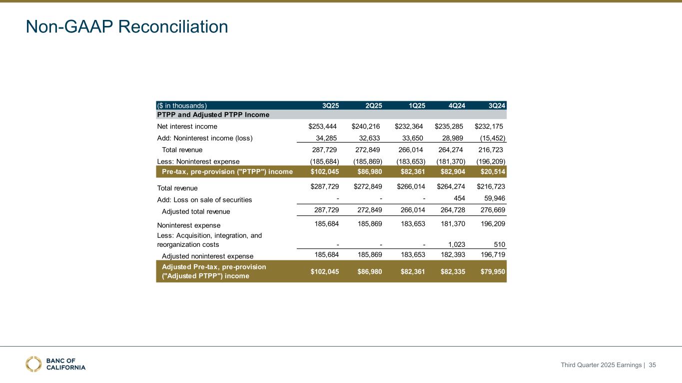 前瞻性陈述和其他事项本演示文稿包括1995年《私人证券诉讼改革法案》“安全港”条款含义内的前瞻性陈述。这些报表包括但不限于与我们对业务表现、流动性和资本比率的预期相关的报表,以及其他非历史报表。诸如“相信”、“将”、“应该”、“将可能导致”、“预计”、“将继续”、“预计”、“估计”、“项目”、“计划”、“战略”或类似表述等词语或短语旨在识别这些前瞻性陈述。请注意,不要过分依赖任何前瞻性陈述。这些陈述必然受到风险和不确定性的影响,由于各种因素,包括由加州银行公司(“公司”)向美国证券交易委员会(“SEC”)提交或提供的文件中不时列出的因素,实际结果可能与预期的结果存在重大差异。除法律要求外,公司不承担修改或公开发布对这些前瞻性陈述的任何修改或更新以反映作出此类陈述之日之后发生的事件或情况的义务。可能导致实际结果与预期或预测的结果存在重大差异的因素包括但不限于:(i)国家或我们市场领域的总体经济状况的变化,包括关税、供应链中断以及经济衰退或经济下滑的风险的影响;(ii)利率环境的变化,包括最近和未来可能发生的FRB基准利率变化,这可能会对我们的收入和支出、资产和债务的价值、递延所得税资产的变现产生不利影响,资金和流动性的可用性和成本,以及持续或重新出现的通货膨胀的影响;(iii)贷款活动的信贷风险,这可能受到房地产市场恶化和借款人财务状况的影响,以及贷款活动的操作风险,包括我们的承销做法的有效性和欺诈风险,其中任何一种都可能导致贷款拖欠、损失和不良资产增加,并可能导致我们的信贷损失准备金不足;(iv)贷款需求的波动,以及我们市场区域的商业和住宅房地产价值的波动;(v)我们的证券投资组合的质量和构成;(vi)我们开发和维持强大的核心存款基础的能力,包括在我们的风险银行客户中,或为我们的活动提供资金所必需的其他低成本资金来源,特别是在利率上升或高利率环境下;(vii)在短期内快速提取大量活期存款;(viii)诉讼的成本和影响;(ix)与公司收购相关的风险,包括对当前计划和运营的干扰;客户和员工保留方面的困难;与这些交易相关的费用、开支和收费明显高于预期;以及我们无法实现预期的收入、成本节约、协同效应和其他收益;(x)公司监管机构的审查结果以及任何此类监管机构可能(其中包括)限制我们的业务活动、限制我们投资于某些资产的能力、不对某些资本或其他行动发出批准或不反对、增加我们的信用损失准备金、导致资产价值减记的可能性,限制我们或我们的银行子公司支付股息的能力,或处以罚款、处罚或制裁;(xi)对我们的业务产生不利影响的立法或监管变化,包括税法和政策、会计政策和惯例、隐私法以及监管资本或其他规则的变化;(xii)我们的企业风险管理框架可能无法有效降低风险和减少潜在损失的风险;(xiii)我们的某些资产和负债的公允价值估计错误,以及支持我们贷款的抵押品的价值,这可能导致估值或复苏发生重大变化;(xiv)我们所依赖的网络、应用程序、供应商和计算机系统出现故障或安全漏洞,包括由于网络安全威胁;(xv)我们吸引和留住高级管理团队关键成员的能力;(xvi)气候变化、恶劣天气事件、地震和野火等自然灾害、流行病、流行病和其他公共卫生危机、战争或恐怖主义行为的影响, 及其他有关我们业务的外部事件;(xvii)银行倒闭或其他银行的其他不利发展对一般存款人和投资者对银行的稳定性和流动性的情绪的影响;(xviii)我们记录的商誉可能发生减值的可能性,这可能对我们的收益和资本产生不利影响;(xix)我们现有的债务,连同任何未来产生的额外债务,可能会对我们筹集额外资金和履行债务义务的能力产生不利影响;(xx)我们可能在未来资产出售方面蒙受重大损失或可能无法执行预期资产出售的风险;(xxi)影响我们的运营、定价、产品和服务的其他经济、竞争、政府、监管和技术因素,以及我们在截至12月31日的财政年度的10-K表格年度报告中描述的其他风险,2024年以及我们不时向SEC提交或提供的其他文件。本演示文稿中包含某些非公认会计准则财务指标,例如有形资产、有形普通股权益比率、每股普通股有形账面价值、调整后净收益、调整后每股收益、平均有形普通股权益回报率、调整后平均有形普通股权益回报率、税前拨备前收入、调整后非利息费用、调整后非利息费用与平均资产、效率比率、调整后效率比率、核心存款、核心贷款、经济覆盖率和调整后ACL比率,旨在补充根据美国公认会计原则提供的财务信息,因为管理层认为此类措施对投资者有用。这些非GAAP财务指标应仅被视为对根据GAAP提供的财务指标的补充,而不是优于。请参阅本演示文稿附录的“非GAAP财务信息”和“非GAAP调节”部分,了解更多详细信息,包括本演示文稿中包含的非GAAP财务指标与根据GAAP编制的最直接可比财务指标的调节。2025年第三季度收益| 2