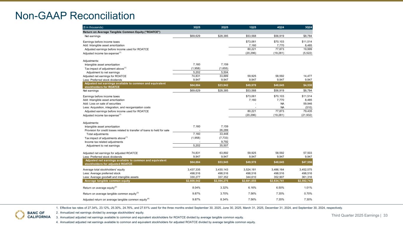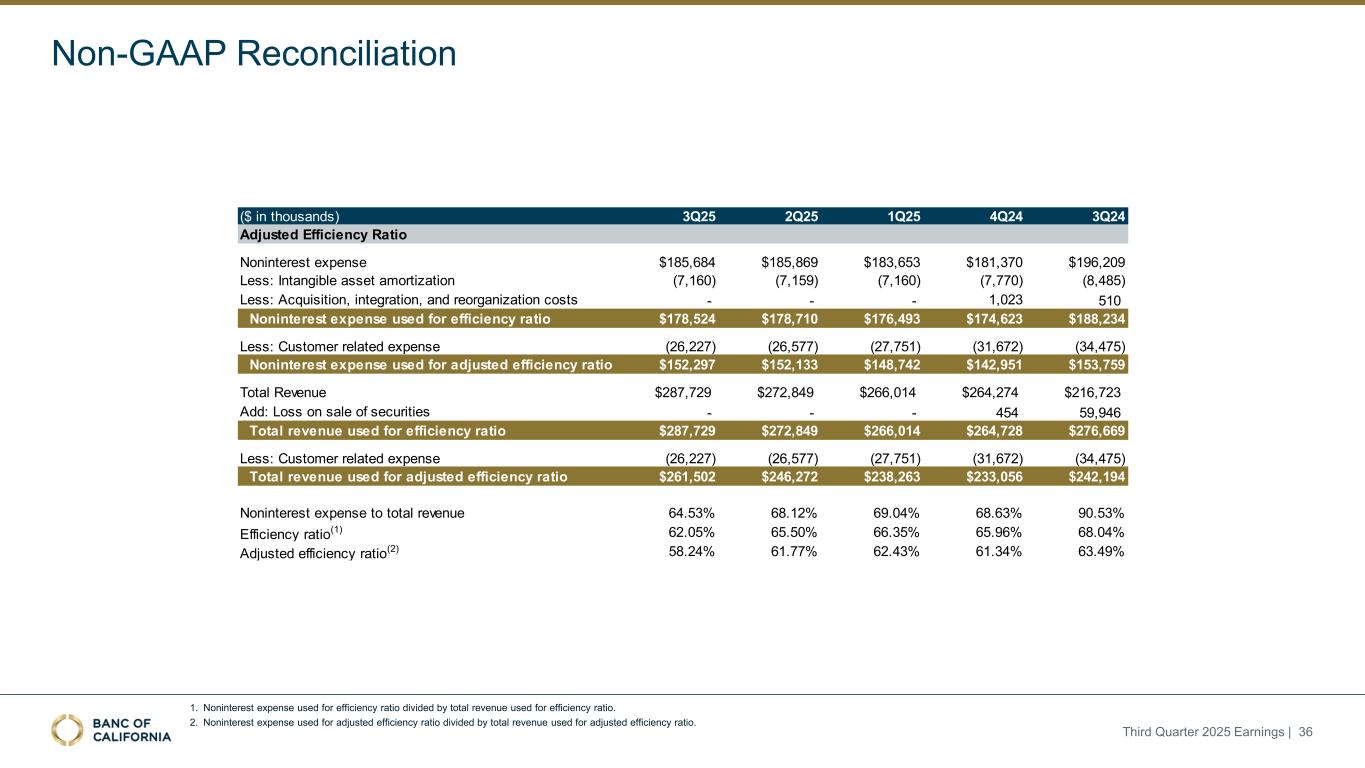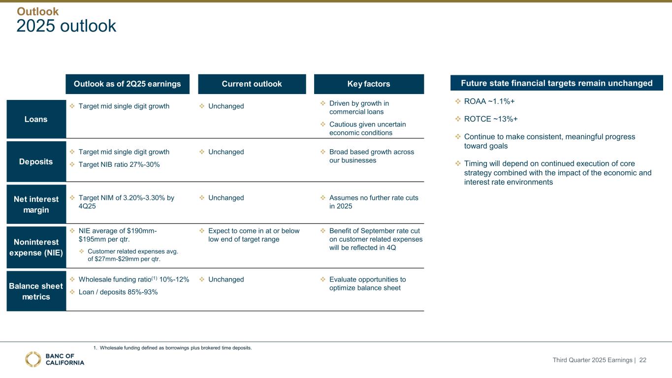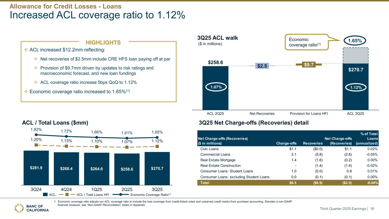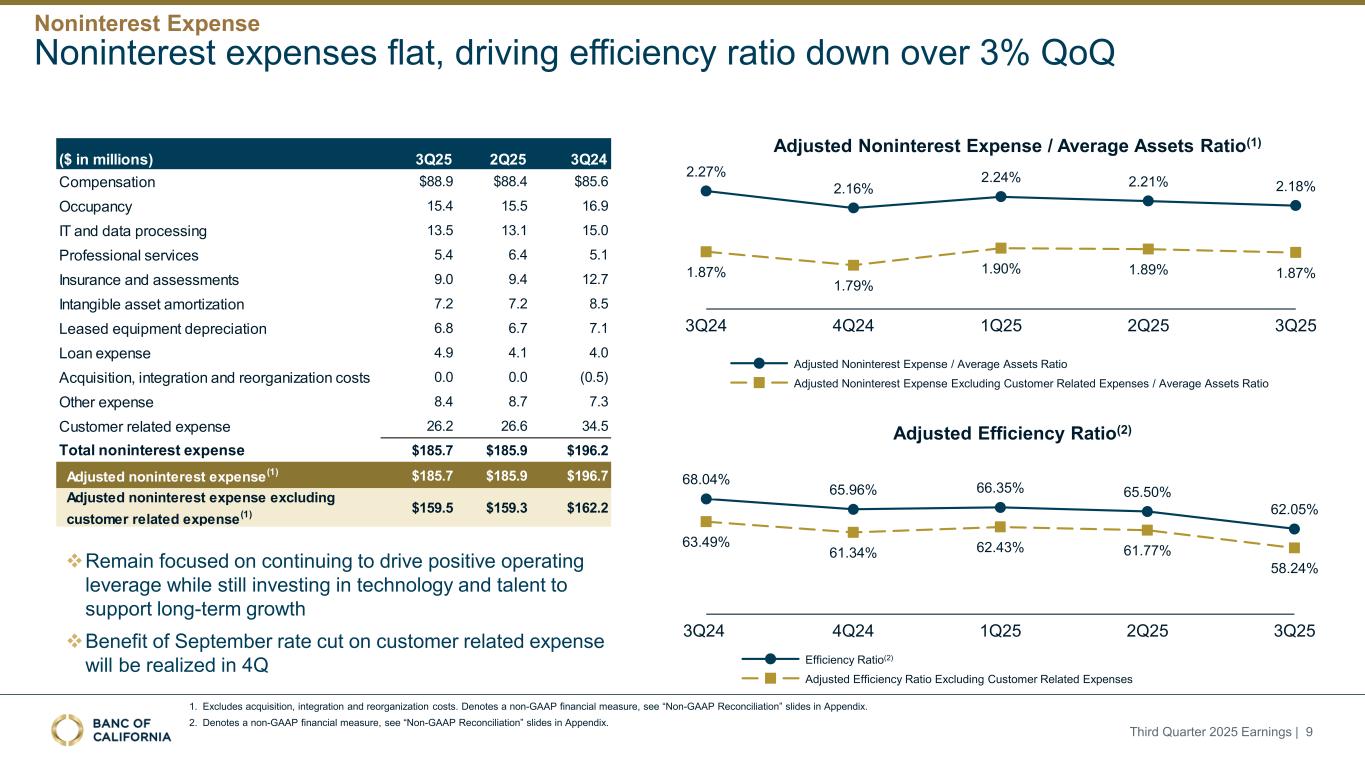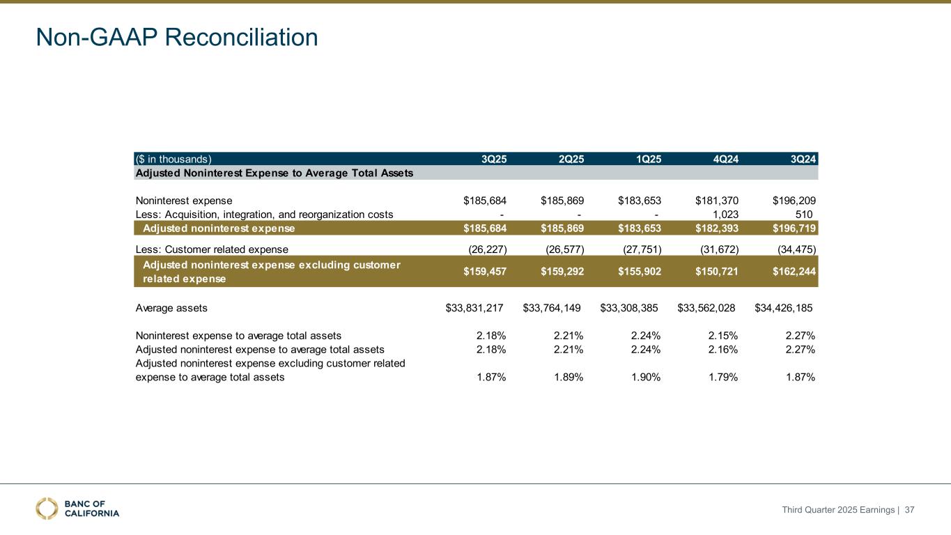 前瞻性陈述和其他事项本演示文稿包括1995年《私人证券诉讼改革法案》“安全港”条款含义内的前瞻性陈述。这些报表包括但不限于与我们对业务表现、流动性和资本比率的预期相关的报表,以及其他非历史报表。诸如“相信”、“将”、“应该”、“将可能导致”、“预计”、“将继续”、“预计”、“估计”、“项目”、“计划”、“战略”或类似表述等词语或短语旨在识别这些前瞻性陈述。请注意,不要过分依赖任何前瞻性陈述。这些陈述必然受到风险和不确定性的影响,由于各种因素,包括由加州银行公司(“公司”)向美国证券交易委员会(“SEC”)提交或提供的文件中不时列出的因素,实际结果可能与预期的结果存在重大差异。除法律要求外,公司不承担修改或公开发布对这些前瞻性陈述的任何修改或更新以反映作出此类陈述之日之后发生的事件或情况的义务。可能导致实际结果与预期或预测的结果存在重大差异的因素包括但不限于:(i)国家或我们市场领域的总体经济状况的变化,包括关税、供应链中断以及经济衰退或经济下滑的风险的影响;(ii)利率环境的变化,包括最近和未来可能发生的FRB基准利率变化,这可能会对我们的收入和支出、资产和债务的价值、递延所得税资产的变现产生不利影响,资金和流动性的可用性和成本,以及持续或重新出现的通货膨胀的影响;(iii)贷款活动的信贷风险,这可能受到房地产市场恶化和借款人财务状况的影响,以及贷款活动的操作风险,包括我们的承销做法的有效性和欺诈风险,其中任何一种都可能导致贷款拖欠、损失和不良资产增加,并可能导致我们的信贷损失准备金不足;(iv)贷款需求的波动,以及我们市场区域的商业和住宅房地产价值的波动;(v)我们的证券投资组合的质量和构成;(vi)我们开发和维持强大的核心存款基础的能力,包括在我们的风险银行客户中,或为我们的活动提供资金所必需的其他低成本资金来源,特别是在利率上升或高利率环境下;(vii)在短期内快速提取大量活期存款;(viii)诉讼的成本和影响;(ix)与公司收购相关的风险,包括对当前计划和运营的干扰;客户和员工保留方面的困难;与这些交易相关的费用、开支和收费明显高于预期;以及我们无法实现预期的收入、成本节约、协同效应和其他收益;(x)公司监管机构的审查结果以及任何此类监管机构可能(其中包括)限制我们的业务活动、限制我们投资于某些资产的能力、不对某些资本或其他行动发出批准或不反对、增加我们的信用损失准备金、导致资产价值减记的可能性,限制我们或我们的银行子公司支付股息的能力,或处以罚款、处罚或制裁;(xi)对我们的业务产生不利影响的立法或监管变化,包括税法和政策、会计政策和惯例、隐私法以及监管资本或其他规则的变化;(xii)我们的企业风险管理框架可能无法有效降低风险和减少潜在损失的风险;(xiii)我们的某些资产和负债的公允价值估计错误,以及支持我们贷款的抵押品的价值,这可能导致估值或复苏发生重大变化;(xiv)我们所依赖的网络、应用程序、供应商和计算机系统出现故障或安全漏洞,包括由于网络安全威胁;(xv)我们吸引和留住高级管理团队关键成员的能力;(xvi)气候变化、恶劣天气事件、地震和野火等自然灾害、流行病、流行病和其他公共卫生危机、战争或恐怖主义行为的影响, 及其他有关我们业务的外部事件;(xvii)银行倒闭或其他银行的其他不利发展对一般存款人和投资者对银行的稳定性和流动性的情绪的影响;(xviii)我们记录的商誉可能发生减值的可能性,这可能对我们的收益和资本产生不利影响;(xix)我们现有的债务,连同任何未来产生的额外债务,可能会对我们筹集额外资金和履行债务义务的能力产生不利影响;(xx)我们可能在未来资产出售方面蒙受重大损失或可能无法执行预期资产出售的风险;(xxi)影响我们的运营、定价、产品和服务的其他经济、竞争、政府、监管和技术因素,以及我们在截至12月31日的财政年度的10-K表格年度报告中描述的其他风险,2024年以及我们不时向SEC提交或提供的其他文件。本演示文稿中包含某些非公认会计准则财务指标,例如有形资产、有形普通股权益比率、每股普通股有形账面价值、调整后净收益、调整后每股收益、平均有形普通股权益回报率、调整后平均有形普通股权益回报率、税前拨备前收入、调整后非利息费用、调整后非利息费用与平均资产、效率比率、调整后效率比率、核心存款、核心贷款、经济覆盖率和调整后ACL比率,旨在补充根据美国公认会计原则提供的财务信息,因为管理层认为此类措施对投资者有用。这些非GAAP财务指标应仅被视为对根据GAAP提供的财务指标的补充,而不是优于。请参阅本演示文稿附录的“非GAAP财务信息”和“非GAAP调节”部分,了解更多详细信息,包括本演示文稿中包含的非GAAP财务指标与根据GAAP编制的最直接可比财务指标的调节。2025年第三季度收益| 2