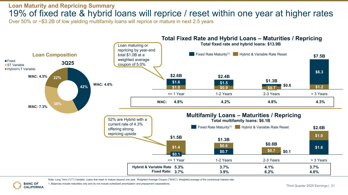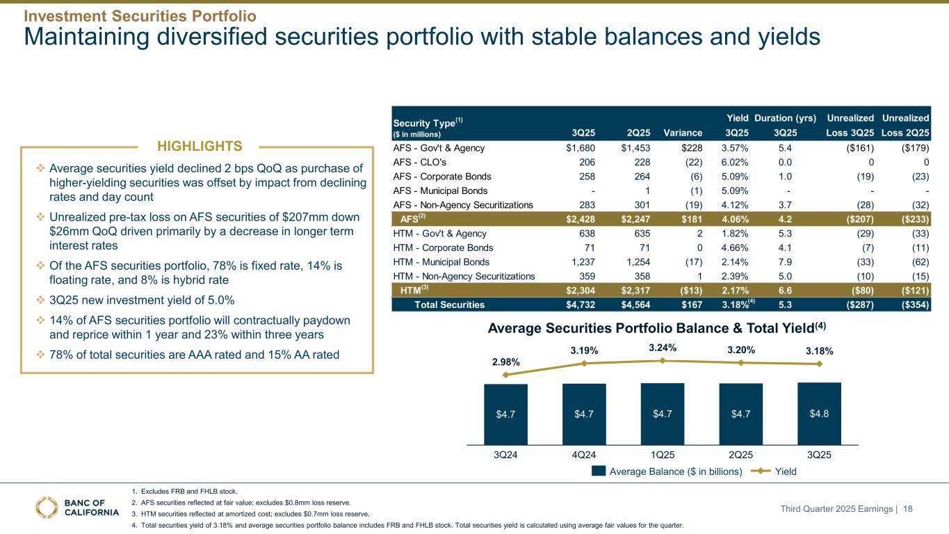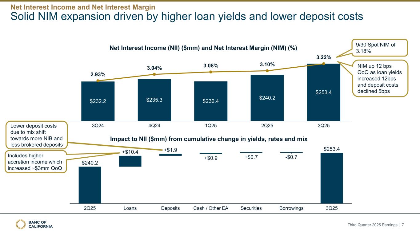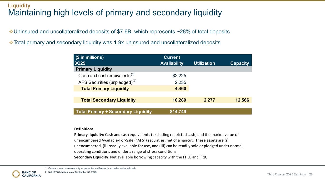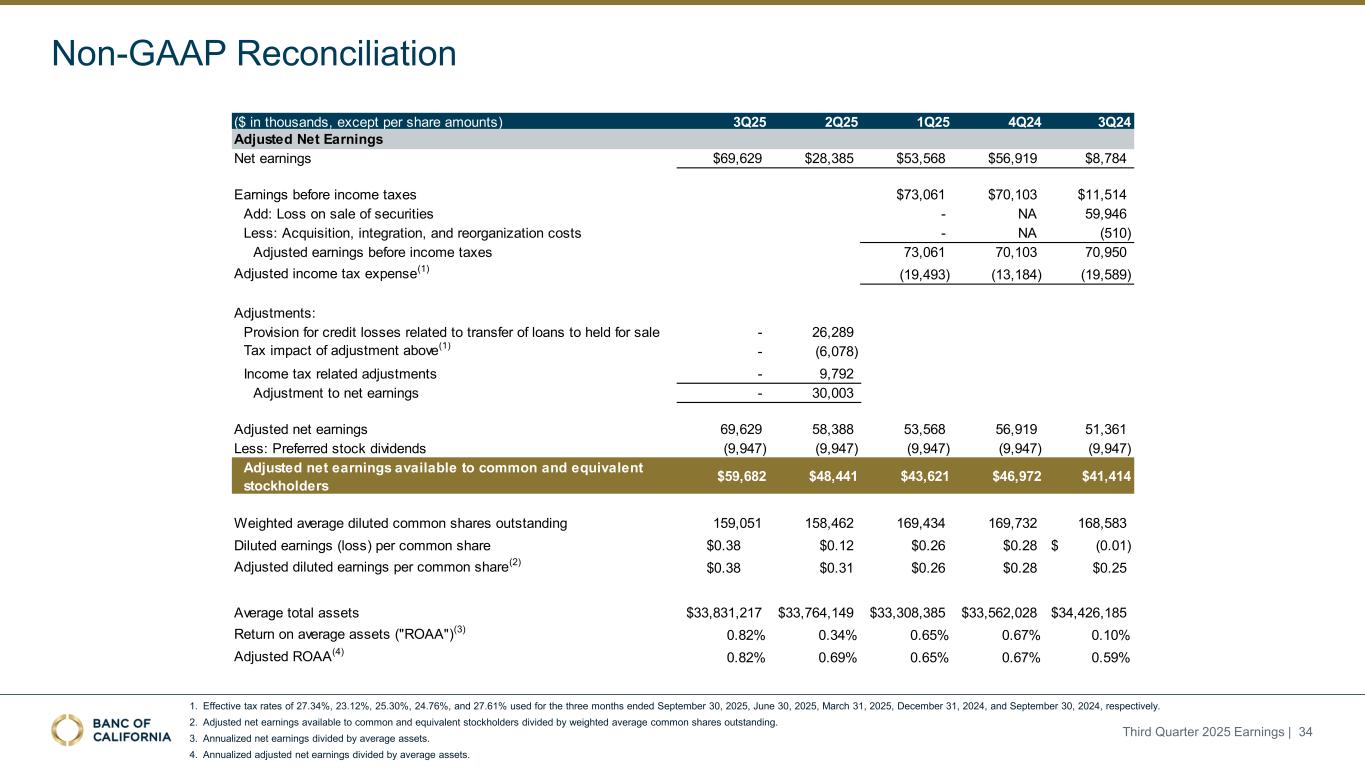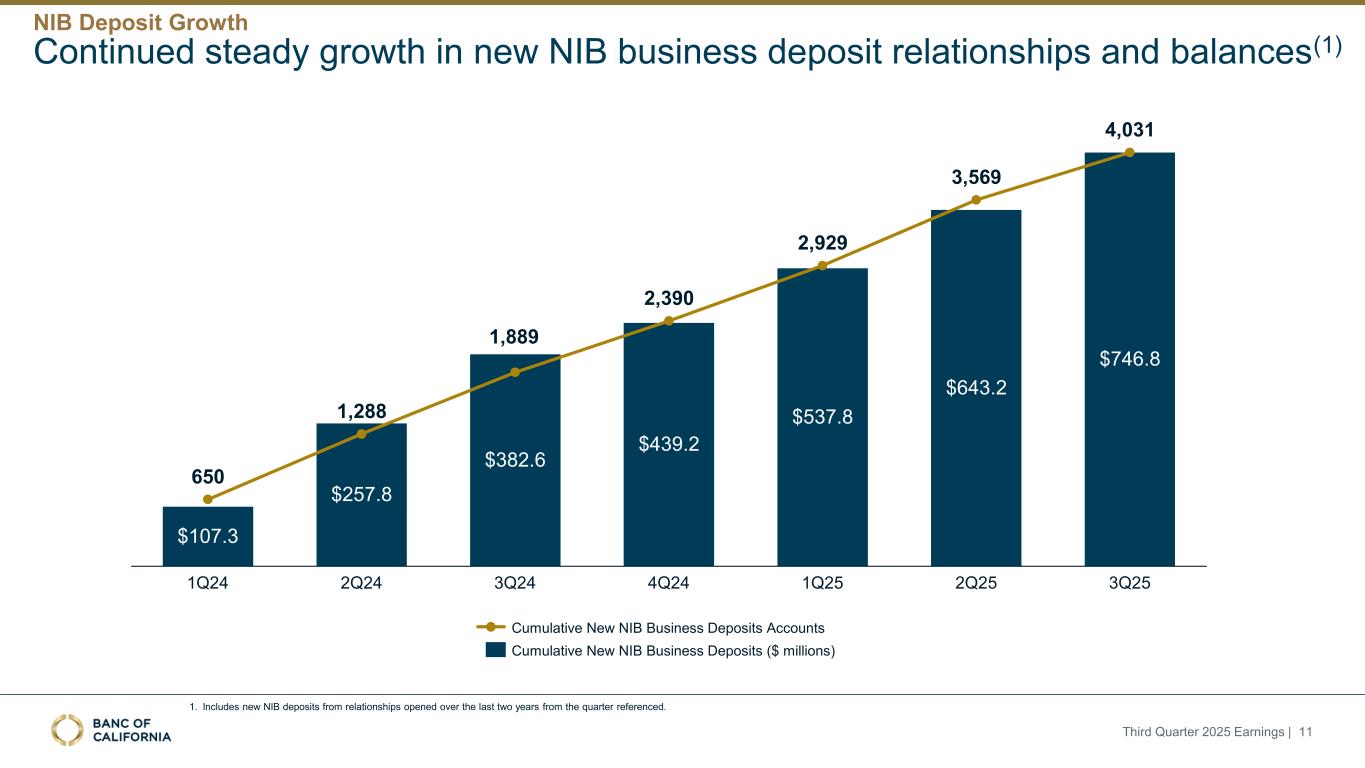 前瞻性陈述和其他事项本演示文稿包括1995年《私人证券诉讼改革法案》“安全港”条款含义内的前瞻性陈述。这些报表包括但不限于与我们对业务表现、流动性和资本比率的预期相关的报表,以及其他非历史报表。诸如“相信”、“将”、“应该”、“将可能导致”、“预计”、“将继续”、“预计”、“估计”、“项目”、“计划”、“战略”或类似表述等词语或短语旨在识别这些前瞻性陈述。请注意,不要过分依赖任何前瞻性陈述。这些陈述必然受到风险和不确定性的影响,由于各种因素,包括由加州银行公司(“公司”)向美国证券交易委员会(“SEC”)提交或提供的文件中不时列出的因素,实际结果可能与预期的结果存在重大差异。除法律要求外,公司不承担修改或公开发布对这些前瞻性陈述的任何修改或更新以反映作出此类陈述之日之后发生的事件或情况的义务。可能导致实际结果与预期或预测的结果存在重大差异的因素包括但不限于:(i)国家或我们市场领域的总体经济状况的变化,包括关税、供应链中断以及经济衰退或经济下滑的风险的影响;(ii)利率环境的变化,包括最近和未来可能发生的FRB基准利率变化,这可能会对我们的收入和支出、资产和债务的价值、递延所得税资产的变现产生不利影响,资金和流动性的可用性和成本,以及持续或重新出现的通货膨胀的影响;(iii)贷款活动的信贷风险,这可能受到房地产市场恶化和借款人财务状况的影响,以及贷款活动的操作风险,包括我们的承销做法的有效性和欺诈风险,其中任何一种都可能导致贷款拖欠、损失和不良资产增加,并可能导致我们的信贷损失准备金不足;(iv)贷款需求的波动,以及我们市场区域的商业和住宅房地产价值的波动;(v)我们的证券投资组合的质量和构成;(vi)我们开发和维持强大的核心存款基础的能力,包括在我们的风险银行客户中,或为我们的活动提供资金所必需的其他低成本资金来源,特别是在利率上升或高利率环境下;(vii)在短期内快速提取大量活期存款;(viii)诉讼的成本和影响;(ix)与公司收购相关的风险,包括对当前计划和运营的干扰;客户和员工保留方面的困难;与这些交易相关的费用、开支和收费明显高于预期;以及我们无法实现预期的收入、成本节约、协同效应和其他收益;(x)公司监管机构的审查结果以及任何此类监管机构可能(其中包括)限制我们的业务活动、限制我们投资于某些资产的能力、不对某些资本或其他行动发出批准或不反对、增加我们的信用损失准备金、导致资产价值减记的可能性,限制我们或我们的银行子公司支付股息的能力,或处以罚款、处罚或制裁;(xi)对我们的业务产生不利影响的立法或监管变化,包括税法和政策、会计政策和惯例、隐私法以及监管资本或其他规则的变化;(xii)我们的企业风险管理框架可能无法有效降低风险和减少潜在损失的风险;(xiii)我们的某些资产和负债的公允价值估计错误,以及支持我们贷款的抵押品的价值,这可能导致估值或复苏发生重大变化;(xiv)我们所依赖的网络、应用程序、供应商和计算机系统出现故障或安全漏洞,包括由于网络安全威胁;(xv)我们吸引和留住高级管理团队关键成员的能力;(xvi)气候变化、恶劣天气事件、地震和野火等自然灾害、流行病、流行病和其他公共卫生危机、战争或恐怖主义行为的影响, 及其他有关我们业务的外部事件;(xvii)银行倒闭或其他银行的其他不利发展对一般存款人和投资者对银行的稳定性和流动性的情绪的影响;(xviii)我们记录的商誉可能发生减值的可能性,这可能对我们的收益和资本产生不利影响;(xix)我们现有的债务,连同任何未来产生的额外债务,可能会对我们筹集额外资金和履行债务义务的能力产生不利影响;(xx)我们可能在未来资产出售方面蒙受重大损失或可能无法执行预期资产出售的风险;(xxi)影响我们的运营、定价、产品和服务的其他经济、竞争、政府、监管和技术因素,以及我们在截至12月31日的财政年度的10-K表格年度报告中描述的其他风险,2024年以及我们不时向SEC提交或提供的其他文件。本演示文稿中包含某些非公认会计准则财务指标,例如有形资产、有形普通股权益比率、每股普通股有形账面价值、调整后净收益、调整后每股收益、平均有形普通股权益回报率、调整后平均有形普通股权益回报率、税前拨备前收入、调整后非利息费用、调整后非利息费用与平均资产、效率比率、调整后效率比率、核心存款、核心贷款、经济覆盖率和调整后ACL比率,旨在补充根据美国公认会计原则提供的财务信息,因为管理层认为此类措施对投资者有用。这些非GAAP财务指标应仅被视为对根据GAAP提供的财务指标的补充,而不是优于。请参阅本演示文稿附录的“非GAAP财务信息”和“非GAAP调节”部分,了解更多详细信息,包括本演示文稿中包含的非GAAP财务指标与根据GAAP编制的最直接可比财务指标的调节。2025年第三季度收益| 2