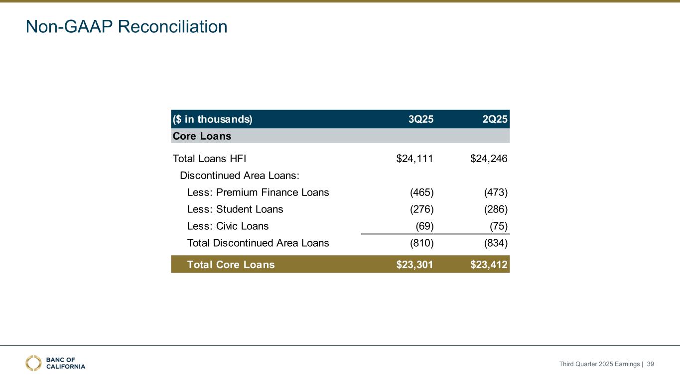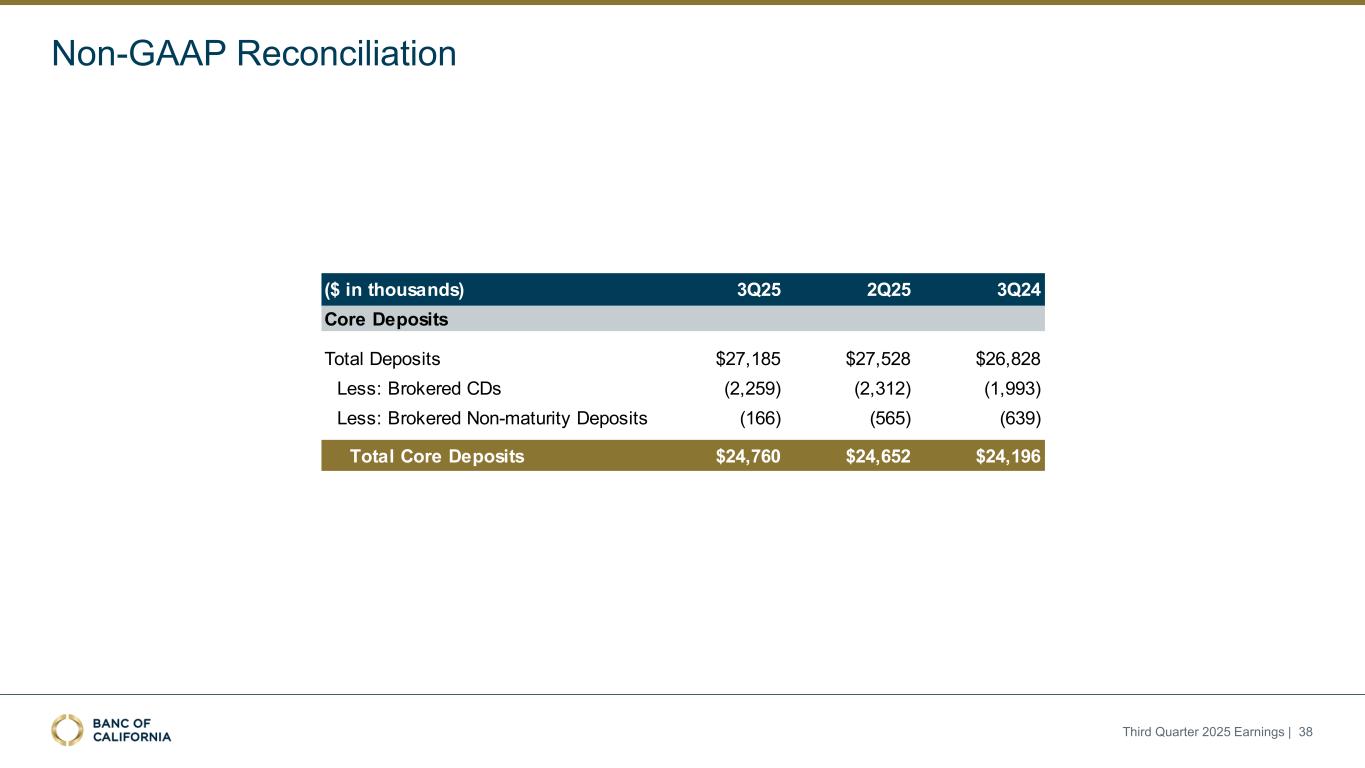 2025年第三季度收益| 38(千美元)3Q25 2Q25 3Q24总存款$ 27,185 $ 27,528 $ 26,828减:经纪CD(2,259)(2,312)(1,993)减:经纪未到期存款(166)(565)(639)总核心存款$ 24,760 $ 24,652 $ 24,196核心存款非公认会计准则调节