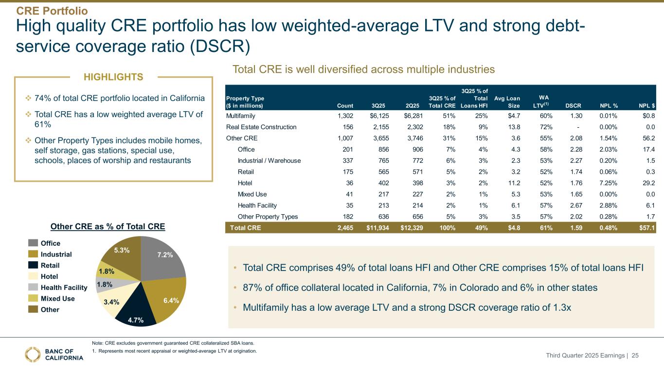 丨74%的CRE总投资组合位于加利福尼亚州丨总CRE的加权平均LTV较低,为61% ↓其他物业类型包括移动房屋、自助仓储、加油站、特殊用途、学校、礼拜场所和餐馆7.2% 6.4% 4.7% 3.4% 1.8% 1.8% 5.3%办公工业零售酒店健康设施混合用途其他其他CRE占CRE总投资的百分比多个行业的总CRE非常多样化•总CRE占总贷款的49% HFI和其他CRE占总贷款的15% HFI • 87%的办公室抵押品位于加利福尼亚州,科罗拉多州7%,其他州6% •多户家庭的平均LTV较低,DSCR覆盖率强劲,为1.3倍注:CRE不包括政府担保的CRE抵押SBA贷款。1.表示起源时最近的评估或加权平均LTV。优质CRE组合加权平均LTV较低和强劲的债务服务覆盖率(DSCR)突出说明2025年第三季度收益| 25物业类型(百万美元)计3Q25 3Q25占总CRE的25% Q3占总贷款的25% HFI平均贷款规模WA LTV(1)DSCR NPL % NPL $ MultiFamily 1,302 $ 6,125 $ 6,28151% 25% $ 4.7 60% 1.30 0.01% $ 0.8房地产建筑1562,1552,30218% 9% 13.872%-0.00 % 0.0其他CRE 1,0073,6553,74631% 15% 3.655% 2.08 1.54% 56.2办公2018569067% 4% 4.358% 2.28 2.03% 17.4工业/仓库3377657726% 3% 2.353%2.27 0.20% 1.5零售1755655715% 2% 3.252% 1.74 0.06% 0.3酒店364023983% 2% 11.252% 1.76 7.25% 29.2混合用途412172272% 1% 5.353% 1.65 0.000% 0.0健康设施352132142% 1% 6.157% 2.67 2.88% 6.1其他财产类型1826366565% 3% 3.557% 2.02 0.28% 1.7 CRE总额2,465 $ 11,934 $ 12,329100% 49% $ 4.861% 1.59 0.48% $ 57.1 CRE投资组合