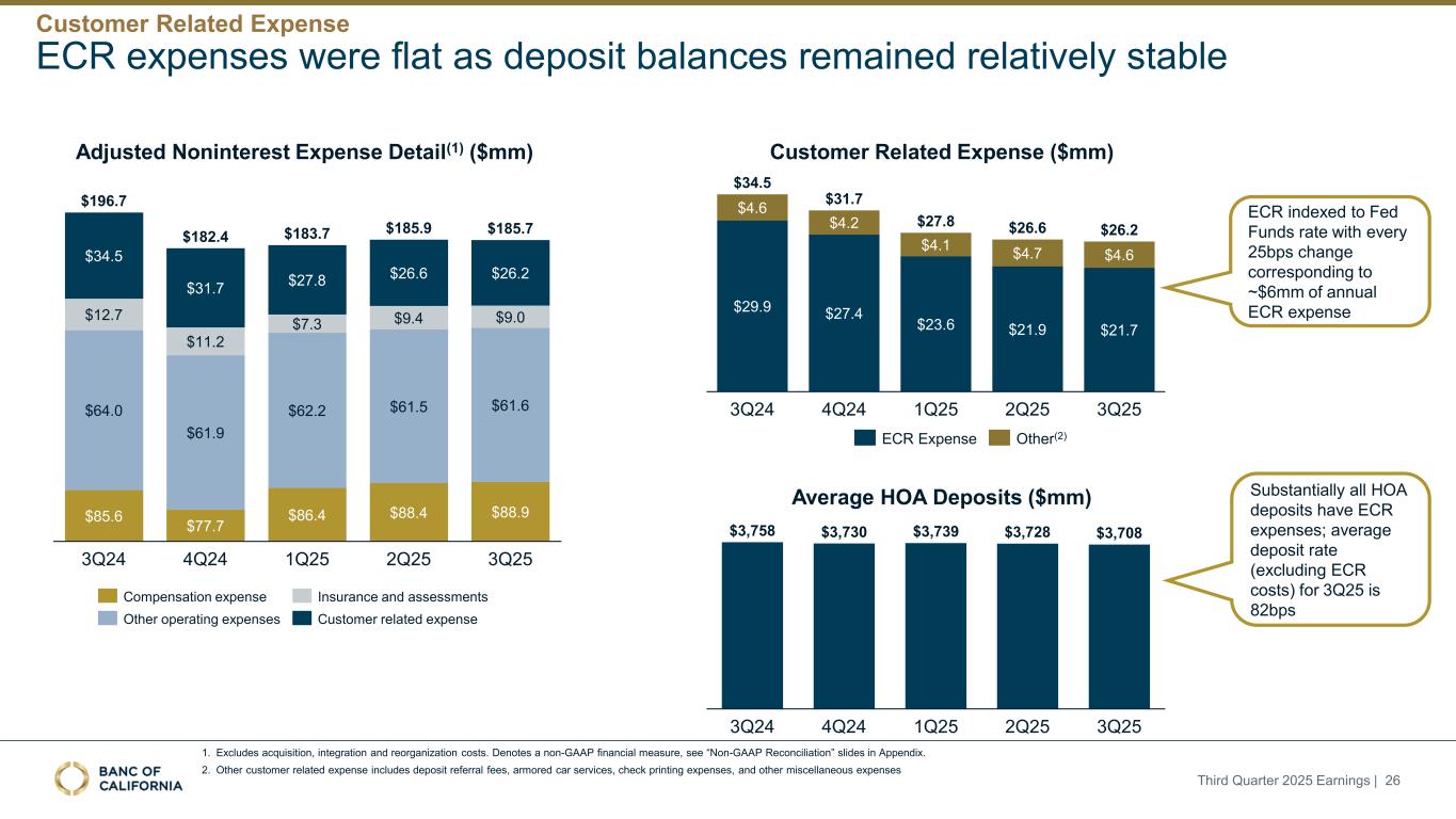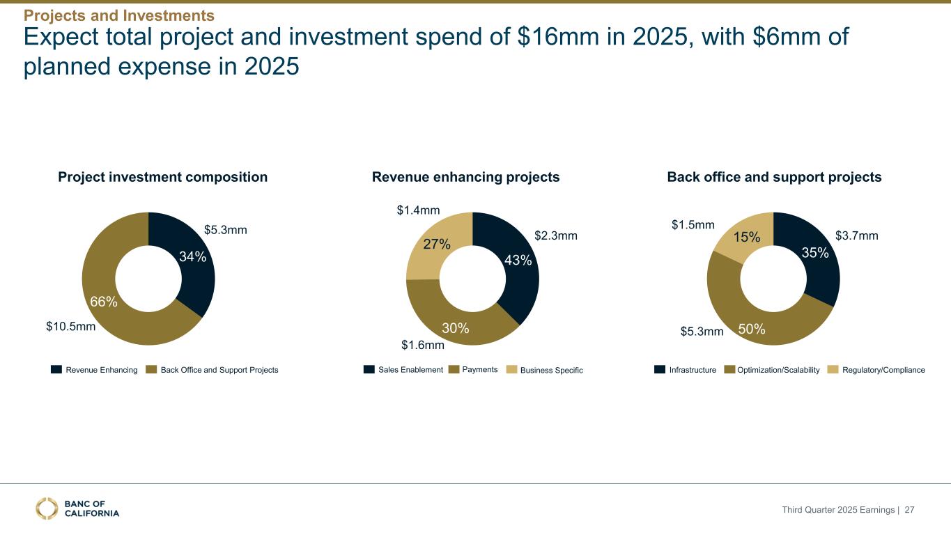 调整后非利息费用详情(1)($ mm)$ 34.5 $ 12.7 $ 64.0 $ 85.6 3Q24 $ 31.7 $ 11.2 $ 61.9 $ 77.7 4Q24 $ 27.8 $ 7.3 $ 62.2 $ 86.4 1Q25 $ 26.6 $ 9.4 $ 61.5 $ 88.4 2Q25 $ 26.2 $ 9.0 $ 61.6 $ 88.9 3Q25 $ 196.7 $ 18 2.4 $ 183.7 $ 185.9 $ 185.7补偿费用其他运营费用保险和评估客户相关费用客户相关费用($ mm)$ 29.9 $ 4.6 3Q24 $ 27.4 $ 4.2 Q4 24 $ 23.6 $ 4.1 1Q25 $ 21.9 $ 4.7 2Q25 $ 21.7 $ 4.6 3Q25 $ 34.5 $ 31.7 $ 27.8 $ 26.6 $ 26.2 ECR费用其他(2)1。不包括收购、整合和重组成本。表示非GAAP财务指标,见附录“非GAAP调节”幻灯片。2.其他客户相关费用包括存款介绍费、装甲车服务、支票打印费用和其他杂项费用ECR费用持平,因为存款余额保持相对稳定3Q24 4Q24 1Q25 2Q25 3Q25 $ 3,758 $ 3,730 $ 3,739 $ 3,728 $ 3,708平均HOA存款($ mm)ECR与联邦基金利率挂钩,每变化25bps对应约6mm的年度ECR费用基本上所有HOA存款都有ECR费用;3Q25的平均存款利率(不包括ECR成本)为82bps 2025年第三季度收益| 26客户相关费用