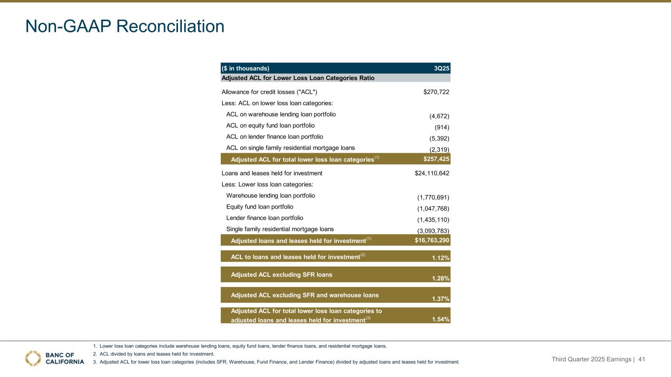 非公认会计原则和解1。损失较低的贷款类别包括仓库借贷贷款、股权基金贷款、贷方融资贷款和住宅抵押贷款。2.ACL除以为投资而持有的贷款和租赁。3.调整后的ACL用于较低损失贷款类别(包括SFR、仓库、Fund Finance和Lender Finance)除以调整后的贷款和为投资而持有的租赁。2025年第三季度收益| 41(千美元)3Q25信贷损失准备金(“ACL”)270,722美元减:较低损失贷款类别的ACL:仓库贷款贷款组合的ACL(4,672)股权基金贷款组合的ACL(914)贷方融资贷款组合的ACL(5,392)单户住宅抵押贷款组合的ACL(2,319)调整后的总较低损失贷款类别的ACL(1)257,425美元的贷款和为投资而持有的租赁24,110,642美元减:较低损失贷款类别:仓库贷款贷款组合(1,770,691)股权基金贷款组合(1,047,768)贷方融资贷款组合(1,435,110)单户住宅抵押贷款(3,093,783)调整后的贷款和为投资而持有的租赁(1)16,763,290美元ACL为贷款和为投资而持有的租赁(2)1.12%调整后ACL不包括SFR贷款1.28%调整后ACL不包括SFR和仓库贷款1.37%调整后ACL为总的较低损失贷款类别调整为调整后的贷款和为投资而持有的租赁(3)1.54%调整后ACL为较低损失贷款类别比率