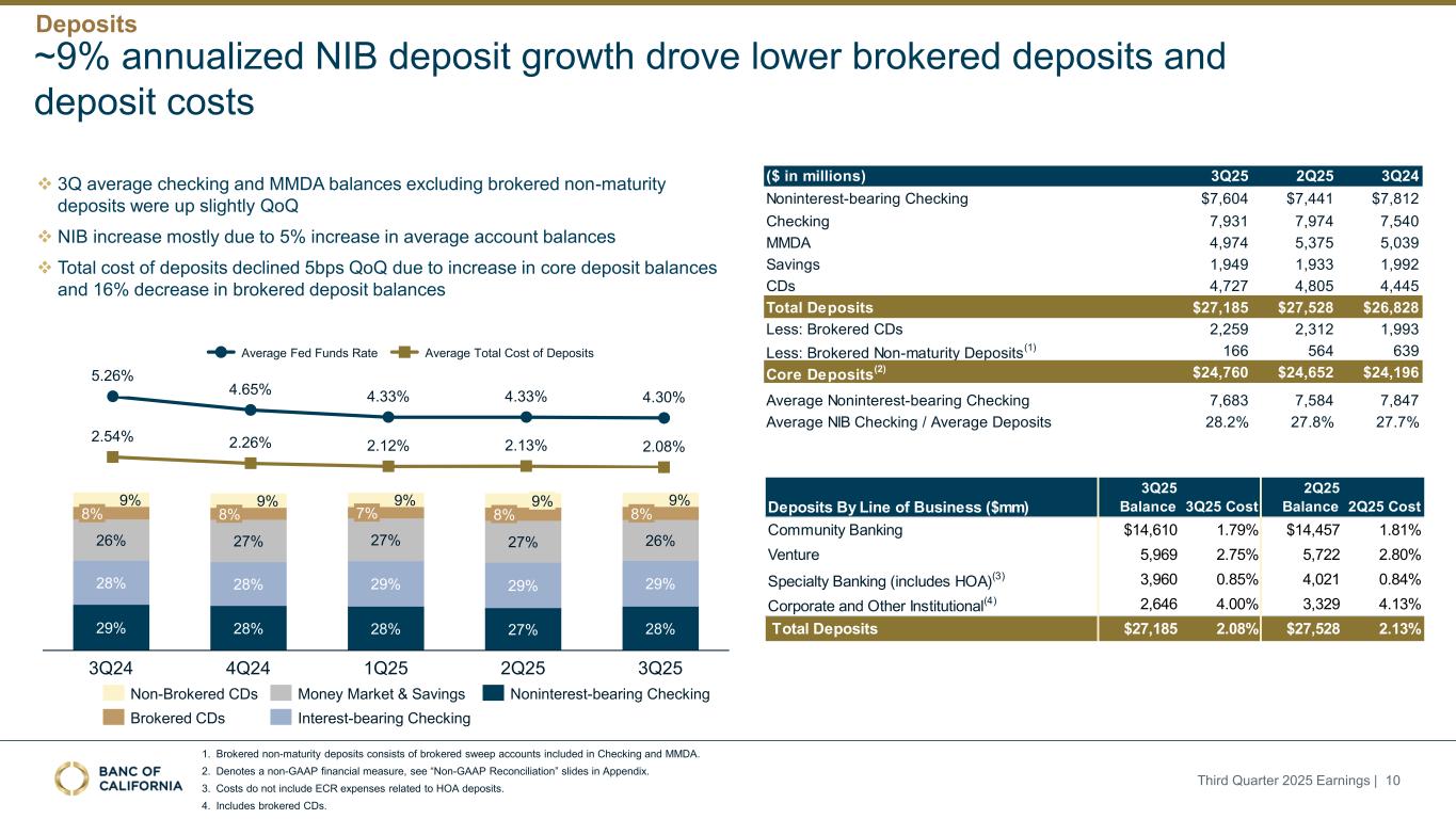 ︱继续专注于继续推动积极的经营杠杆,同时仍将投资于技术和人才以支持长期增长丨九月份降息对客户相关费用的好处将在第四季度实现调整后的非利息费用/平均资产比率(1)1。不包括收购、整合和重组成本。表示非GAAP财务指标,见附录“非GAAP调节”幻灯片。2.表示非GAAP财务指标,见附录“非GAAP对账”幻灯片。非利息费用持平,驾驶效率比环比下降超3% 68.04% 65.96% 66.35% 65.50% 62.05% 63.49% 61.34% 62.43% 61.77% 58.24% 3Q24 4Q24 1Q25 2Q25效率比(2)调整后效率比不包括客户相关费用调整后效率比(2)2025年第三季度收益| 9(百万美元)3Q25 2Q25 3Q24薪酬88.9美元88.4美元85.6美元占用15.4 15.5 16.9 IT和数据处理13.51 3.115.0专业服务5.46.45.1保险和评估9.09.41 2.7无形资产摊销7.27.28.5租赁设备折旧6.86.77.1贷款费用4.9 4.14.0收购,整合和重组成本0.0 0.0(0.5)其他费用8.48.77.3客户相关费用26.2 26.63 4.5非利息费用总额$ 185.7 $ 185.9 $ 196.2调整后非利息费用(1)$ 185.7 $ 185.9 $ 196.7调整后非利息费用不包括客户相关费用(1)$ 159.3 $ 159.3 $ 162.22.27% 1.87% 3Q24 2.16% 1.79% 4Q24 2.24% 1.90% 1Q25 2.21% 1.89% 2Q25 2.18% 1.87% 3Q25调整后非利息费用/平均资产比率调整后非利息费用不包括客户相关费用/平均资产比率非利息费用