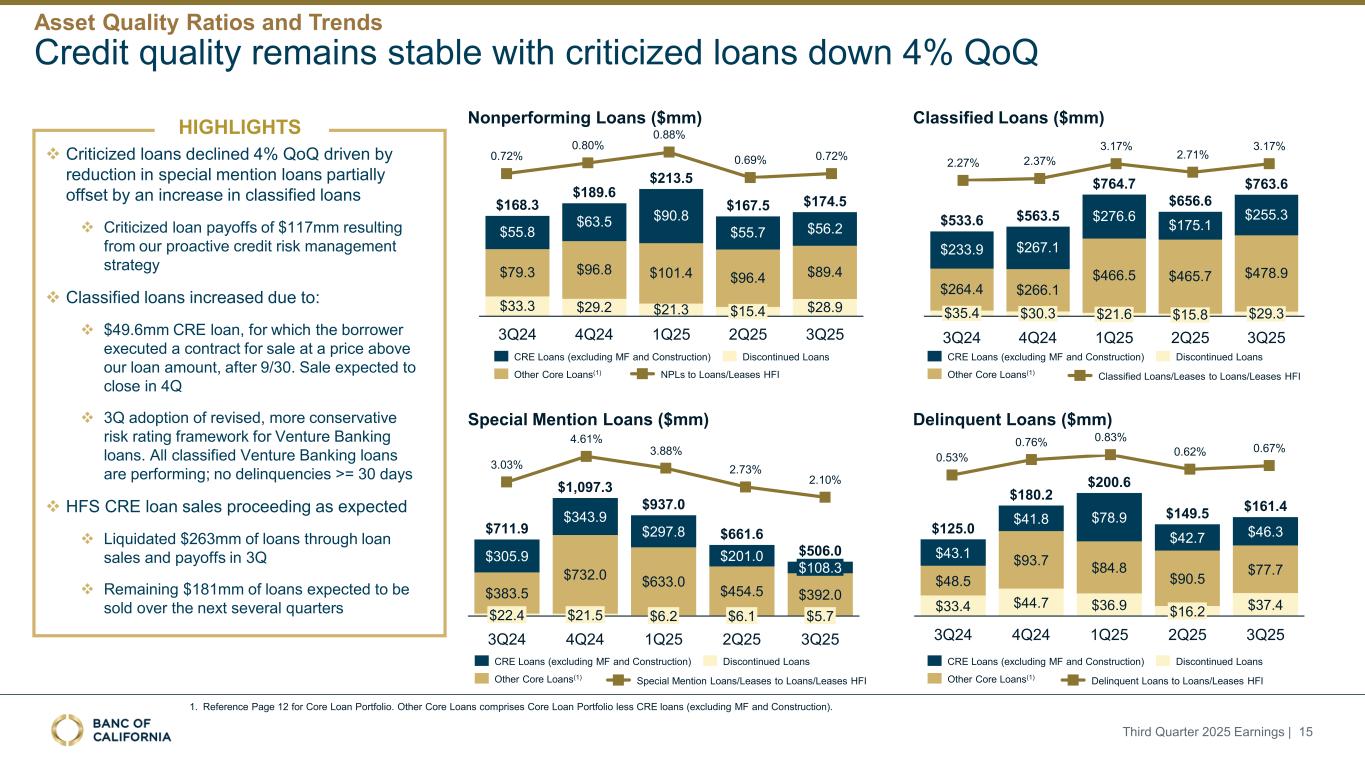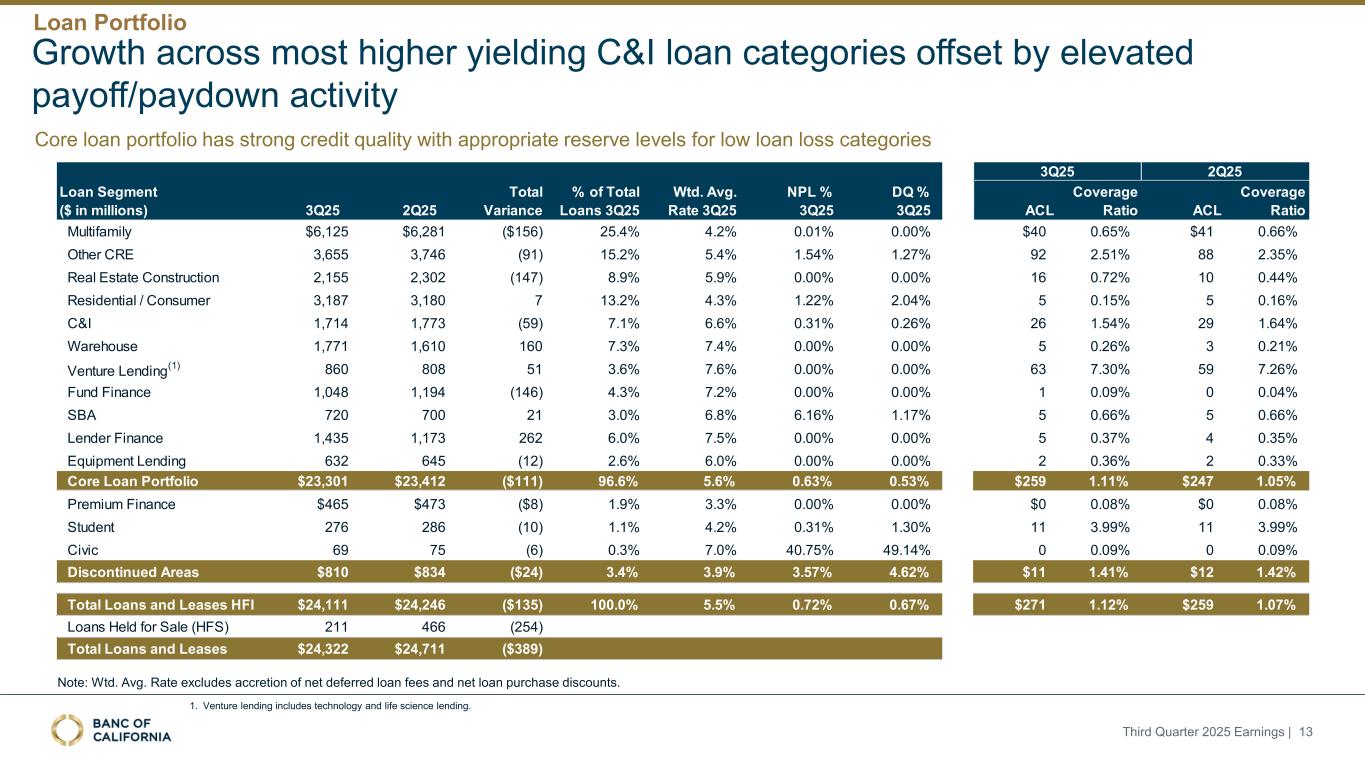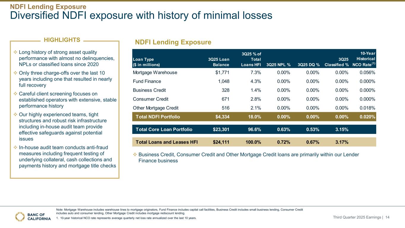 大多数高收益C & I贷款类别的增长被更高的偿付/还款活动所抵消注:WTD。平均。利率不包括净递延贷款费用和净贷款购买折扣的增加。1.风险贷款包括技术和生命科学贷款。2025年第三季度收益| 13核心贷款组合具有较强的信用质量,具有适当的低贷款损失类别准备金水平贷款组合3Q25 2Q25 3Q25 2Q25 Total variance % of total loans 3Q25 WTD。平均。Rate 3Q25 NPL % 3Q25 DQ % 3Q25 ACL覆盖率ACL覆盖率Multifamily $ 6,125 $ 6,281($ 156)25.4% 4.2% 0.01% 0.00 % $ 400.65% $ 410.66% Other CRE 3,6553,746(91)15.2% 5.4% 1.54% 1.27% 92 2.51% 88 2.35% Real Estate Construction 2,1552,302(147)8.9% 5.9% 0.00 % 0.00 % 160.72% 100.44% Residential/Consumer 3,1873,180713.2% 4.3% 1.22% 2.04% 50.15% 50.16% C & I 1,7141,773(59)7.1% 6.6% 0.31% 0.26% 261.54% 291.64%仓库1,7711,6101607.3% 7.4% 0.00 %00% 50.26% 30.21% Venture Lending(0.00 %.00% 637.30% 597.26%基金财务1,0481,194(146)4.3% 7.2% 0.00 %.00% 10.09% 00.04% SBA 720700213.0% 6.8% 6.16% 1.17% 50.66% 50.66% Lender Finance 1,4351,1732626.0% 7.5% 0.00 %.00% 50.37% 40.35% Equipment Lending 632645(12)2.6% 6.0% 0.00 %.00% 20.36% 20.33% Core Loan Portfolio $ 23,301 $ 23,412($ 111)96.6% 5.6% 0.63% 0.53% $ 2591.11% $ 2471.05% Premium Finance $ 465 $ 473($ 8)1.9% 3.3% 0.00 %.00% 00.08% $ 00.08%学生276286(10)1.1% 4.2% 0.31% 1.30% 113.99% 113.99(6)0.3% 7.0% 40.75% 49.14% 00.09% 00.09%停产地区$ 810 $ 834($ 24)3.4% 3.9% 3.57% 4.62% $ 111.41% $ 121.42%贷款和租赁总额HFI $ 24,111 $ 24,246($ 135)100.0% 5.5% 0.72% 0.67% $ 2711.12% $ 2591.07%待售贷款(HFS)211466(254)贷款和租赁总额$ 24,322 $ 24,711($ 389)贷款部分(百万美元)