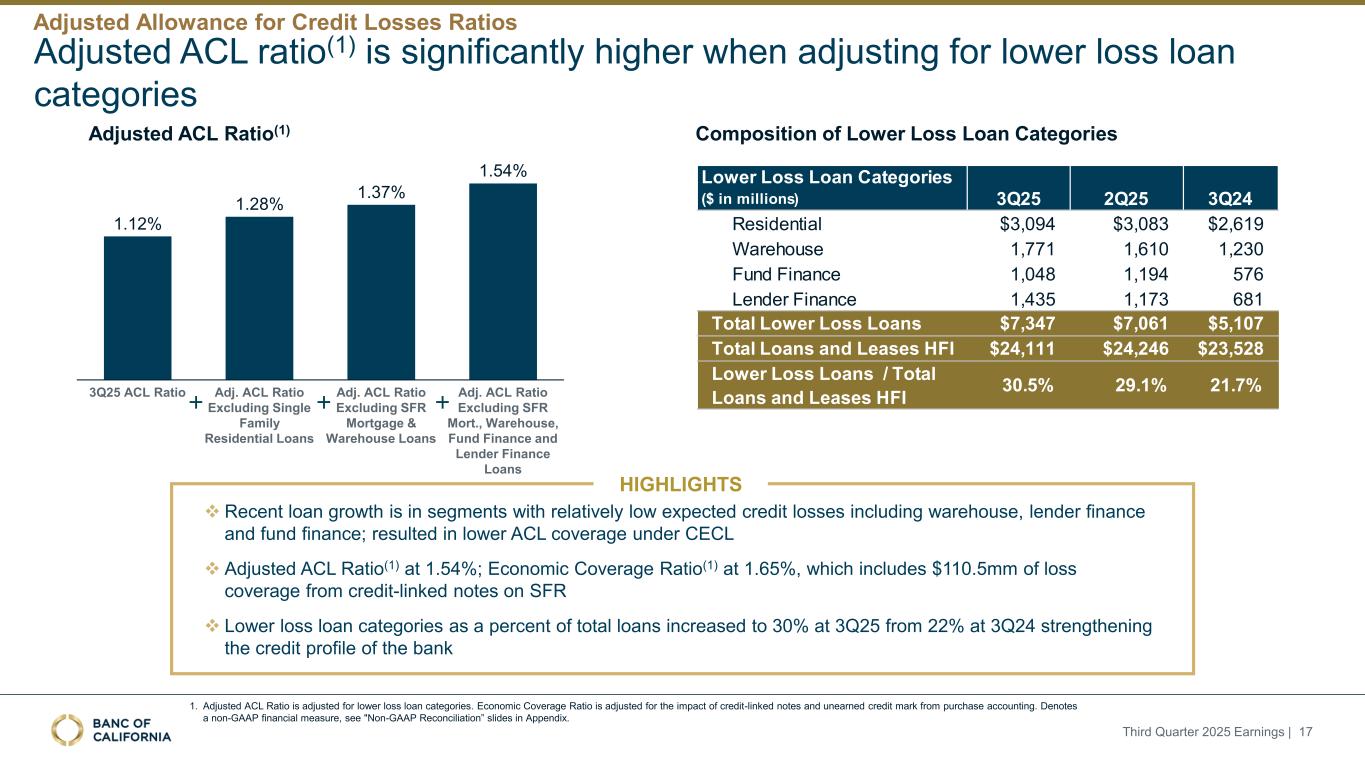 调整后的ACL比率(1)在调整较低损失贷款类别时显着更高调整后的ACL比率(1)较低损失贷款类别的构成丨近期贷款增长在预期信用损失相对较低的细分领域,包括仓库、贷方融资和基金融资;导致CECL下的ACL覆盖率较低丨调整后的ACL比率(1)为1.54%;经济覆盖率(1)为1.65%,其中包括在SFR上的信用挂钩票据的110.5mm的损失覆盖率↓较低损失贷款类别占总贷款的百分比从2024年第三季度的22%增加到了25年第三季度的30%,加强了银行的信用状况1.12% 1.28% 1.37% 1.54% 25年第三季度ACL比率调整。ACL比率不包括单户住宅贷款调整。ACL比率不包括SFR抵押和仓库贷款调整。ACL比率不包括SFR Mort.、仓库、基金融资和贷方融资贷款亮点1。调整后的ACL比率针对较低损失贷款类别进行调整。经济覆盖率从采购会计调整信用挂钩票据和未到期信用标记的影响。表示非GAAP财务指标,见附录中的“非GAAP调节”幻灯片。2025年第三季度收益| 17个较低损失贷款类别(百万美元)3Q25 2Q25 3Q24住宅$ 3,094 $ 3,083 $ 2,619仓库1,7711,6101,230基金财务1,0481,194576贷方财务1,4351,173681总较低损失贷款$ 7,347 $ 7,061 $ 5,107总贷款和租赁HFI $ 24,111 $ 24,246 $ 23,528较低损失贷款/总贷款和租赁HFI 30.5% 29.1% 21.7%调整后信贷损失比率备抵