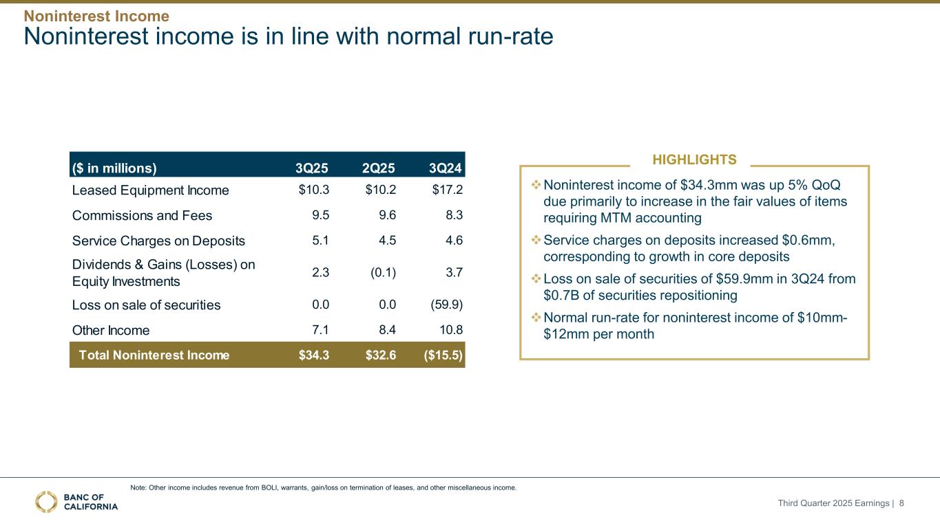 注:其他收入包括BOLI收入、认股权证、终止租赁损益、其他杂项收入。非利息收入符合正常运行率2025年第三季度收益| 8 HIGHLIGHTS丨非利息收入为34.3mm,环比增长5%,这主要是由于需要MTM会计的项目的公允价值增加︱存款服务费增加了0.6mm,对应于核心存款的增长丨由于证券重新定位,3Q24的证券销售损失为59.9mm,为$ 0.7B丨非利息收入的正常运行率为每月$ 10mm-$ 12mm(百万美元)3Q25 2Q25 3Q24租赁设备收入$ 10.3 $ 10.2 $ 17.2佣金和费用9.59.68.3存款服务费5.1 4.54.6股票投资的股息和收益(损失)2.3(0.1)3.7证券销售损失0.0 0.0(59.9)其他收入7.18.4 10.8非利息收入总额34.3美元32.6美元(15.5美元)非利息收入