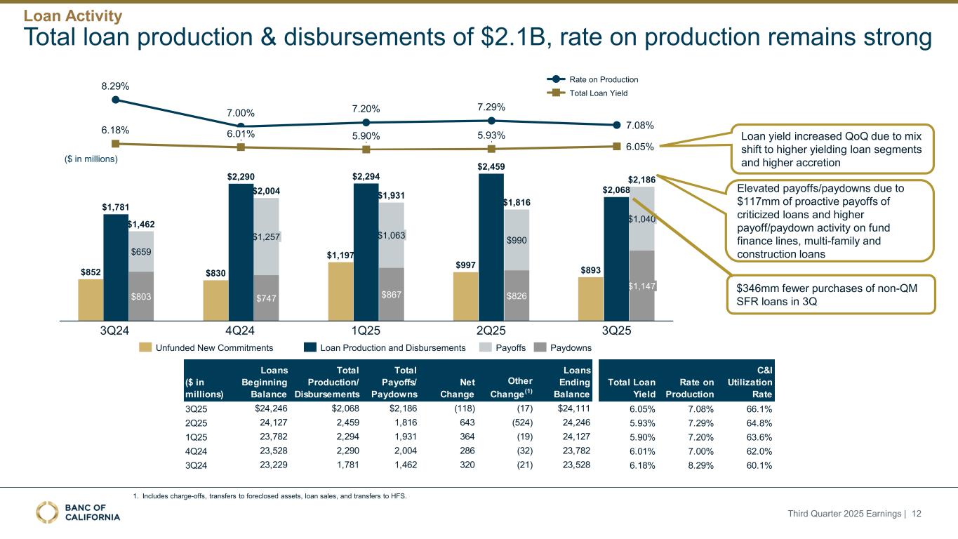 659美元803美元1,257美元747美元1,063美元867美元990美元826美元1,040美元1,147美元1,462美元2,004美元1,931美元1,816美元2,1868.29% 7.00% 7.20% 7.29% 7.08% 6.18% 5.90% 5.93% 6.05% 6.01%生产总贷款收益率(百万美元)1。包括冲销、转移到止赎资产、贷款出售以及转移到HFS。贷款生产和支付总额为$ 2.1B,生产利率保持强劲2025年第三季度收益| 12 $ 852 $ 830 $ 1,197 $ 997 $ 893支付付款付款未提供资金的新承诺3Q24 4Q24 1Q25 2Q25 3Q25贷款收益率环比上升,原因是混合转向更高收益的贷款部分,以及由于117mm的被批评贷款的主动偿还和基金融资额度的更高支付/偿还活动导致更高的增值提高了支付/偿还,多户家庭和建筑贷款第三季度非QM SFR贷款购买减少346mm美元1781美元2290美元2294美元2459美元2068美元贷款生产和支出(百万美元)贷款期初余额生产总额/支出总额支付/支付净额变化其他变化(1)贷款期末余额生产总贷款收益率C & I利用率3Q25 $ 24,246 $ 2,068 $ 2,186(118)(17)$ 24,1116.05% 7.08% 66.1% 2Q25 24,1272,4591,816643(524)24,2465.93% 7.29% 64.8% 1Q25 23,7822,2941,931364(19)24,1275.90% 7.20% 63.6% 4Q24 23,5282,2902,004286(32)23,7826.01% 7.00% 62.0% 3Q24 23,2291,7811,462320(21)23,5286.18% 8.29% 60.1%贷款活动