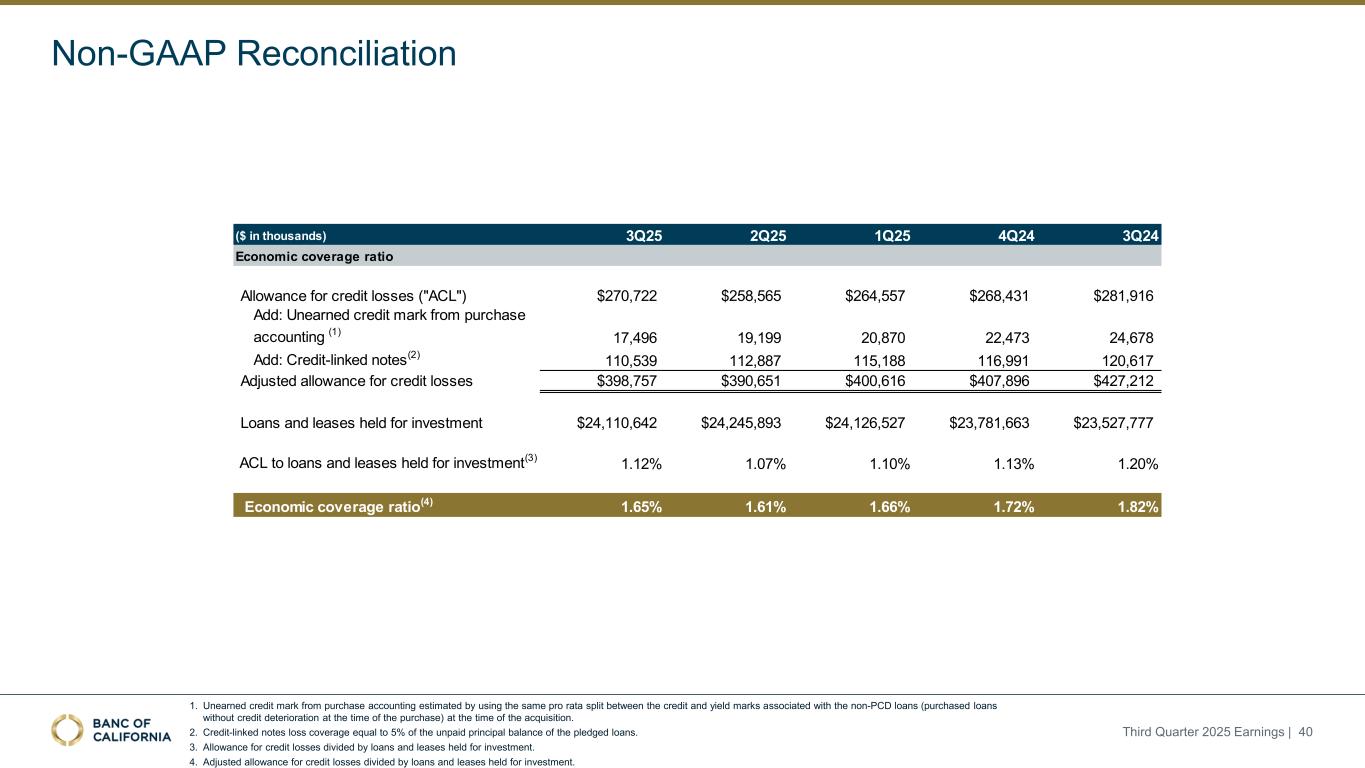 非公认会计原则和解1。采购会计中的未实现信用标记是通过在收购时使用与非PCD贷款(购买时没有信用恶化的购买贷款)相关的信用和收益率标记之间的相同按比例分割估计的。2.信用挂钩票据损失覆盖范围等于质押贷款未偿本金余额的5%。3.信贷损失准备金除以为投资而持有的贷款和租赁。4.调整后的信贷损失准备金除以为投资而持有的贷款和租赁。2025年第三季度收益| 40(单位:千美元)3Q25 2Q25 1Q25 4Q24 3Q24信用损失准备金(“ACL”)270,722美元258,565美元264,557美元268,431美元281,916美元加:采购会计产生的未实现信用标记(1)17,49619,19920,87022,47324,678加:与信用挂钩的票据(2)110,539112,887115,188116,991120,617调整后的信用损失准备金398,757美元390,651美元400,616美元407,896美元427,212美元为投资而持有的贷款和租赁24,110,642美元24,245,893美元24,126,527美元23,781,663美元23,527,