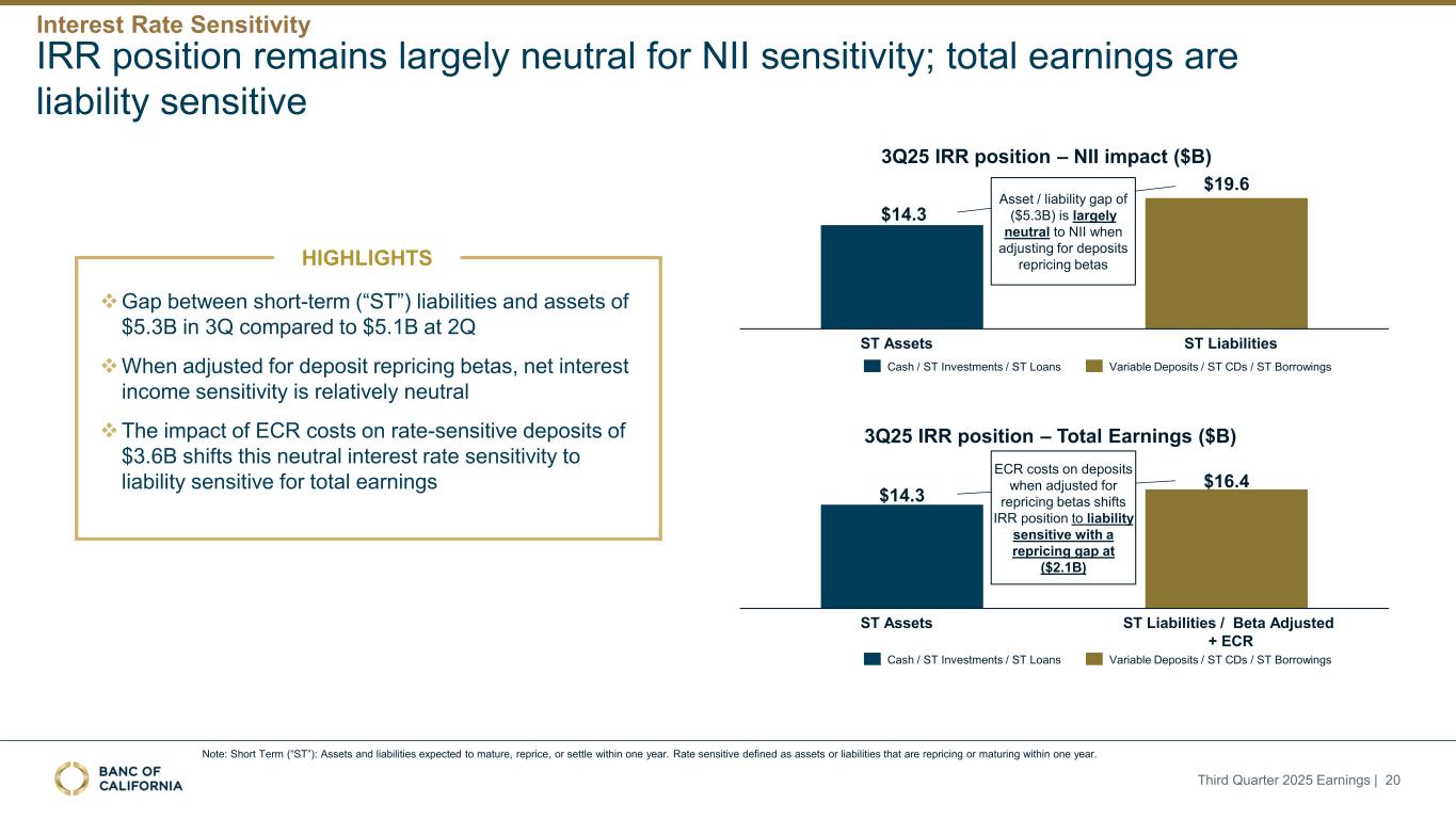 2025年第三季度收益| 20IRR头寸对NII敏感性基本保持中性;总收益对负债敏感3Q25 IRR头寸– NII影响($ B)丨短期(“ST”)负债和资产之间的差距在第三季度为$ 5.3b,而第二季度为$ 5.1b丨经存款重定价贝塔调整后,净利息收入敏感性相对中性↓ ECR成本对利率敏感存款的影响$ 3.6B将这种中性利率敏感性转移到对负债敏感的总收益亮点$ 14.3 $ 19.6 ST Assets ST Liabilities资产/负债缺口($ 5.3B)在调整存款重新定价betas 3Q25 IRR头寸时对NII基本上是中性的–总收益($ B)$ 14.3 $ 16.4 ST Assets ST Liabilities/Beta Adjusted + ECR ECR成本调整后存款对于重定价beta将IRR头寸转移至负债敏感,重定价缺口为($ 2.1b)现金/ST投资/ST贷款现金/ST投资/ST贷款可变存款/ST CDS/ST借款可变存款/ST CDS/ST借款利率敏感性注:短期(“ST”):预计在一年内到期、重新定价或结算的资产和负债。利率敏感定义为一年内重新定价或到期的资产或负债。