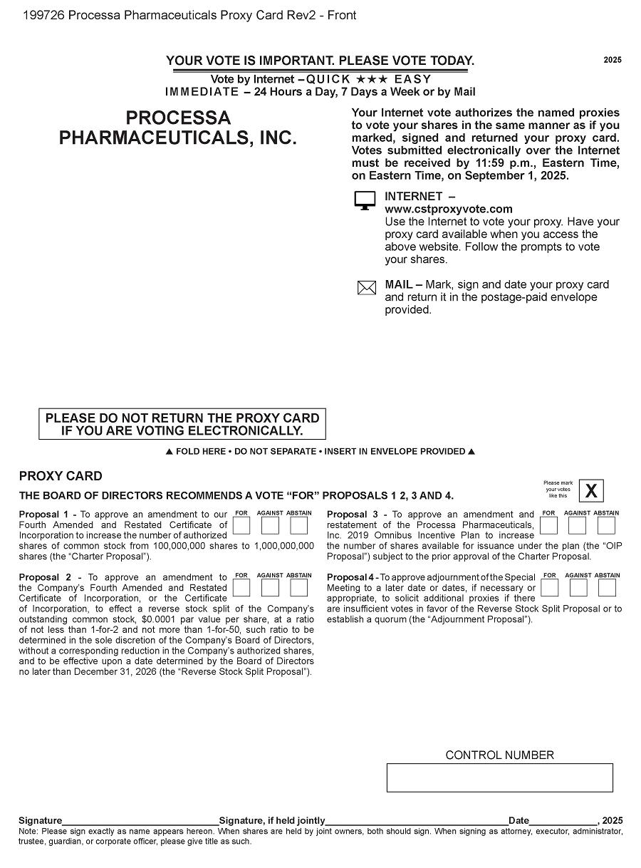 本委托书是在特拉华州公司Processa Pharmaceuticals, Inc.(“Processa”、“公司”、“我们”、“我们的”或“我们”)的董事会(“董事会”)征集代理时提供的,供将于2025年9月2日东部时间下午1:00开始在601 21st Street,Suite 300,Vero Beach,FL,32960以及在任何延期或休会时举行的股东特别会议(“特别会议”)上使用。本委托书及特此征集的委托书将于2025年8月13日或前后首次发送或交付给公司股东。