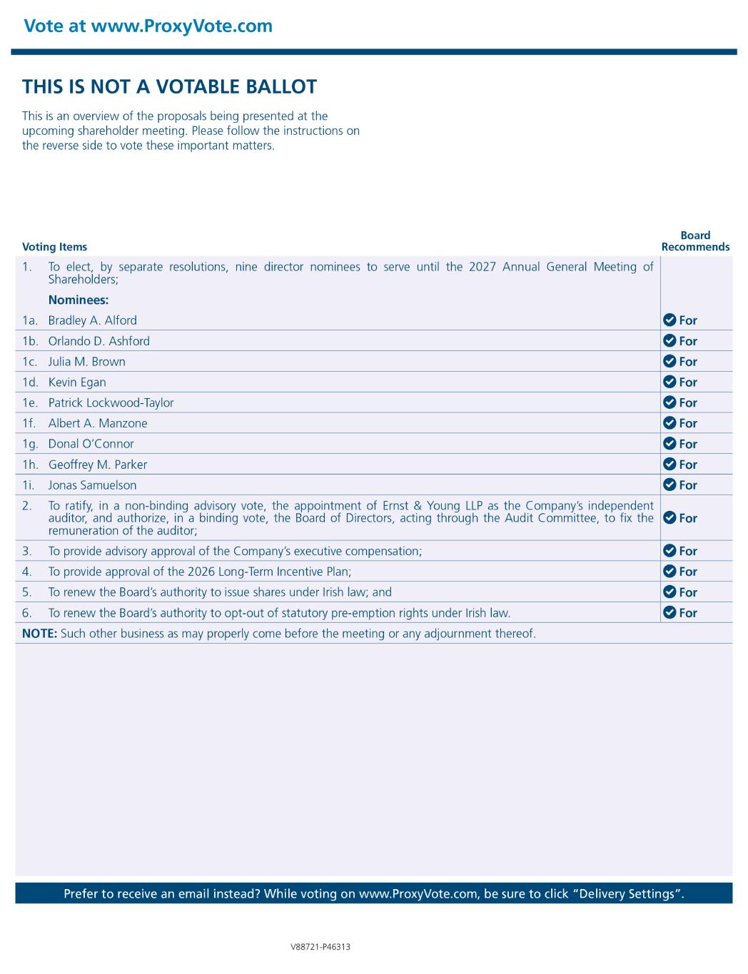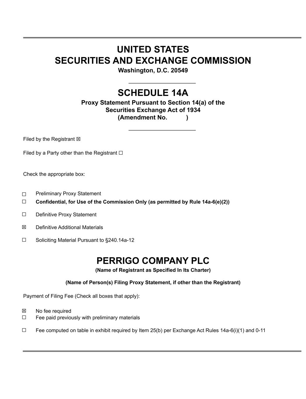 美国证券交易委员会华盛顿特区20549附表14a根据1934年《证券交易法》第14(a)节的代理声明(修正案编号:)由注册人提交由注册人以外的一方提交☐在相应的框中选中:☐初步代理声明丨丨☐属机密,仅供委员会使用(在规则14a-6(e)(2)允许的情况下)☐TERM3最终代理声明最终附加材料丨☐丨根据§ 240.14a-12 PerRIGO COMPANY PLC(注册人的名称在其章程中指定)征集材料(提交代理声明的人的姓名,如果不是注册人)支付申报费(勾选所有适用的框):无需支付费用☐费用先前使用初步材料支付的☐费用根据《交易法》规则14a-6(i)(1)和0-11的要求,在展品中的表格上计算第25(b)项计算的费用