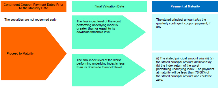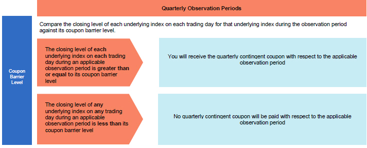 这些证券为投资者提供了一个赚取季度或有息票支付的机会,该金额相当于每份证券31.25美元(占规定本金金额的3.125%),相对于不发生息票障碍事件的每个季度观察期而言。观察期内任何标的指数的收盘水平低于该标的指数在该观察期内任何交易日的票息障碍水平的,将在观察期内发生票息障碍事件。季度或有息票支付(如有的话)将于相关或有息票支付日(即相关观察期结束日后的第三个营业日)按季度支付,或就季度或有息票支付(如有的话)就最后观察期而言为到期日。若观察期内发生票息障碍事件,投资者在相关的或有票息支付日将不会收到季度或有票息支付。有可能在证券期限内的部分或全部观察期发生票息障碍事件,因此您将收到很少或没有季度或有票息支付。我们将这些付款称为或有付款,因为无法保证您将在任何或有息票支付日收到付款。