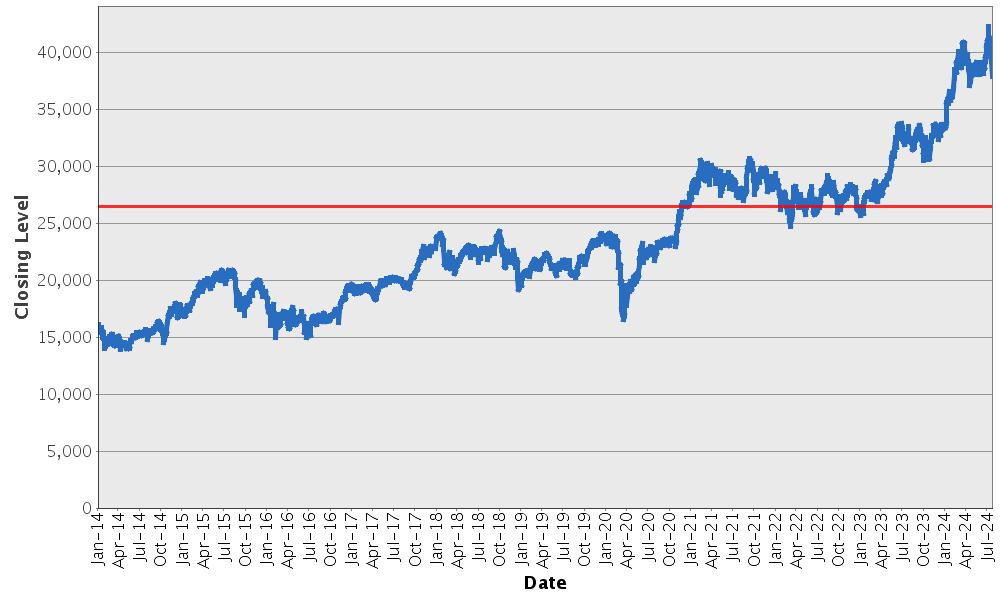 下图显示了日经225指数在2014年1月2日至2024年7月25日期间每一天的收盘水平。我们从Bloomberg L.P.获得了收盘水平,未经独立验证。你不应该把日经225指数的历史水平作为未来表现的指标。