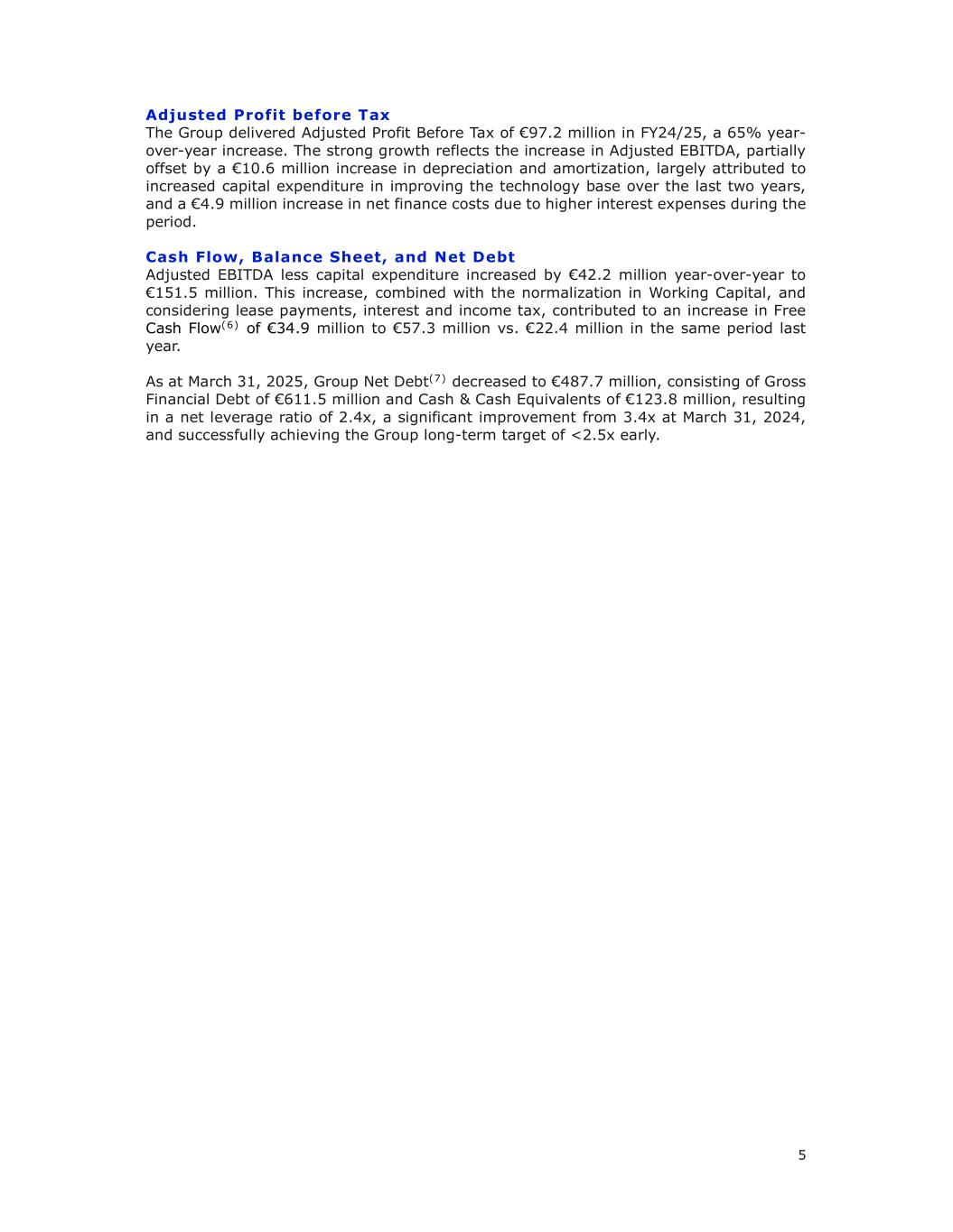 5调整后税前利润集团在24/25财年实现调整后税前利润9720万欧元,同比增长65%。强劲增长反映了调整后EBITDA的增长,但被折旧和摊销增加1060万欧元部分抵消,这主要归因于过去两年改善技术基础的资本支出增加,以及由于期间利息支出增加导致净财务成本增加490万欧元。现金流、资产负债表和净债务调整后EBITDA减去资本支出后同比增长4220万欧元,达到1.515亿欧元。这一增长,加上营运资金正常化,并考虑到租赁付款、利息和所得税,导致自由现金流(6)增加3490万欧元至5730万欧元,而去年同期为2240万欧元。截至2025年3月31日,集团净债务(7)减少至4.877亿欧元,包括6.115亿欧元的总金融债务和1.238亿欧元的现金及现金等价物,导致净杠杆率为2.4倍,较2024年3月31日的3.4倍有显着改善,并成功提前实现< 2.5倍的集团长期目标。