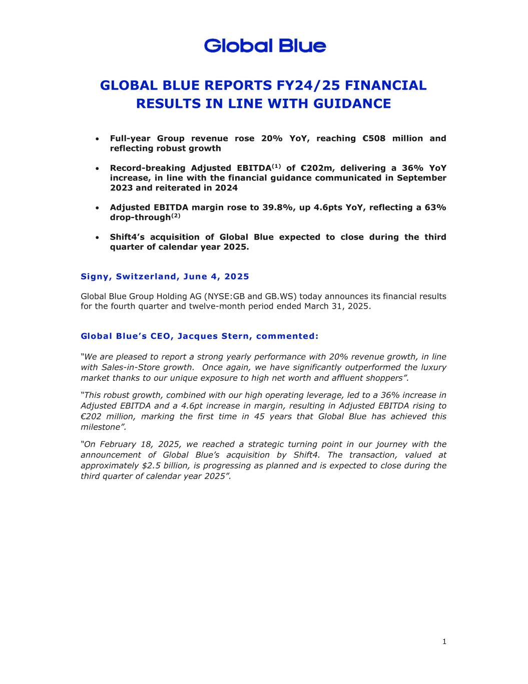 1 GLOBAL BLUE报告24/25财年财务业绩符合指引全年集团收入同比增长20%,达到5.08亿欧元,反映出强劲增长——打破纪录的调整后EBITDA(1)为2.02亿欧元,同比增长36%,符合2023年9月传达的财务指引,并在2024年重申调整后EBITDA利润率升至39.8%,同比增长4.6pts,反映出63%的下降(2)Shift4对预计将于2025年第三季度完成的Global Blue的收购。瑞士西格尼,2025年6月4日丨Global Blue集团控股股份公司(纽约证券交易所代码:GB和GB.WS)今天公布了截至2025年3月31日的第四季度和十二个月期间的财务业绩。Global Blue的首席执行官Jacques Stern评论说:“我们很高兴地报告强劲的年度业绩,收入增长20%,与店内销售增长一致。再一次,我们的表现明显优于奢侈品市场,这要归功于我们对高净值和富裕购物者的独特敞口”。“这种强劲的增长,加上我们较高的经营杠杆,导致调整后EBITDA增长36%,利润率提高4.6pt,导致调整后EBITDA升至2.02亿欧元,这是45年来Global Blue首次实现这一里程碑”。“2025年2月18日,随着SHIFT4宣布收购Global Blue,我们到达了征程的战略转折点。该交易价值约25亿美元,正按计划推进,预计将于2025年第三季度完成。”