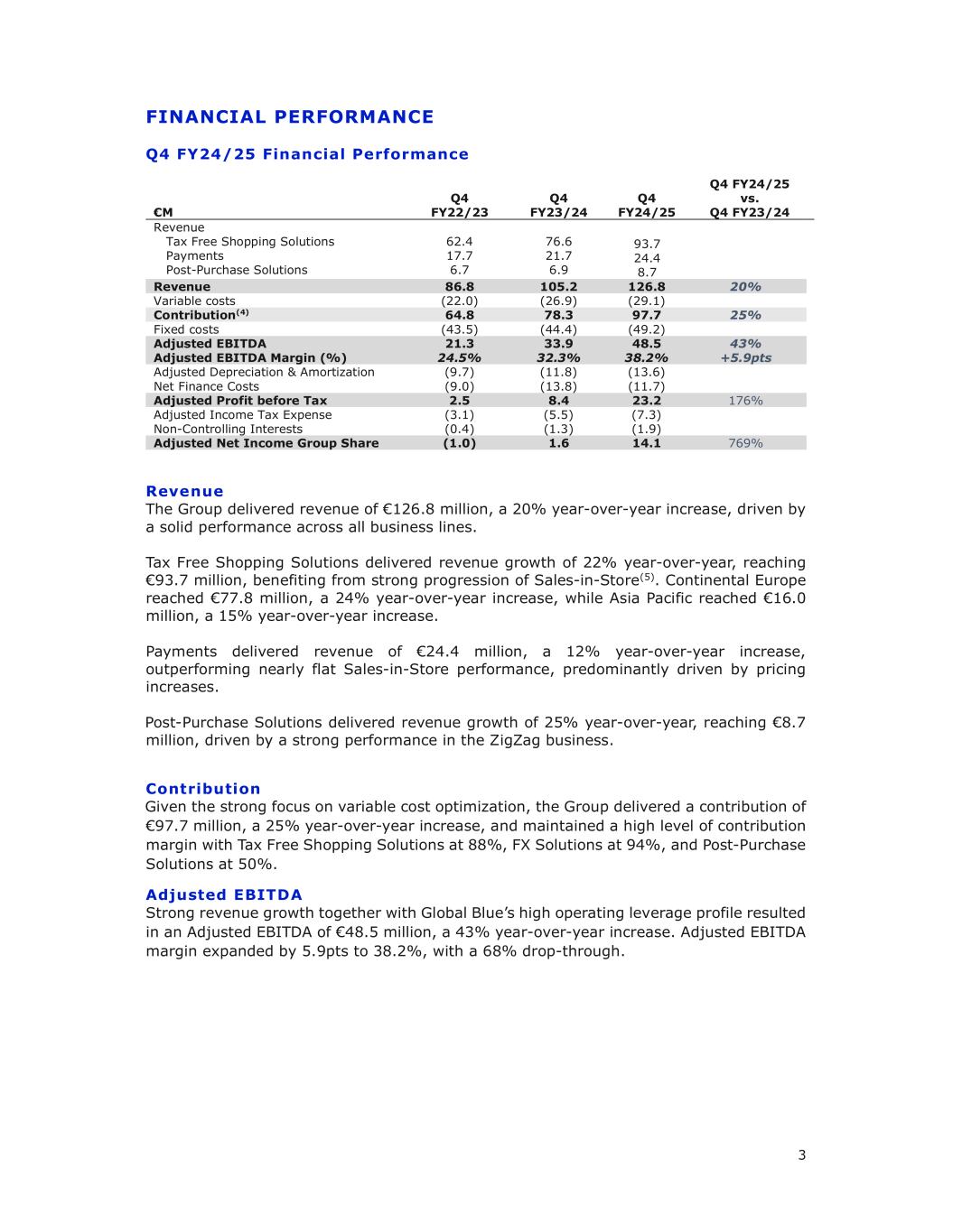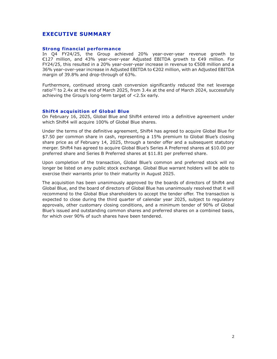 2执行摘要24/25财年Q4财务表现强劲,集团实现收入同比增长20%至1.27亿欧元,调整后EBITDA同比增长43%至4900万欧元。对于24/25财年,这导致收入同比增长20%至5.08亿欧元,调整后EBITDA同比增长36%至2.02亿欧元,调整后EBITDA利润率为39.8%,降幅为63%。此外,持续强劲的现金转换显着降低净杠杆率(3)至2025年3月底的2.4x,由2024年3月底的3.4x,成功提早实现集团< 2.5x的长期目标。ShifT4收购Global Blue于2025年2月16日,Global Blue与ShifT4订立最终协议,根据该协议,ShifT4将收购Global Blue 100%的股份。根据最终协议的条款,ShifT4已同意通过要约收购和随后的法定合并,以每股普通股7.50美元的现金收购Global Blue,较Global Blue截至2025年2月14日的收盘股价溢价15%。Shift4已同意以每股优先股10.00美元的价格收购Global Blue的A系列优先股,以每股优先股11.81美元的价格收购B系列优先股。交易完成后,Global Blue的普通股和优先股将不再在任何公共证券交易所上市。Global Blue认股权证持有人将能够在2025年8月认股权证到期之前行使其认股权证。本次收购事项已获得ShifT4、Global Blue董事会全票通过,Global Blue董事会一致决议,将向Global Blue股东推荐接受要约收购。该交易预计将在2025年第三季度完成,但需获得监管部门的批准、其他惯例成交条件,以及最低投标比例为合并计算的Global Blue已发行和流通普通股和优先股的90%,其中超过90%的此类股份已被投标。