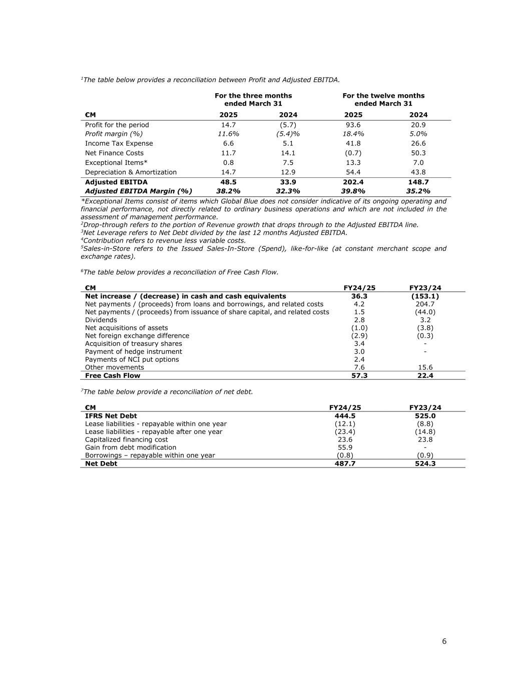 61下表提供了利润与调整后EBITDA之间的对账。截至3月31日止三个月截至3月31日止十二个月欧元2025202420252024期内溢利14.7(5.7)93.62 0.9利润率(%)11.6%(5.4)% 18.4% 5.0%所得税开支6.65.14 1.8 26.6净财务成本11.71 4.1(0.7)50.3特殊项目*0.87.51 3.37.0折旧和摊销14.71 2.95 4.44 3.8调整后EBITDA 48.53 3.9 202.41 48.7调整后EBITDA利润率(%)38.2% 32.3% 39.8% 35.2%*特殊项目包括Global Blue认为不能表明其持续经营和财务业绩的项目,与日常经营业务无直接关系且未纳入经营管理绩效考核的。2Drop-through是指收入增长下降到调整后EBITDA线的部分。3净杠杆是指净债务除以过去12个月的调整后EBITDA。4贡献指收入减去可变成本。5Sales-in-store是指已发行的Sales-in-store(Spend),like-for-like(按不变的商户范围和汇率)。6下表提供了自由现金流的对账。百万欧元FY24/25 FY23/24现金及现金等价物净增加/(减少)36.3(153.1)贷款和借款的净付款/(收益)及相关成本4.2204.7发行股本的净付款/(收益)及相关成本1.5(44.0)股息净收购资产2.8(1.0)3.2(3.8)净汇差(2.9)(0.3)收购库存股3.4-支付对冲工具3.0-支付NCI看跌期权2.4其他变动7.6 15.6自由现金流57.32 2.47下表提供了净债务的对账。欧元m FY24/25 FY23/24 IFRS净债务444.55 25.0租赁负债-一年内偿还(12.1)(8.8)租赁负债-一年后偿还(23.4)(14.8)资本化融资成本23.62 3.8债务修改收益55.9-借款-一年内偿还(0.8)(0.9)净债务487.75 24.3