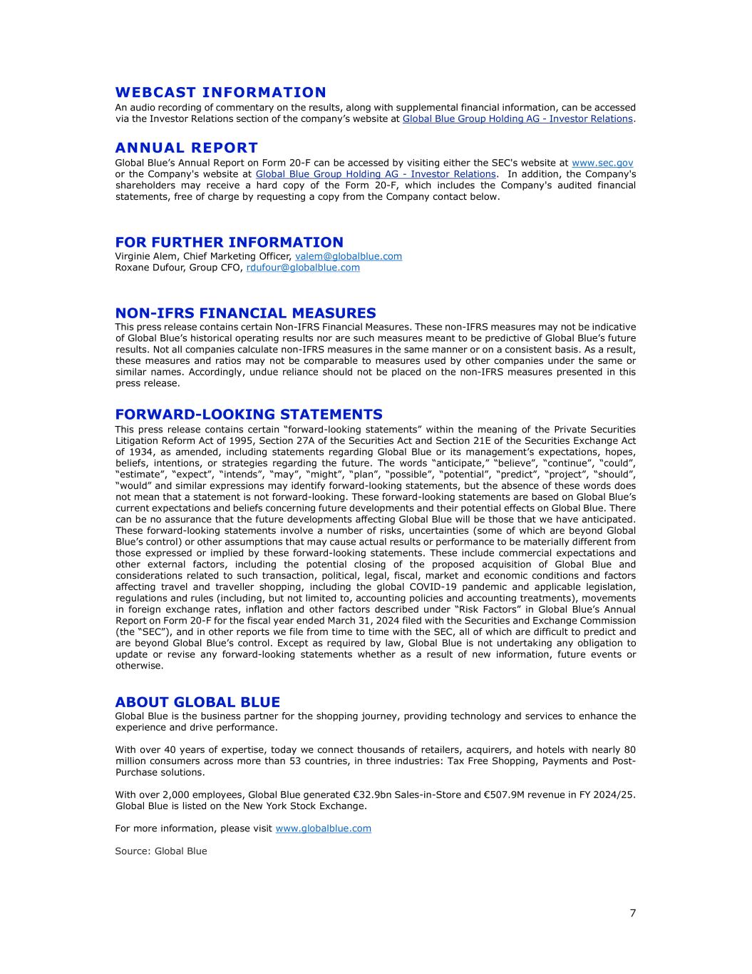 7网络广播信息有关业绩评论的录音以及补充财务信息,可通过公司网站投资者关系部分访问,网址为:Global Blue Group Holding AG-投资者关系。年度报告Global Blue的20-F表格年度报告可通过访问美国证券交易委员会网站www.sec.gov或公司网站Global Blue Group Holding AG-投资者关系访问。此外,公司股东可通过向以下公司联系人索取一份副本,免费获得包含公司经审计财务报表的20-F表格的硬拷贝。欲了解更多信息Virginie Alem,首席营销官,valem@globalblue.com Roxane Dufour,集团首席财务官,rdufour@globalblue.com非国际财务报告准则财务措施本新闻稿包含某些非国际财务报告准则财务措施。这些非国际财务报告准则的衡量标准可能并不代表Global Blue的历史经营业绩,这些衡量标准也并非旨在预测Global Blue未来的业绩。并非所有公司都以相同的方式或在一致的基础上计算非国际财务报告准则计量。因此,这些措施和比率可能无法与其他公司在相同或相似名称下使用的措施进行比较。因此,不应过分依赖本新闻稿中提出的非国际财务报告准则措施。前瞻性陈述本新闻稿包含经修订的1995年《私人证券诉讼改革法案》、《证券法》第27A条和1934年《证券交易法》第21E条含义内的某些“前瞻性陈述”,包括有关Global Blue或其管理层对未来的期望、希望、信念、意图或战略的陈述。“预期”、“相信”、“继续”、“可能”、“估计”、“预期”、“打算”、“可能”、“可能”、“计划”、“可能”、“潜在”、“预测”、“项目”、“应该”、“将”等词语和类似表述可能会识别前瞻性陈述,但没有这些词语并不意味着一项陈述不具有前瞻性。这些前瞻性陈述基于Global Blue目前对未来发展及其对Global Blue潜在影响的期望和信念。无法保证影响Global Blue的未来发展将是我们所预期的。这些前瞻性陈述涉及许多风险、不确定性(其中一些超出了Global Blue的控制范围)或其他假设,这些假设可能导致实际结果或业绩与这些前瞻性陈述中明示或暗示的存在重大差异。其中包括商业预期和其他外部因素,包括对Global Blue的拟议收购可能完成以及与此类交易相关的考虑、政治、法律、财政、市场和经济状况以及影响旅行和旅行者购物的因素,包括全球新冠肺炎大流行和适用的立法、法规和规则(包括但不限于会计政策和会计处理)、外汇汇率变动、通货膨胀以及Global Blue向美国证券交易委员会(“SEC”)提交的截至2024年3月31日的财政年度的20-F表格年度报告中“风险因素”项下所述的其他因素,以及我们不时向SEC提交的其他报告中,所有这些都难以预测,也超出了Global Blue的控制范围。除法律要求外,Global Blue不承担任何义务,无论是由于新信息、未来事件或其他原因而更新或修改任何前瞻性陈述。关于环球蓝Global Blue是购物之旅的业务合作伙伴,提供技术和服务来提升体验,驱动业绩。凭借40多年的专业知识,今天,我们将超过53个国家的数千家零售商、收单机构和酒店与近8000万消费者联系起来,涉及三个行业:免税购物、支付和购买后解决方案。Global Blue拥有超过2000名员工,在2024/25财年产生了329亿欧元的店中销售额和5.079亿欧元的收入。Global Blue在纽交所上市。欲了解更多信息,请访问www.globalblue.com来源:Global Blue