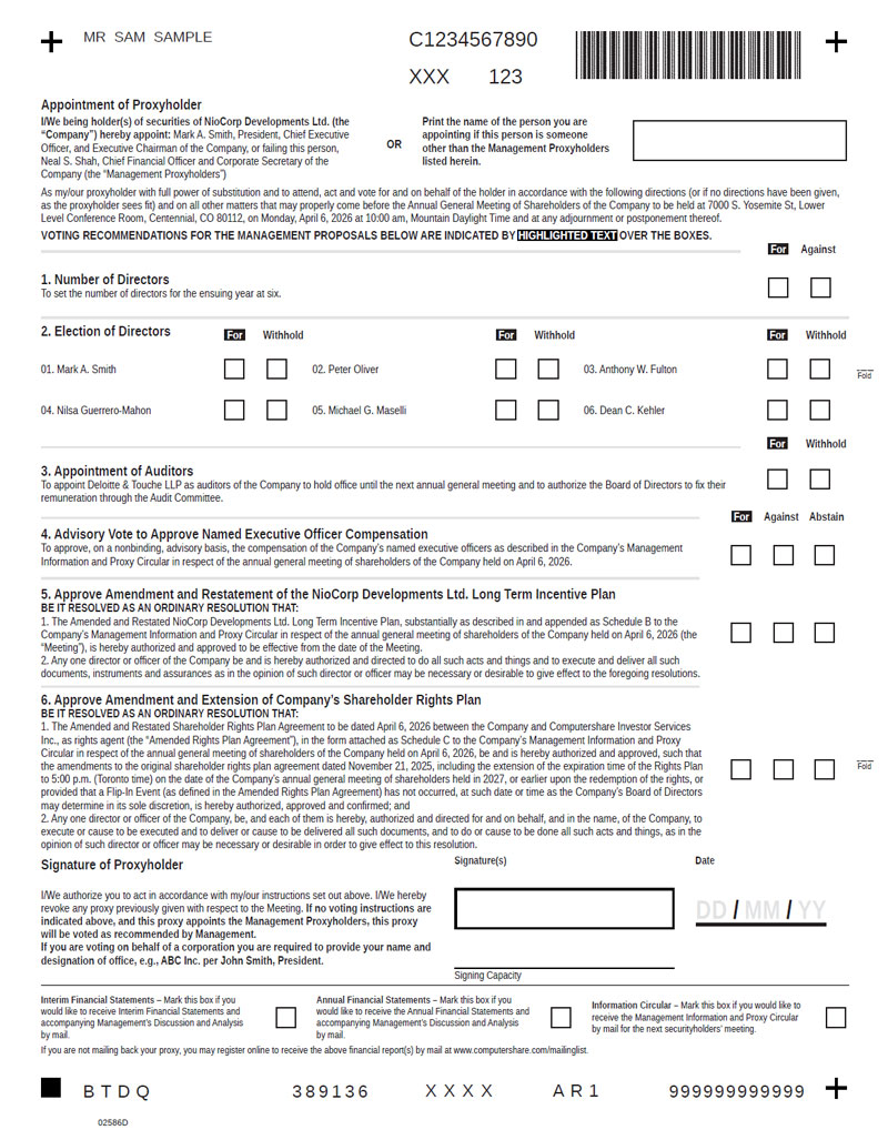 这证明______或登记转让人是上述权利数量的登记持有人,每一项权利均赋予其登记持有人权利,但须遵守日期为2026年4月6日的经修订和重述的股东权利计划协议(修订和重述原日期为2025年11月21日的股东权利计划协议)的条款、规定和条件,因为这些条款、规定和条件可能会不时修订或补充,NioCorp Developments Ltd.之间的《股东权利协议》(“股东权利协议”),根据不列颠哥伦比亚省法律成立的公司(“公司”)和根据加拿大法律存在的信托公司加拿大计算机股份信托公司(“权利代理人”)(该术语应包括股东权利协议下的任何继承权利代理人),在分立时间之后(如股东权利协议中定义的该术语)和到期时间(如股东权利协议中定义的该术语)之前的任何时间向公司购买,一股按下文所述行权价缴足的公司普通股(“普通股”),在出示并交回本权利证书后,连同正式签立并提交给权利代理人的行使选择表格(以下提供的表格),连同在多伦多任何城市的权利代理人主要办事处以经认证的支票、银行汇票或应付给公司的汇票支付行权价。直至在股东权利协议规定的某些事件中对其进行调整,行权价格应为: