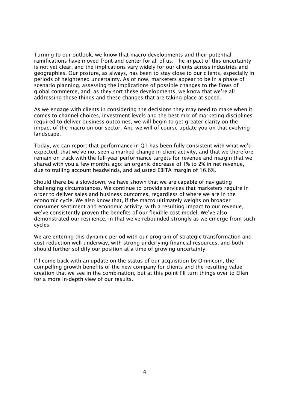 4谈到我们的前景,我们知道宏观发展及其潜在影响已经转移到我们所有人的前沿和中心。这种不确定性的影响尚不清楚,对我们不同行业和地区的客户的影响差异很大。与往常一样,我们的姿态一直是与客户保持密切联系,尤其是在不确定性加剧的时期。截至目前,营销人员似乎正处于情景规划阶段,评估可能的变化对全球商业流动的影响,当他们对这些发展进行排序时,我们知道我们都在处理这些事情以及正在迅速发生的这些变化。随着我们与客户接触,考虑他们在渠道选择、投资水平和交付业务成果所需的最佳营销纪律组合方面可能需要做出的决定,我们将开始更清楚地了解宏观经济对我们行业的影响。我们当然会向您介绍不断变化的情况。今天,我们可以报告,第一季度的业绩与我们的预期完全一致,我们没有看到客户活动发生显着变化,因此,我们与几个月前与大家分享的收入和利润率的全年业绩目标保持在正轨上:由于尾随账户逆风,净收入有机下降1%至2%,调整后的EBITA利润率为16.6%。如果出现放缓,我们已经证明我们有能力在充满挑战的情况下航行。我们继续提供营销人员所需的服务,以实现销售和业务成果,无论我们处于经济周期的哪个阶段。我们还知道,如果宏观经济最终对更广泛的消费者情绪和经济活动造成压力,从而对我们的收入产生影响,我们一直在证明我们灵活的成本模型的好处。我们还展示了我们的韧性,因为当我们走出这样的周期时,我们已经强劲反弹。我们正在进入这个充满活力的时期,我们的战略转型和降低成本的计划正在顺利进行,拥有强大的基础财务资源,在不确定性日益增加的时候,两者都应该进一步巩固我们的地位。我会回来更新我们被Omnicom收购的状态,新公司为客户带来的引人注目的增长收益,以及我们在组合中看到的由此产生的价值创造,但在这一点上,我将把事情交给Ellen,让他们更深入地了解我们的结果。
