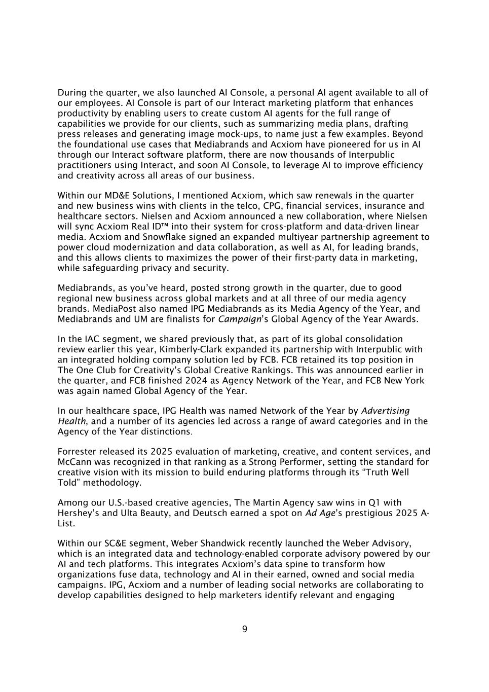 9在本季度,我们还推出了AI Console,这是一个可供所有员工使用的个人AI代理。AI Console是我们Interact营销平台的一部分,该平台通过使用户能够为我们为客户提供的全方位能力创建定制AI代理来提高生产力,例如汇总媒体计划、起草新闻稿和生成图像模型,仅举几个例子。除了Mediabrands和Acxiom通过我们的Interact软件平台为我们在AI领域开创的基础用例之外,现在还有数千名Interpublic从业者使用Interact,以及即将推出的AI Console,以利用AI来提高我们业务所有领域的效率和创造力。在我们的MD & E解决方案中,我提到了Acxiom,它在本季度看到了续订,并与电信、CPG、金融服务、保险和医疗保健领域的客户赢得了新业务。尼尔森与Acxiom宣布新合作,尼尔森将在其中同步Acxiom Real ID™进入他们的系统,用于跨平台和数据驱动的线性媒体。安客诚与Snowflake签署了一项扩大的多年合作伙伴协议,为领先品牌的云现代化和数据协作以及人工智能提供支持,这使客户能够在营销中最大限度地利用其第一方数据的力量,同时保护隐私和安全。正如你所听到的,Mediabrands在本季度实现了强劲增长,这要归功于全球市场和我们所有三个媒体代理品牌的良好区域新业务。MediaPost还将IPG Mediabrands评为其年度媒体代理机构,Mediabrands和UM入围Campaign的年度全球代理机构奖。在IAC部分,我们之前分享过,作为今年早些时候全球合并审查的一部分,金佰利通过以FCB为首的综合控股公司解决方案扩大了与InterPublic的合作伙伴关系。FCB在Creativity的全球创意排名The One俱乐部中保持了第一的位置。这是在本季度早些时候宣布的,FCB在2024年成为年度代理网络,FCB New York再次被评为年度全球代理。在我们的医疗保健领域,IPG Health被Advertising Health评为年度最佳网络,其多家代理机构在一系列奖项类别中领先,并在年度最佳代理机构中脱颖而出。Forrester发布了对营销、创意和内容服务的2025年评估,麦肯在该排名中被公认为表现出色,为创意愿景设定了标准,其使命是通过其“Truth well told”方法构建持久的平台。在我们位于美国的创意机构中,Martin Agency凭借Hershey’s和犹他美容在第一季度大获成功,Deutsch在Ad Age享有盛誉的2025年A-List上获得一席之地。在我们的SC & E部门中,Weber Shandwick最近推出了Weber Advisory,这是一个由我们的人工智能和技术平台提供支持的综合数据和技术支持的企业咨询。这整合了安客诚的数据脊椎,以改变组织如何在其获得的、拥有的和社交媒体活动中融合数据、技术和人工智能。IPG、安客诚和一些领先的社交网络正在合作开发旨在帮助营销人员识别相关和引人入胜的能力